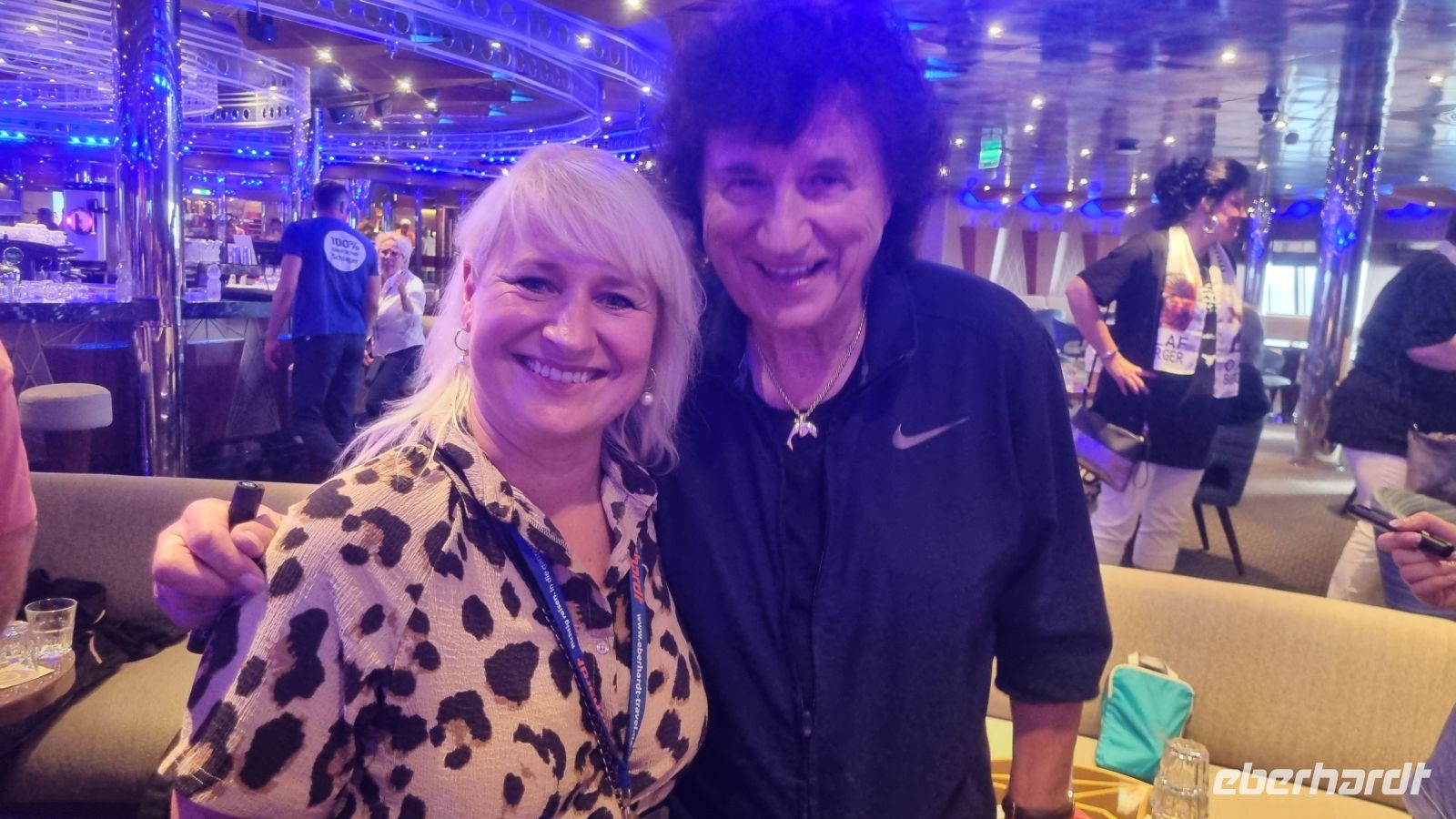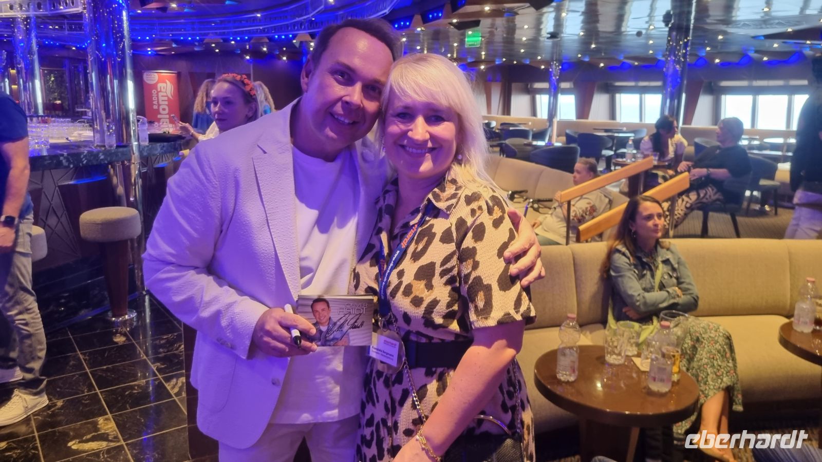Zurück an Bord nutzten wir die Zeit auf See, um zum Beispiel im Bordshop zu stöbern – und trafen dabei zufällig Nick P., der sich Zeit für ein Foto nahm. Am Abend erwartete uns ein köstliches Abendessen im Restaurant, bevor es ins Theater ging: Francine Jordi und Michael Hirte sorgten dort mit ihrer Musik für eine tolle Atmosphäre. Francine begeisterte mit ihrer fröhlichen Art und ihrer klaren Stimme, während Michael Hirte mit seiner Mundharmonika für gefühlvolle Töne sorgte.