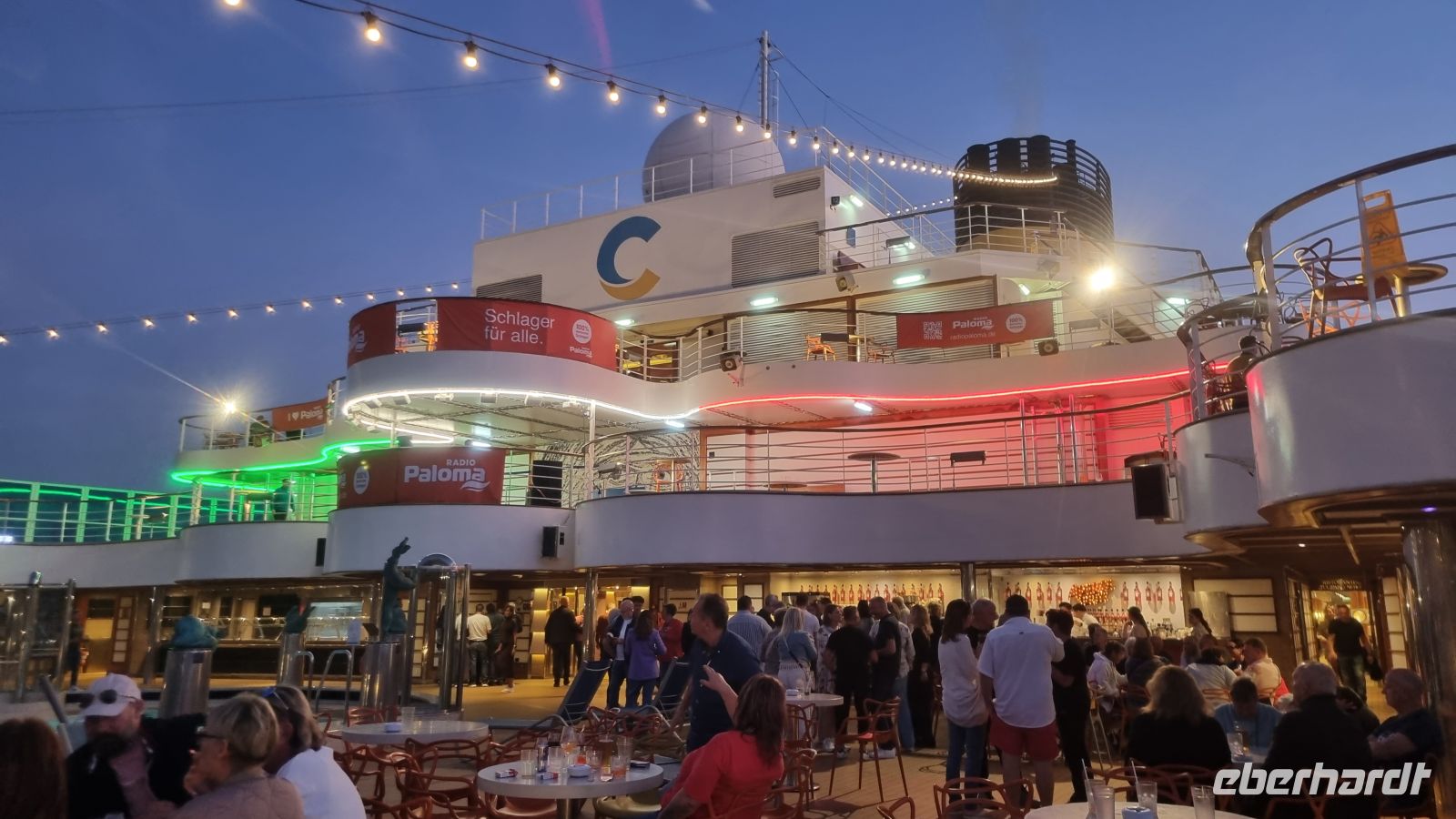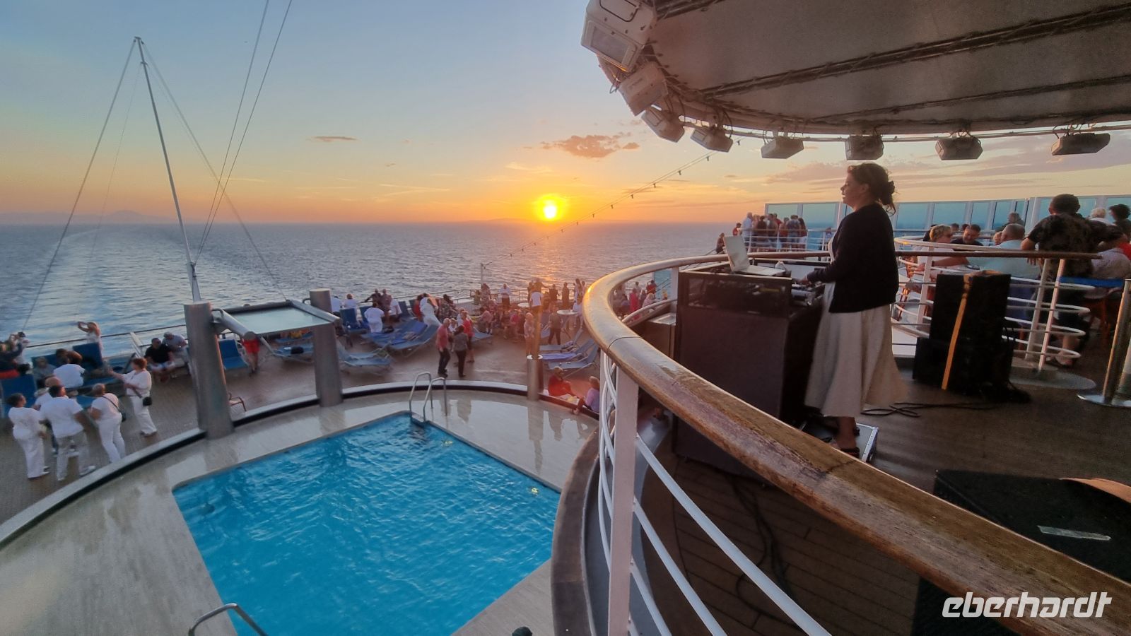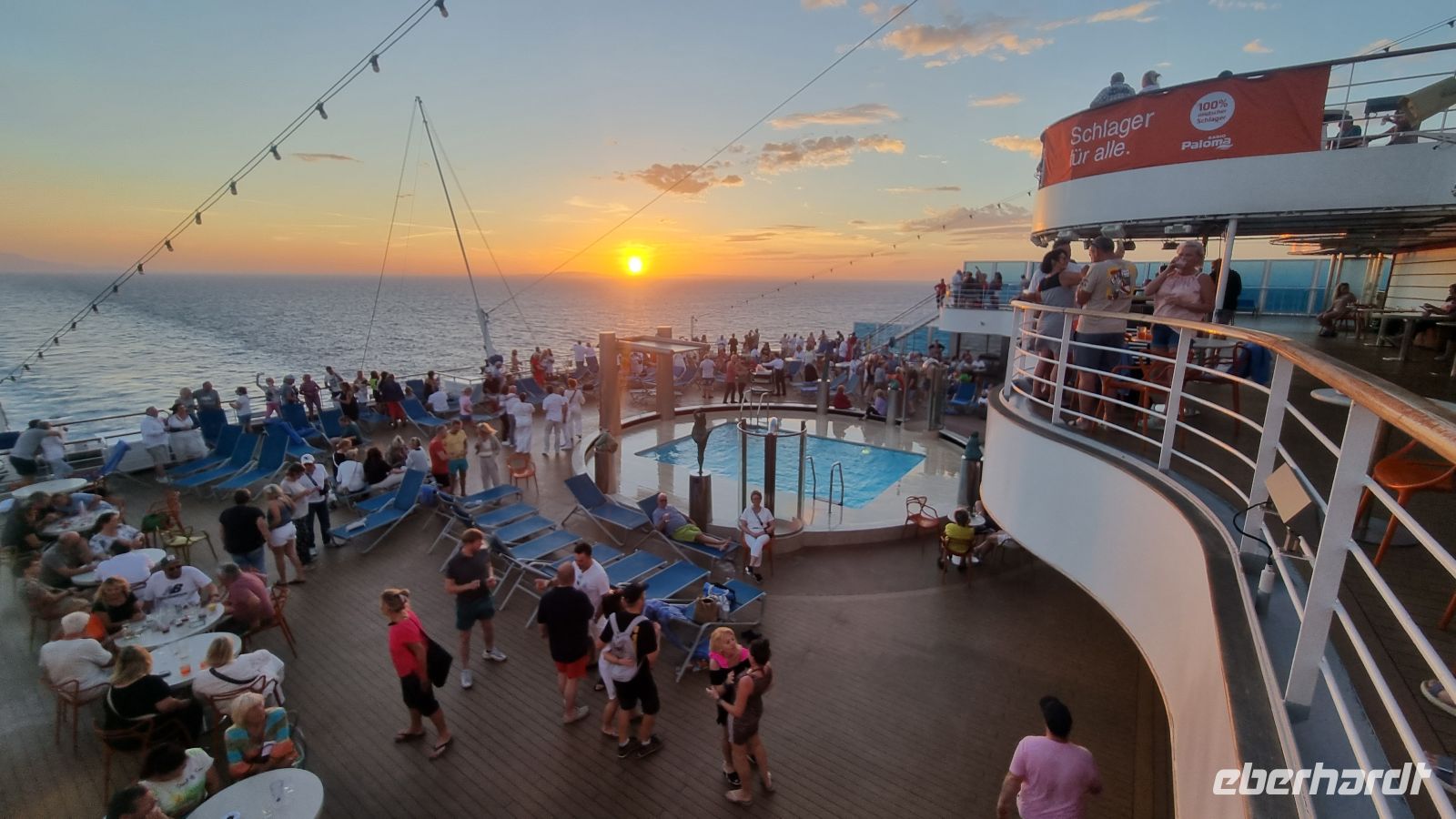 Am Nachmittag hieß es wieder alle an Bord, und beim Auslaufen herrschte auf Deck 9 an der Aperol Bar beste Stimmung – begleitet von einem bunten Schlagermix und der warmen Mittelmeerbrise.