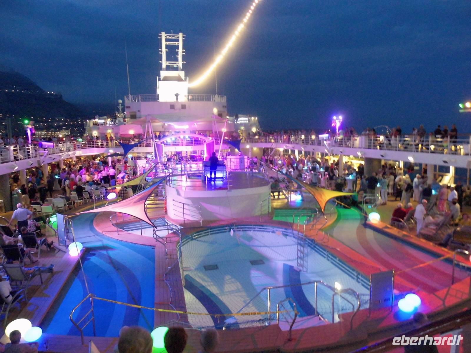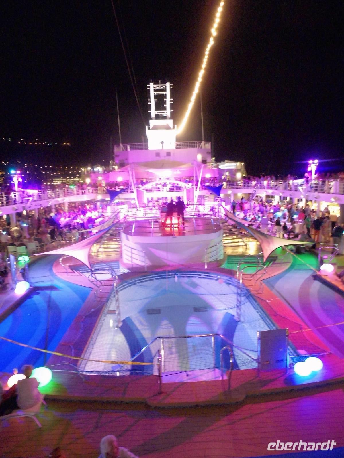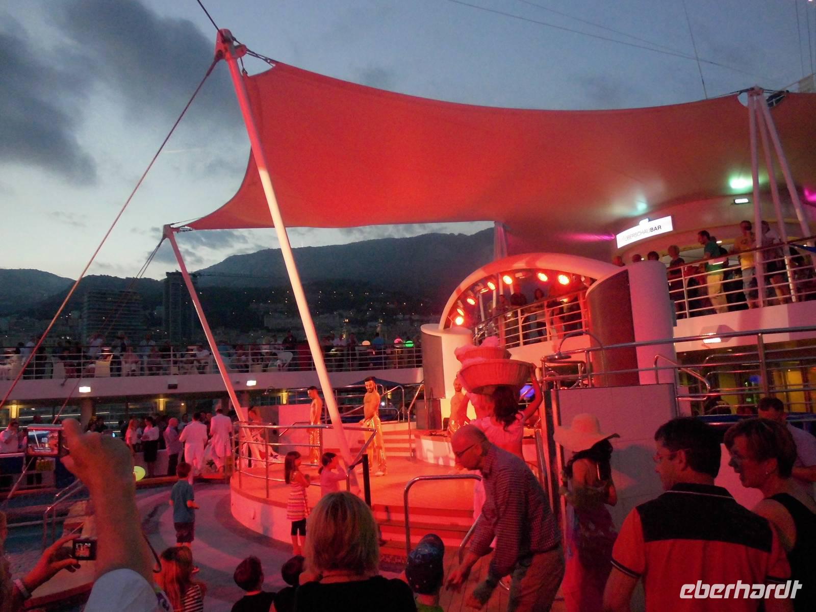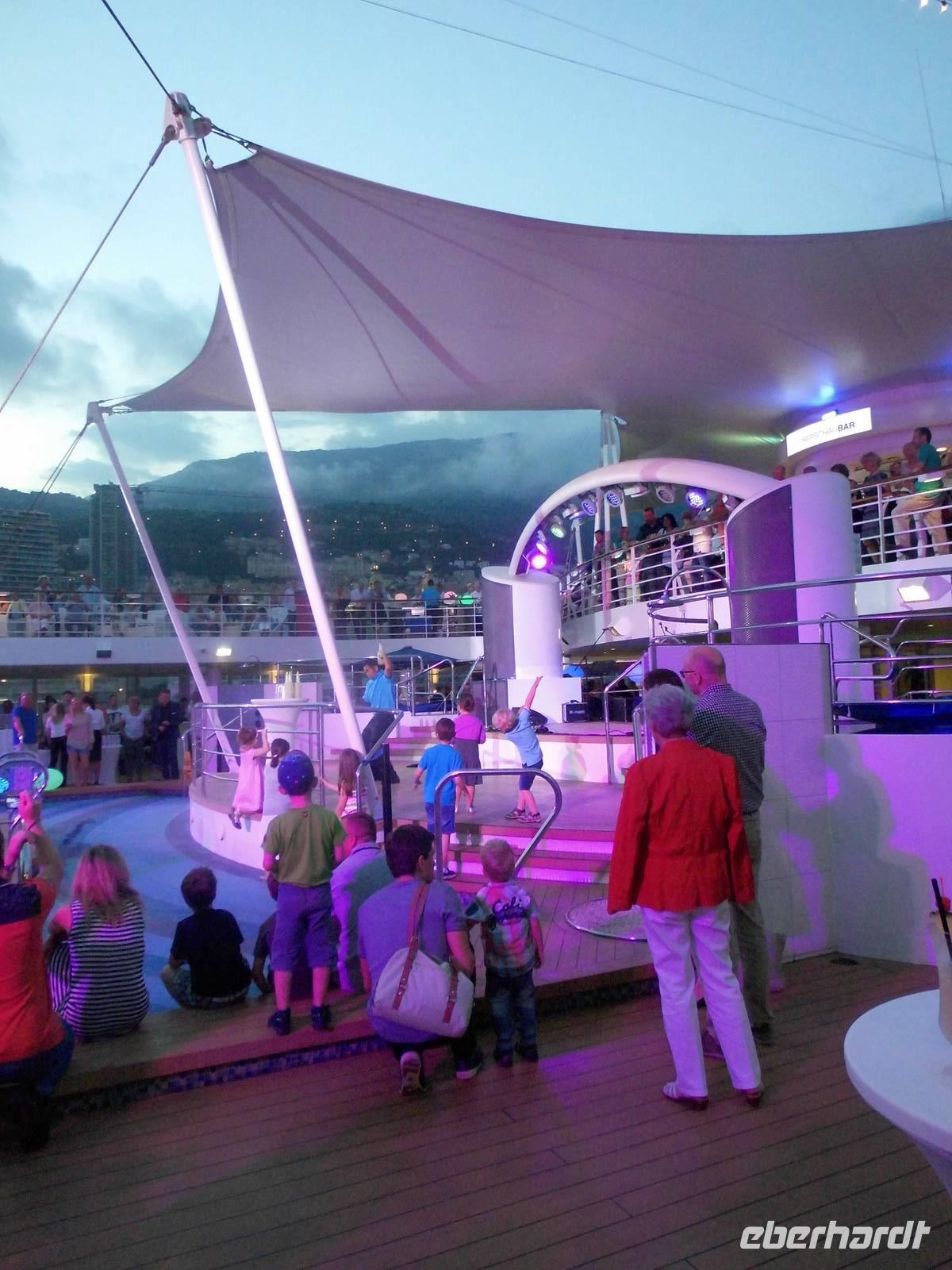 Zurück auf dem Schiff, gab es nach dem Abendessen eine Party auf dem Pooldeck. Zu stimmungsvoller Musik, tranken wir leckere Cocktails und naschten in Schokolade getauchte Früchte. Zur Ausfahrt aus dem Hafen von Monaco, bot uns ein wunderschöner Blick auf das beleuchtete Fürstentum.