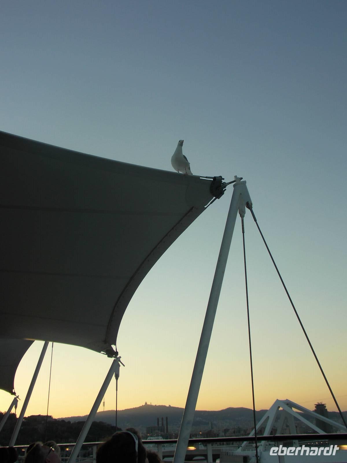 Zum Abendessen verließen wir die französische Küste. Der Kapitän meldete für den Abend und der Nacht Sturm (der Mystral) mit Windstärke 7. Schon kurz darauf spürten wir diesen merklich und aus Sicherheitsgründen wurden die Außenbereiche des Schiffes gesperrt. In der Nacht nahm der Sturm noch einmal ordentlich an Stärke zu, doch wir alle waren „Hochseetauglich".