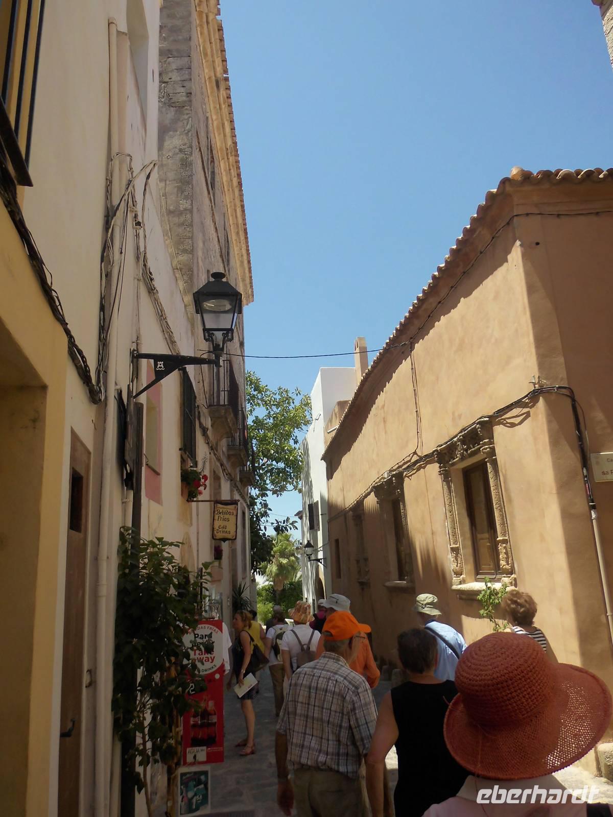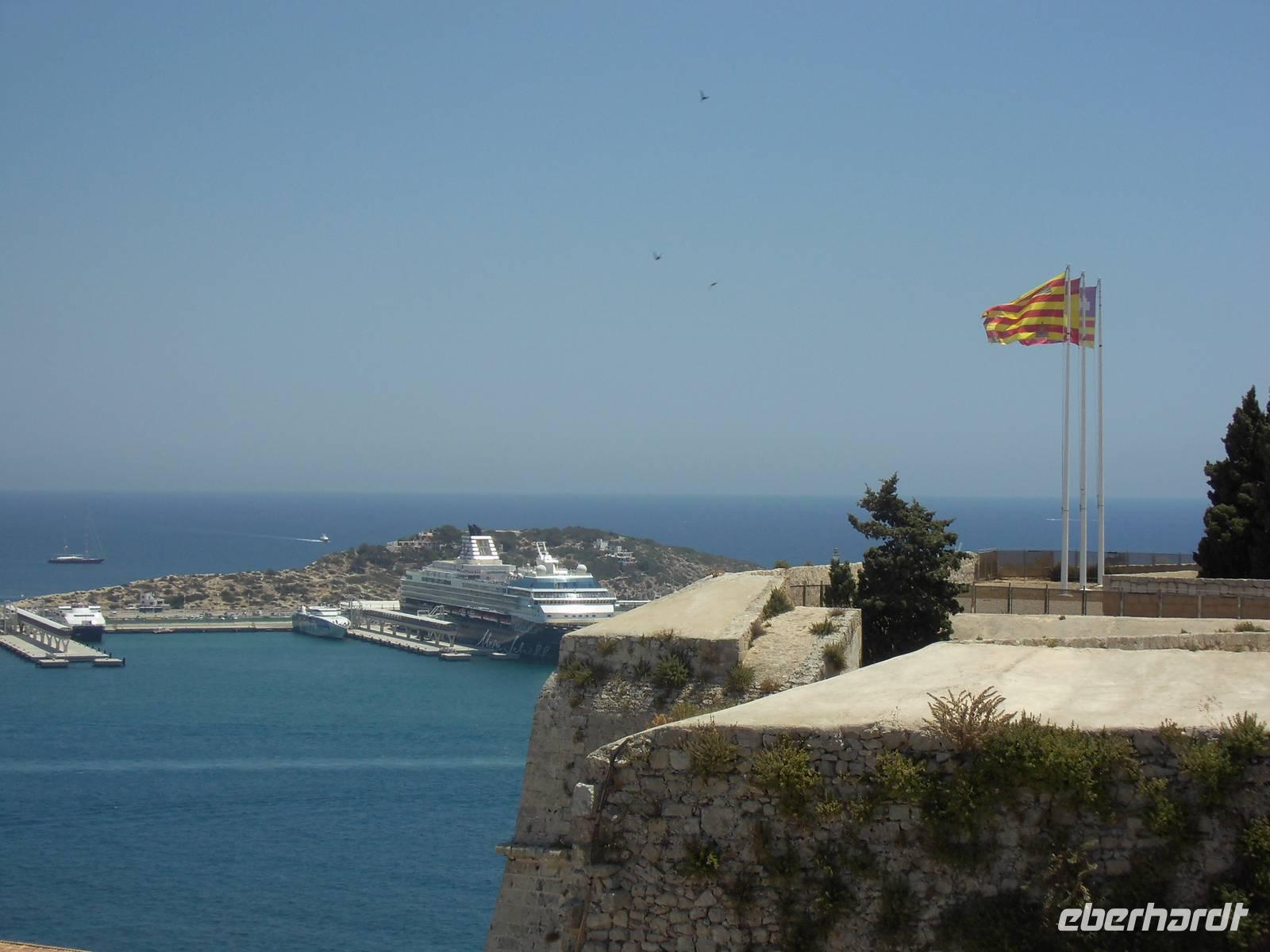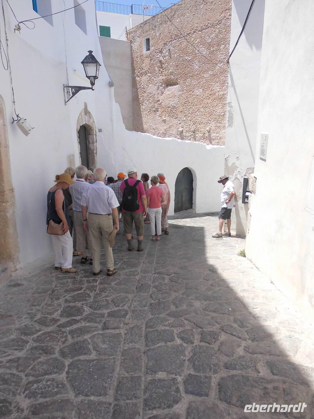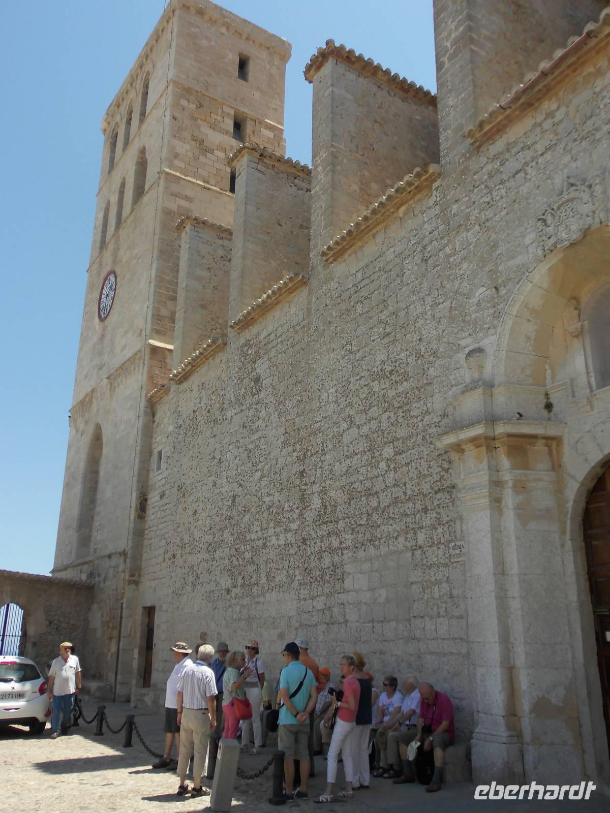 Am Vormittag erreichten wir Ibiza. Unseren letzten Ausflug dieser schönen Reise, verbrachten wir als Eberhardt Gruppe wieder gemeinsam. Die örtliche Stadtführerin Pilar und der Busfahrer Guro, standen nach dem Mittagessen uns zur Verfügung. Aus dem Hafengelände heraus, fuhren wir das für Zugvögel wichtige Feuchtgebiet in der Nähe von Ibiza Stadt entlang. Im Frühjahr und im Herbst legen die Tiere hier eine Rast ein. Langsam erreichten wir Ibiza-Stadt. Pilar erzählte uns, dass an diesem Tag eine Flower-Power-Party stattfände. Überall wurden die Straßen bunt geschmückt. Auf einer Anhöre, beginnt die Altstadt. Diese erkundeten wir zu Fuß. An der oberen Stadtmauer hatten wir einen herrlichen Blick auf die Insel mit Buchten, das Umland und den Hafen. Pilar erklärte uns die verschiedenen Aussichtspunkte. Wir entdeckten wild wachsenden Rosmarin, Kapernpflanzen und Fenchel und erfreuten uns an dessen Geruch. Die Stadtmauer ist 21 m hoch und 4 m dick, durch ein Tunnel mit 50 Stufen erreichten wir die Kathedrale. Leider wollte diese gerade schließen, doch Pilar konnte die Ordensschwester für 10 Minuten überreden und so konnten wir die Kathedrale von innen besichtigen.