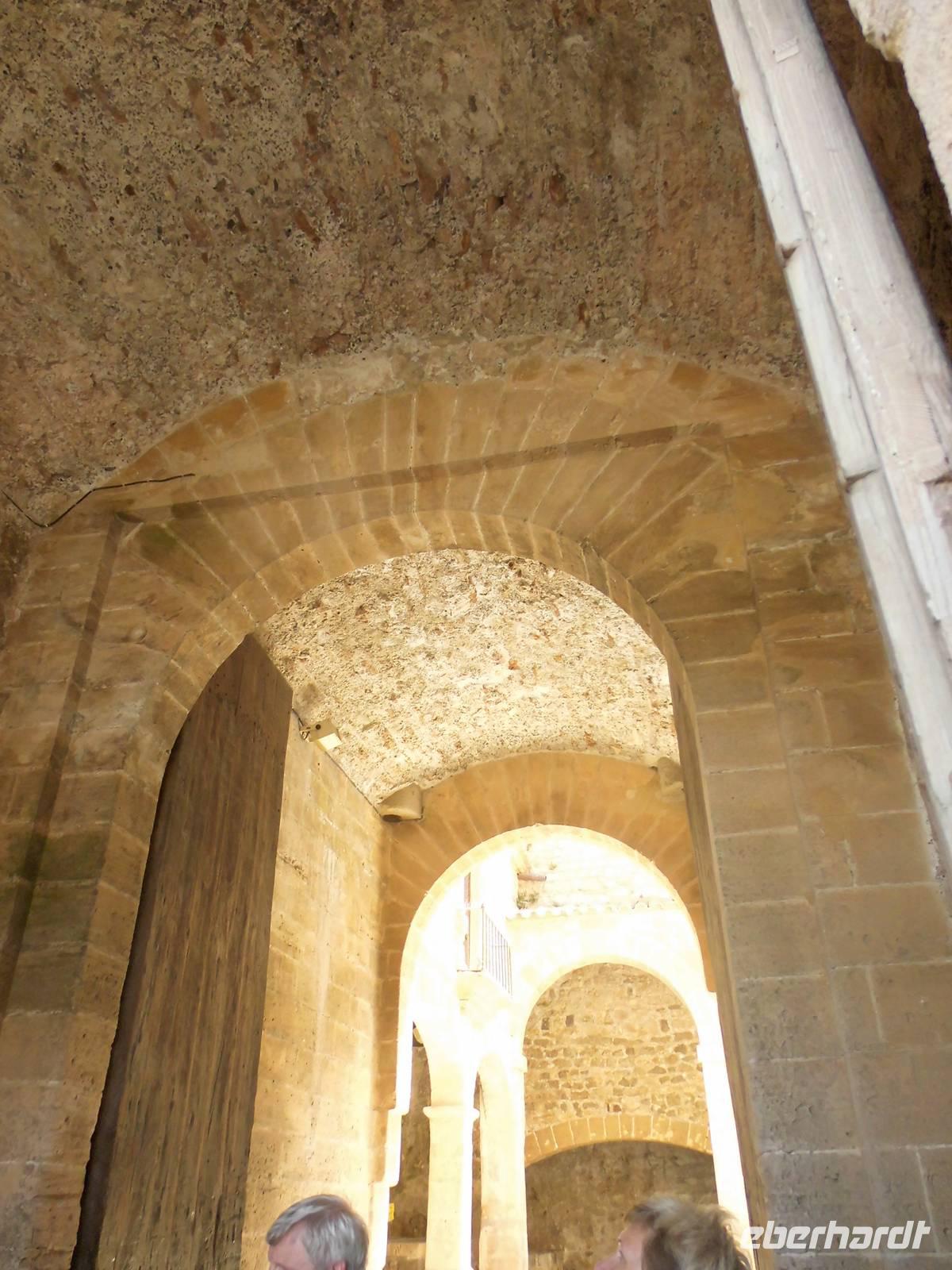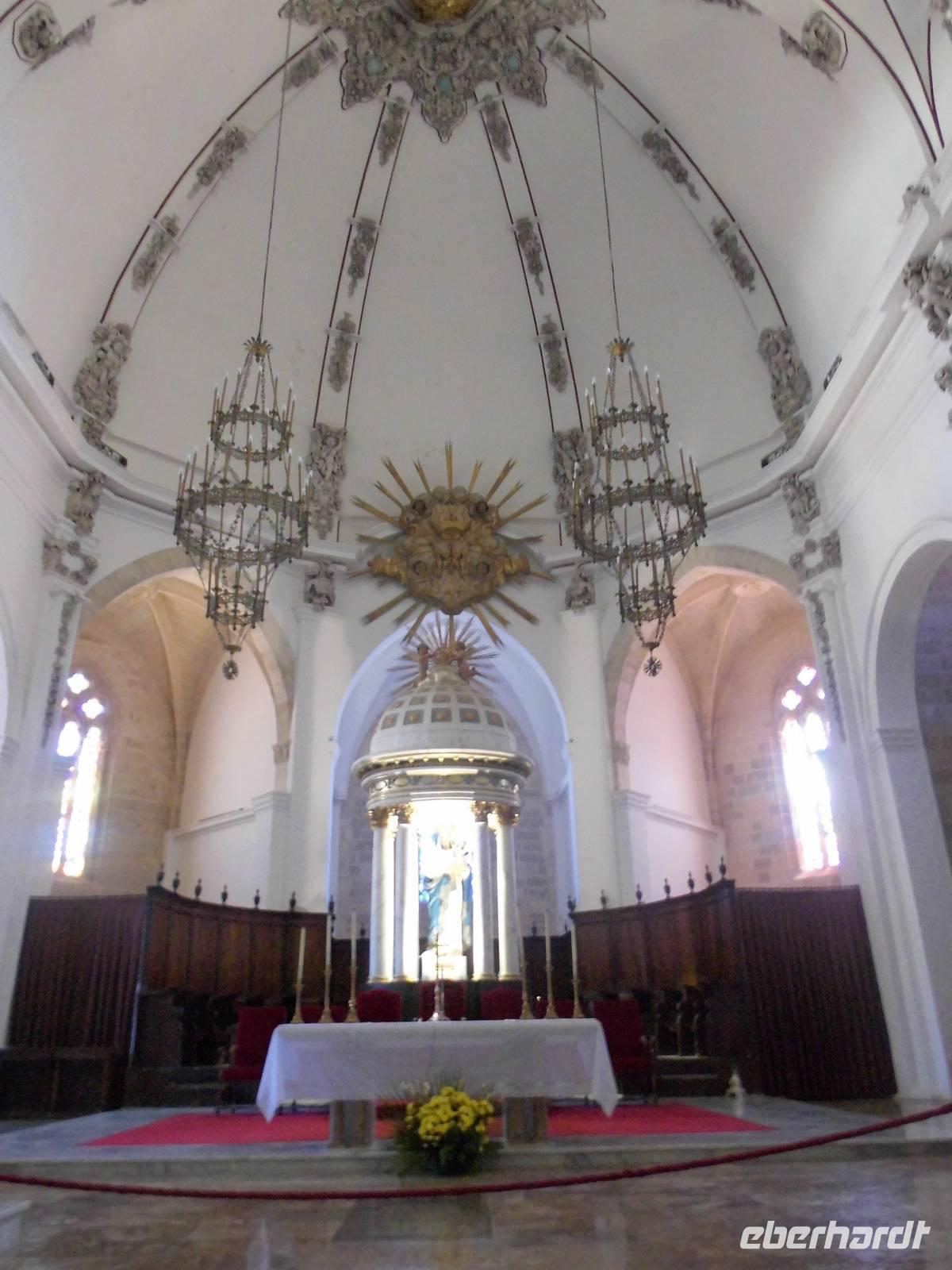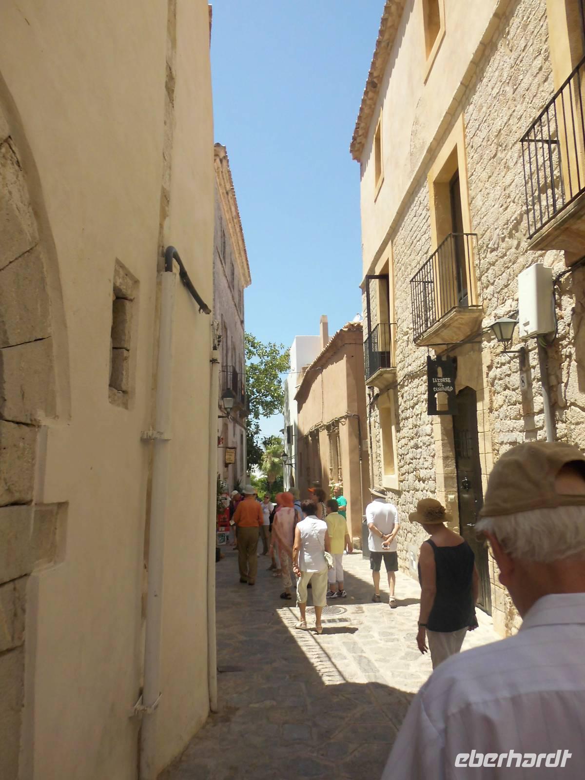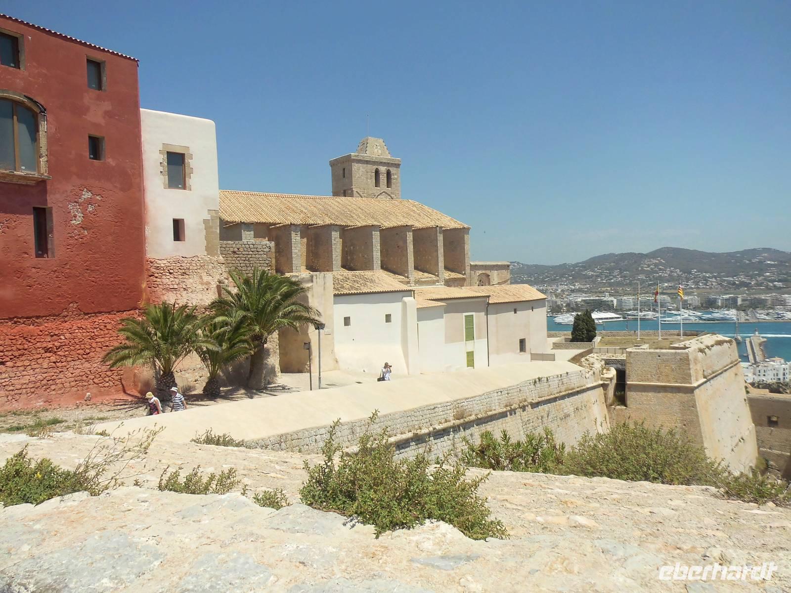 Am Vormittag erreichten wir Ibiza. Unseren letzten Ausflug dieser schönen Reise, verbrachten wir als Eberhardt Gruppe wieder gemeinsam. Die örtliche Stadtführerin Pilar und der Busfahrer Guro, standen nach dem Mittagessen uns zur Verfügung. Aus dem Hafengelände heraus, fuhren wir das für Zugvögel wichtige Feuchtgebiet in der Nähe von Ibiza Stadt entlang. Im Frühjahr und im Herbst legen die Tiere hier eine Rast ein. Langsam erreichten wir Ibiza-Stadt. Pilar erzählte uns, dass an diesem Tag eine Flower-Power-Party stattfände. Überall wurden die Straßen bunt geschmückt. Auf einer Anhöre, beginnt die Altstadt. Diese erkundeten wir zu Fuß. An der oberen Stadtmauer hatten wir einen herrlichen Blick auf die Insel mit Buchten, das Umland und den Hafen. Pilar erklärte uns die verschiedenen Aussichtspunkte. Wir entdeckten wild wachsenden Rosmarin, Kapernpflanzen und Fenchel und erfreuten uns an dessen Geruch. Die Stadtmauer ist 21 m hoch und 4 m dick, durch ein Tunnel mit 50 Stufen erreichten wir die Kathedrale. Leider wollte diese gerade schließen, doch Pilar konnte die Ordensschwester für 10 Minuten überreden und so konnten wir die Kathedrale von innen besichtigen.