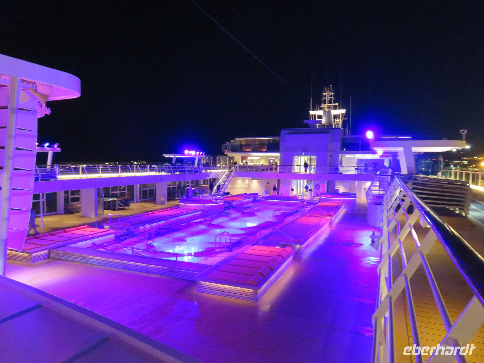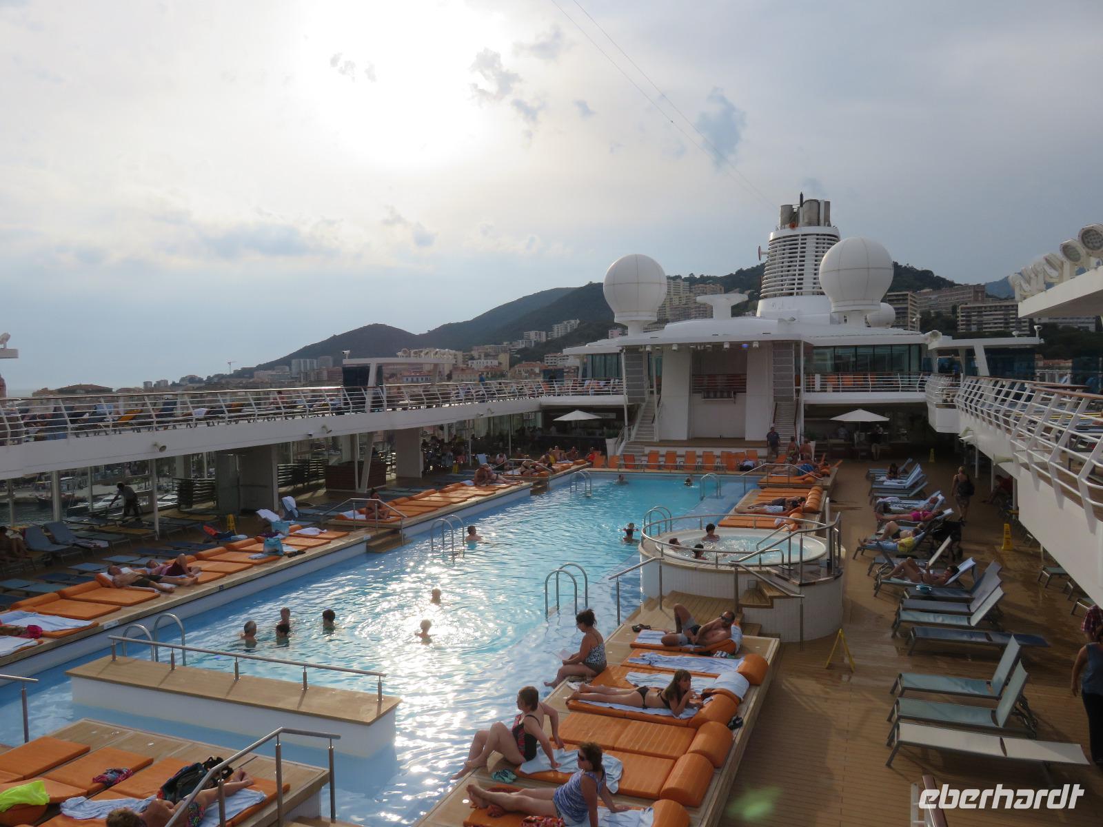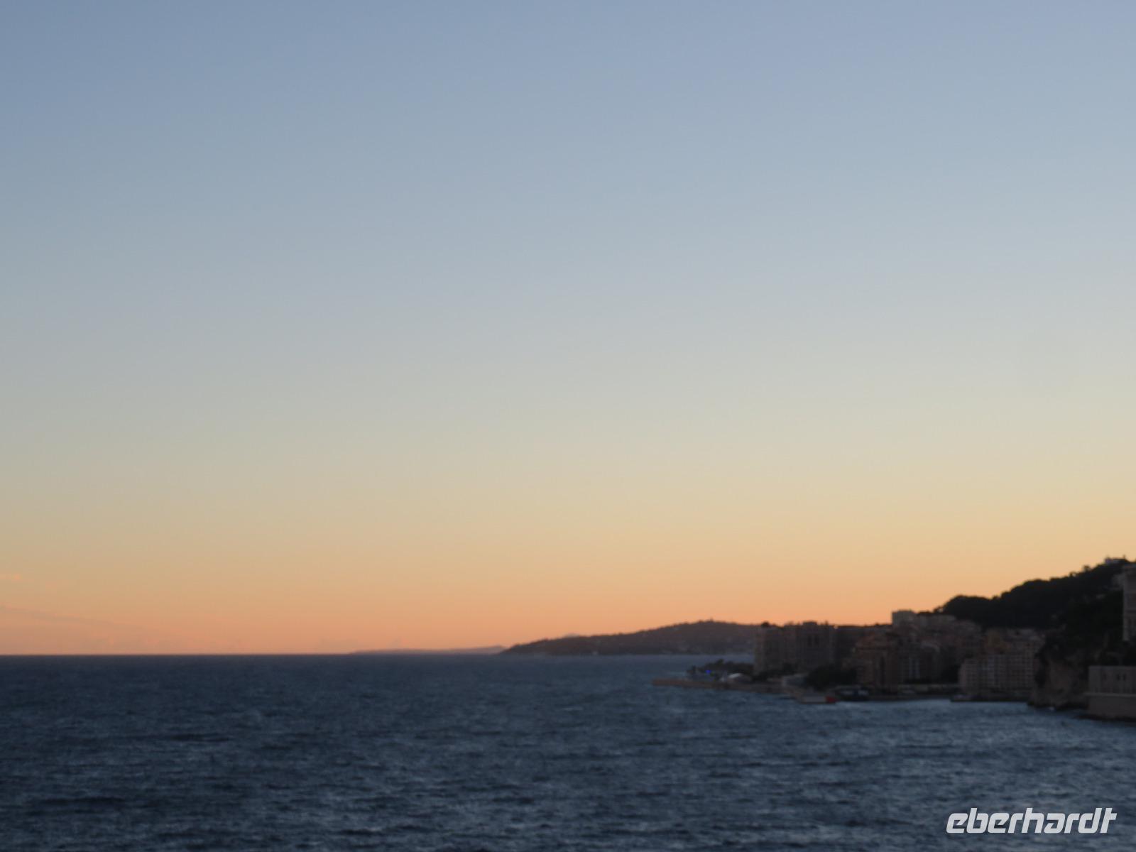 Das Auslaufen aus dem Hafen von Monaco bot uns einen wunderschönen Blick auf das kleine Fürstentum. Am Abend fand eine Party auf dem Pooldeck statt. Bei starkem Wind gab es stimmungsvolle Musik, leckere Cocktails und ein tolles Früchtebuffet und in Schokolade getauchte Früchte.