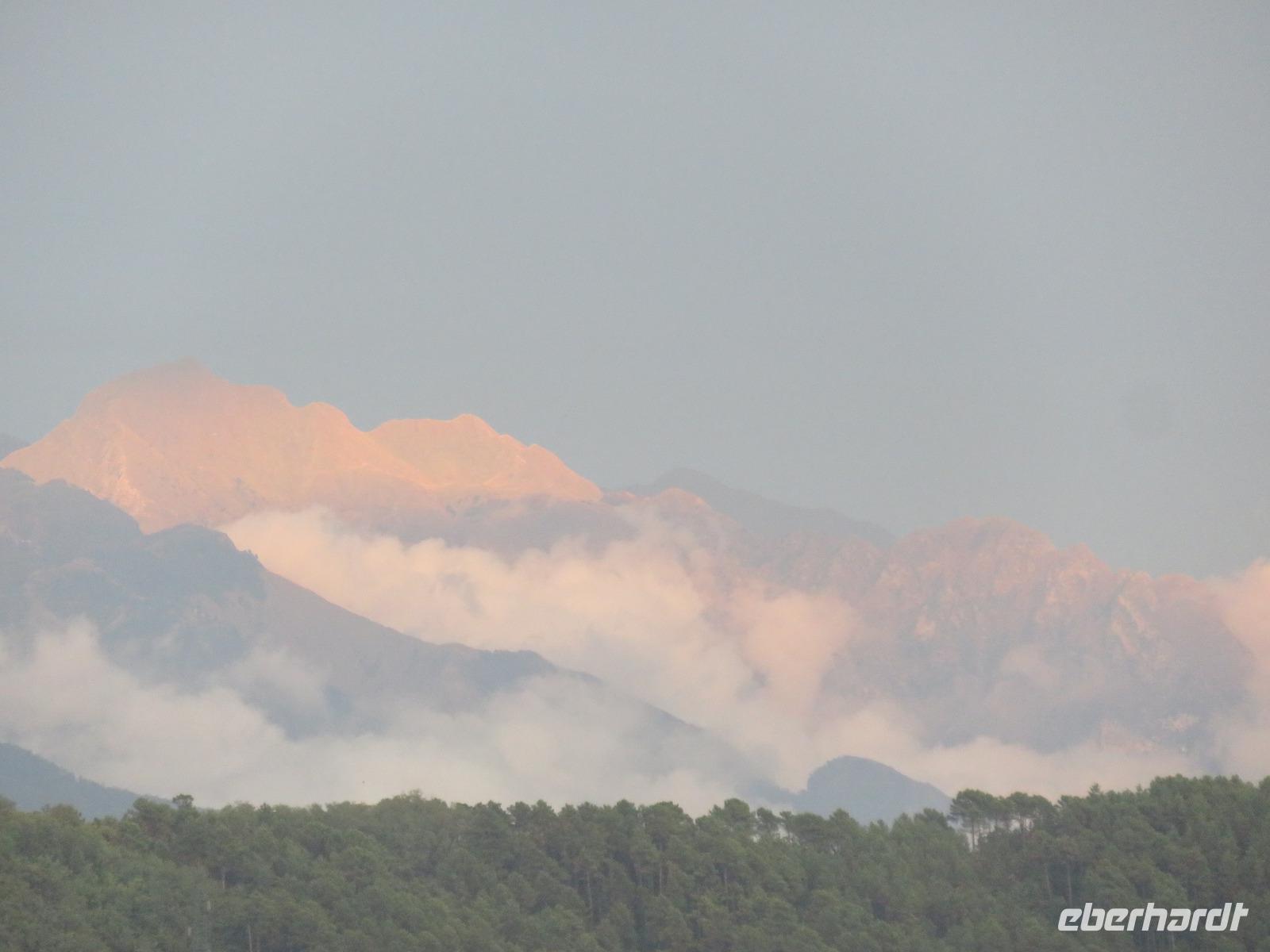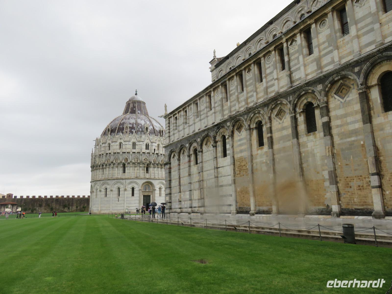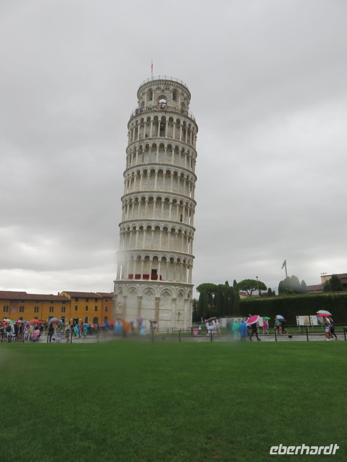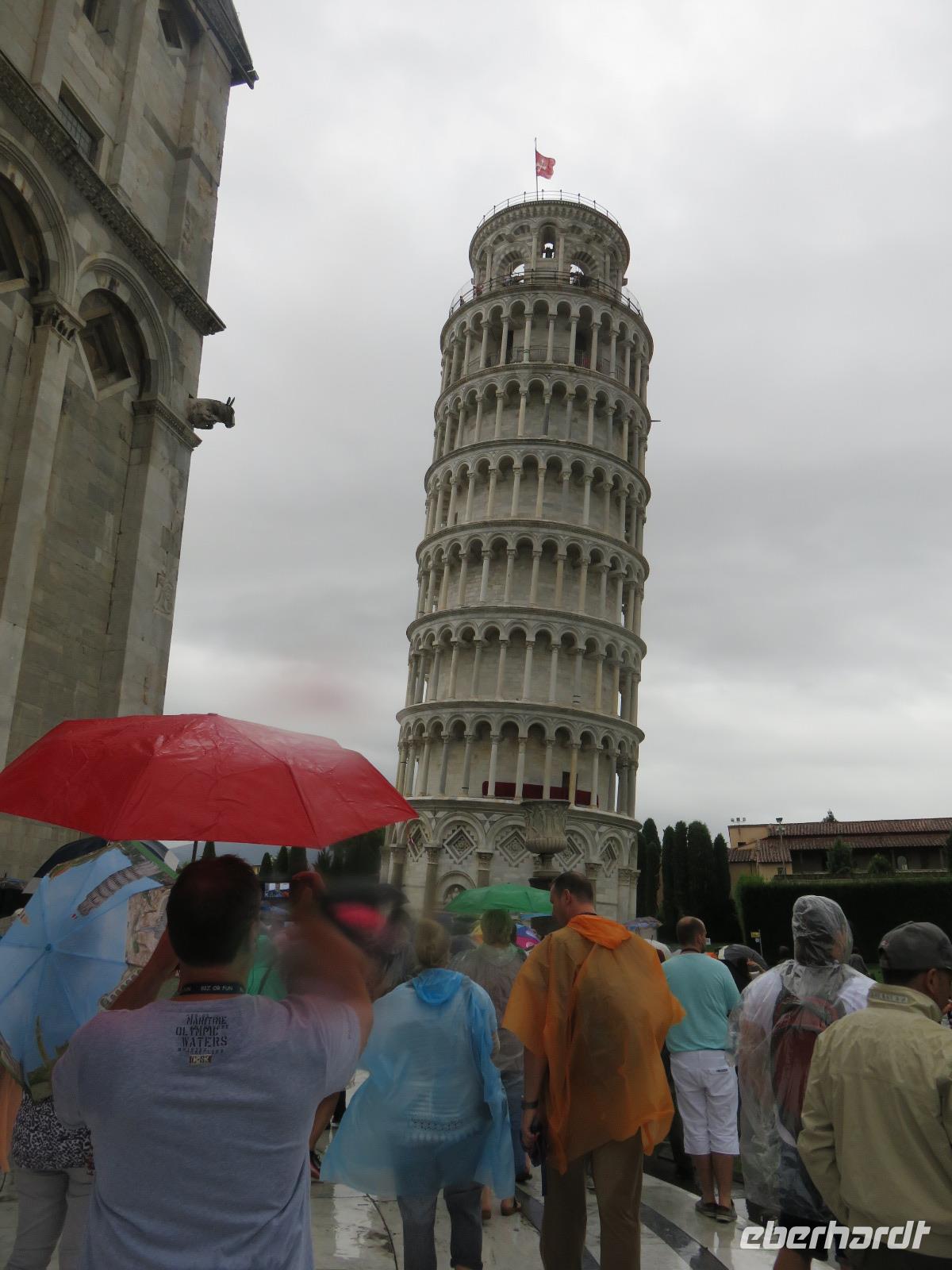 Unsere Gruppe verteilte sich zu Fahrten nach Florenz und nach Pisa. Leider meinte es Petrus heute überhaupt nicht gut mit uns. Er bescherte uns den ganzen Tag sehr ergiebige Regenschauer. Unser Ausflug nach Pisa begann mit einer ca. 1stündigen Busfahrt von der ligurischen Küste über die Autobahn in das toskanische Pisa. Während der Fahrt sahen wir Carrera und die berühmten Steinbrüche, wo der weiße Marmor bis heute abgebaut wird.