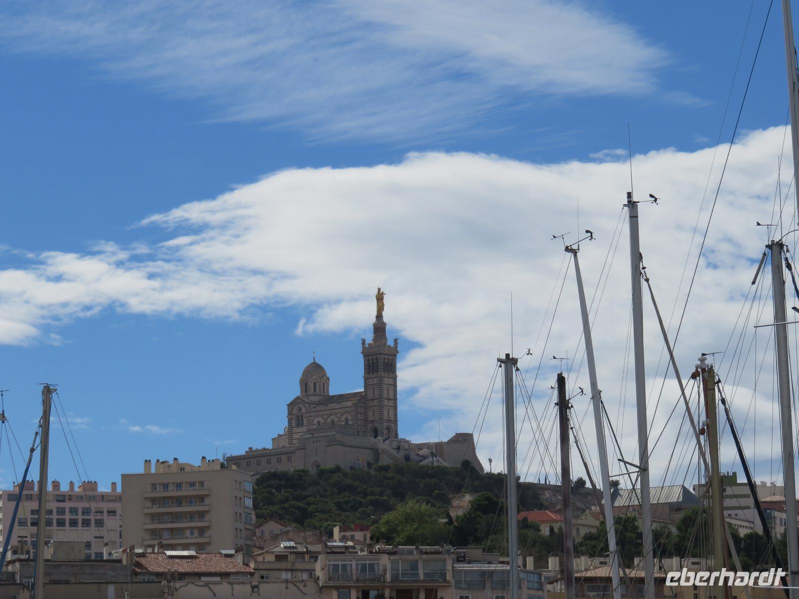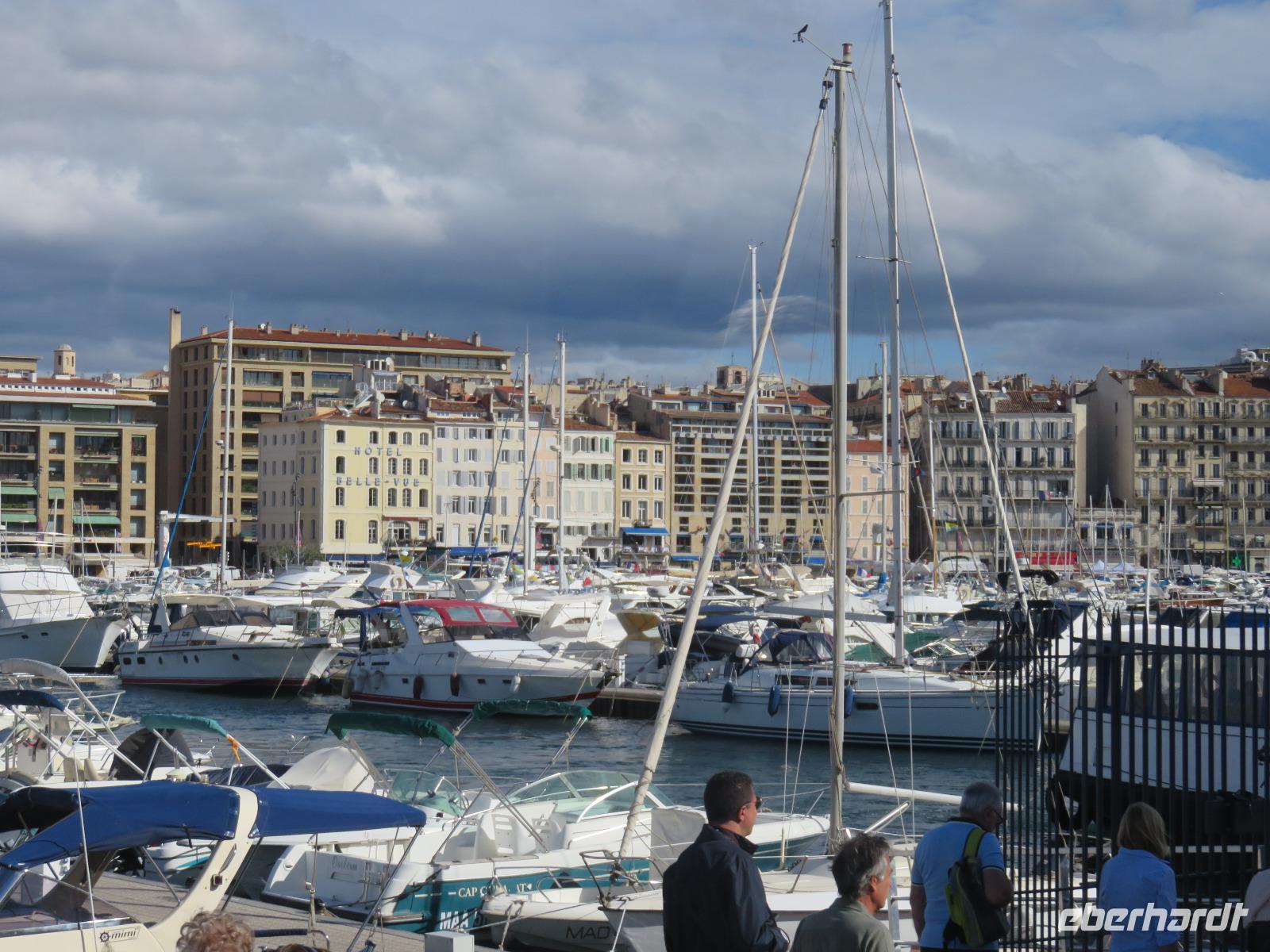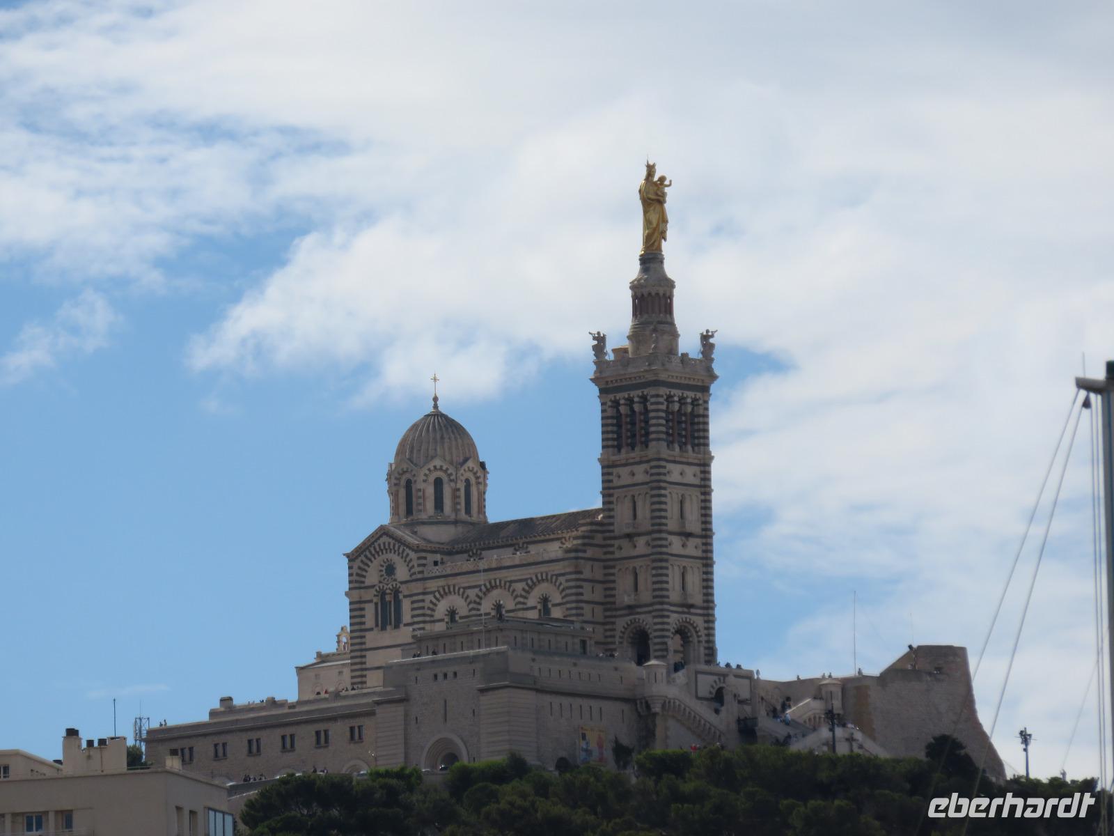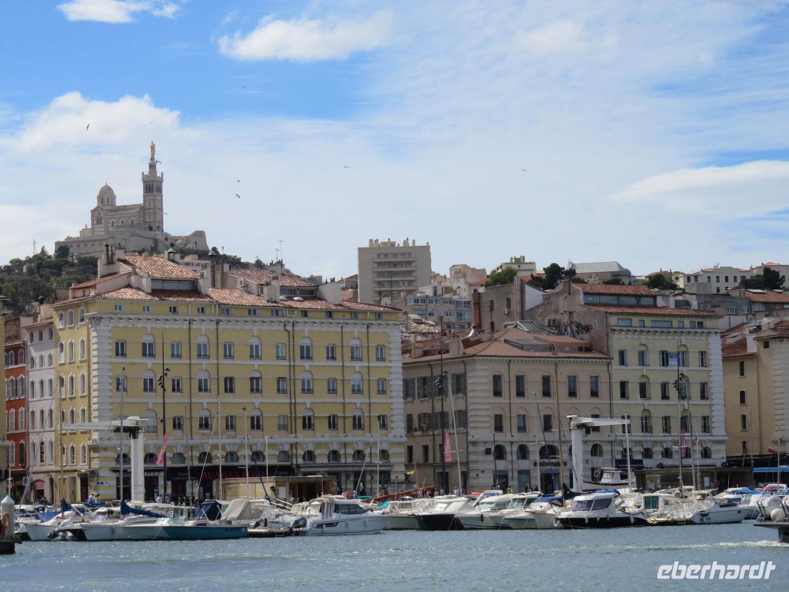 Wir hatten noch einen weiteren Tag, die Schönheiten von Südfrankreich kennen zu lernen. Der Hafen von La Seyne ist ein idealer Ausgangspunkt für die vielfältigen die Ausflüge vom Schiff. Der größte Teil unserer Gruppe hatte sich für den Ausflug nach Marseille entschieden. Zunächst fuhren wir aus La Seyne in Richtung Cassis. Der örtliche Reiseleiter Michael erzählte uns viel von der Umgebung. Die Hafenstadt La Seyne ist ein Vorort Toulon und befindet sich im Departement Var. Um nach Marseille zu kommen, fuhren wir etwa 1 Stunde mit dem Bus auf der Autobahn A50. Vorbei an Bandol, dem Weinanbaugebiet der Region und Cassis, welches für seinen Johannisbeer-Likör bekannt ist, erreichten wir Marseille. Entlang der Küstenstraße fuhren wir durch die Stadtteile am Meer mit Blick auf die Inseln Friaul und d'If mit dem gleichnamigen Château, welches bereits im 16. Jahrhundert errichtet wurde und Berühmtheit durch den Romanhelden Graf von Monte Christo erlangte. Durch die engen Gassen der Stadt ging es nun hinauf zur Kathedrale Notre-Dame de la Garde. Auf einem Hügel hoch über der Stadt thront die Kirche. Auf ihr scheint die goldene Mutter Gottes über die Stadt zu schweben. Bereits im 15.Jahrhundert wurde eine erste Kapelle auf dem Hügel zum Schutz der Seefahrer errichtet. Daher auch der Name Notre-Dame de la Garde, was so viel wie zum Schutz bedeutet. Wir waren beeindruckt von der reichen Ausstattung der Kathedrale mit wunderschönen Mosaiken und im Kirchenschiff hängenden Modellschiffen. Nun faszinierte uns noch der einmalige Panoramablick über die gesamte Stadt von den Terrassen der Kathedrale. Anschließend stiegen wir die 200 Stufen wieder hinab und mit dem Bus ging es hinunter in die Stadt. Am Hafen legten wir eine Pause ein. Wir hatten Zeit das Flair der Stadt am Sonntagvormittag in uns aufzunehmen. Wir besuchten die Galerie La Fajette und spazierten entlang des Hafenbeckens über den Kunsthandwerkermarkt. Einige Gäste besuchten das Rathaus der Stadt, welches zum Tag der offenen Tür einlud. Am Mittag fuhren wir über die Autobahn zurück nach La Seyne. Den Nachmittag nutzen wir zum Entspannen an Deck bei schönsten Sonnenschein.