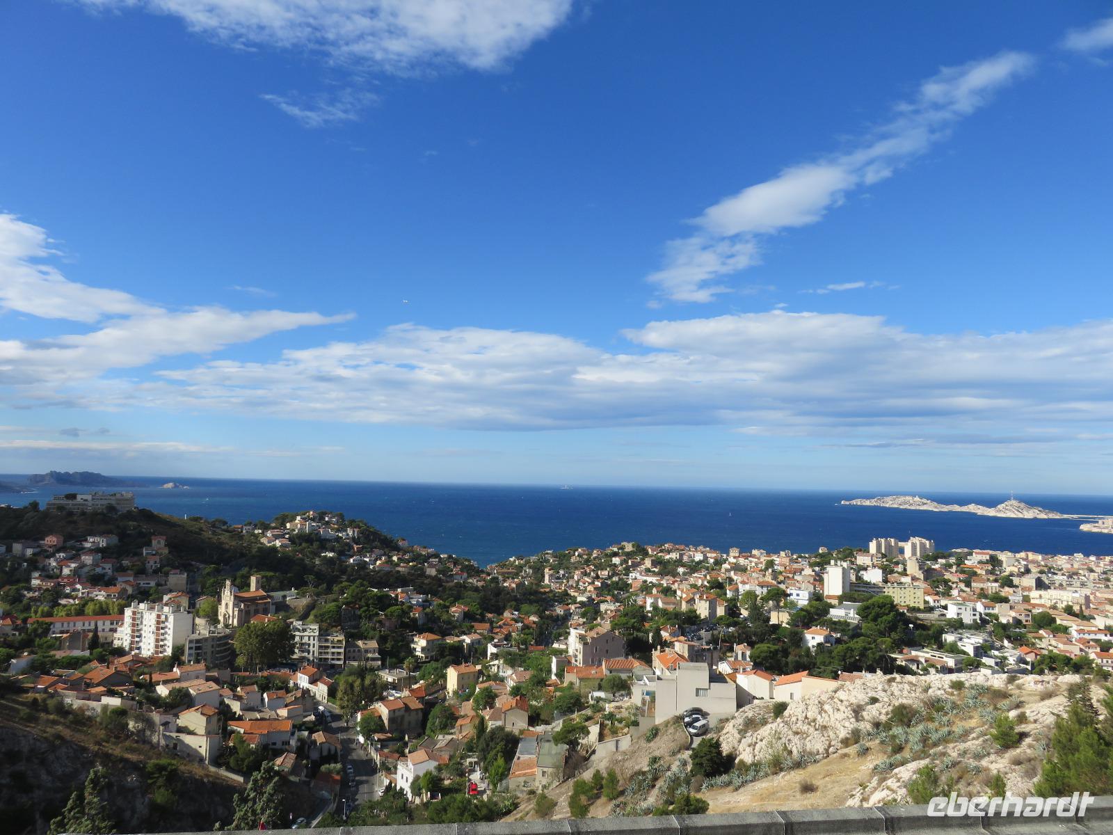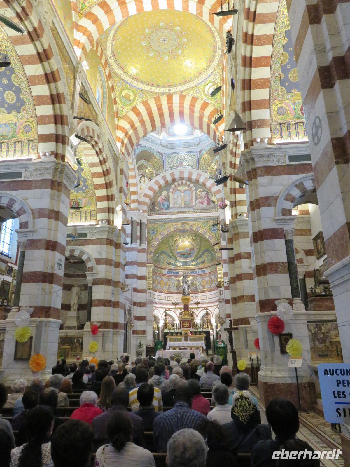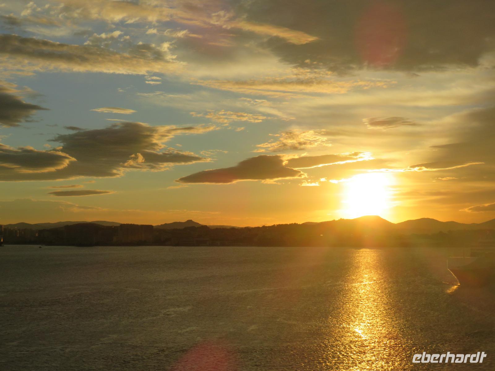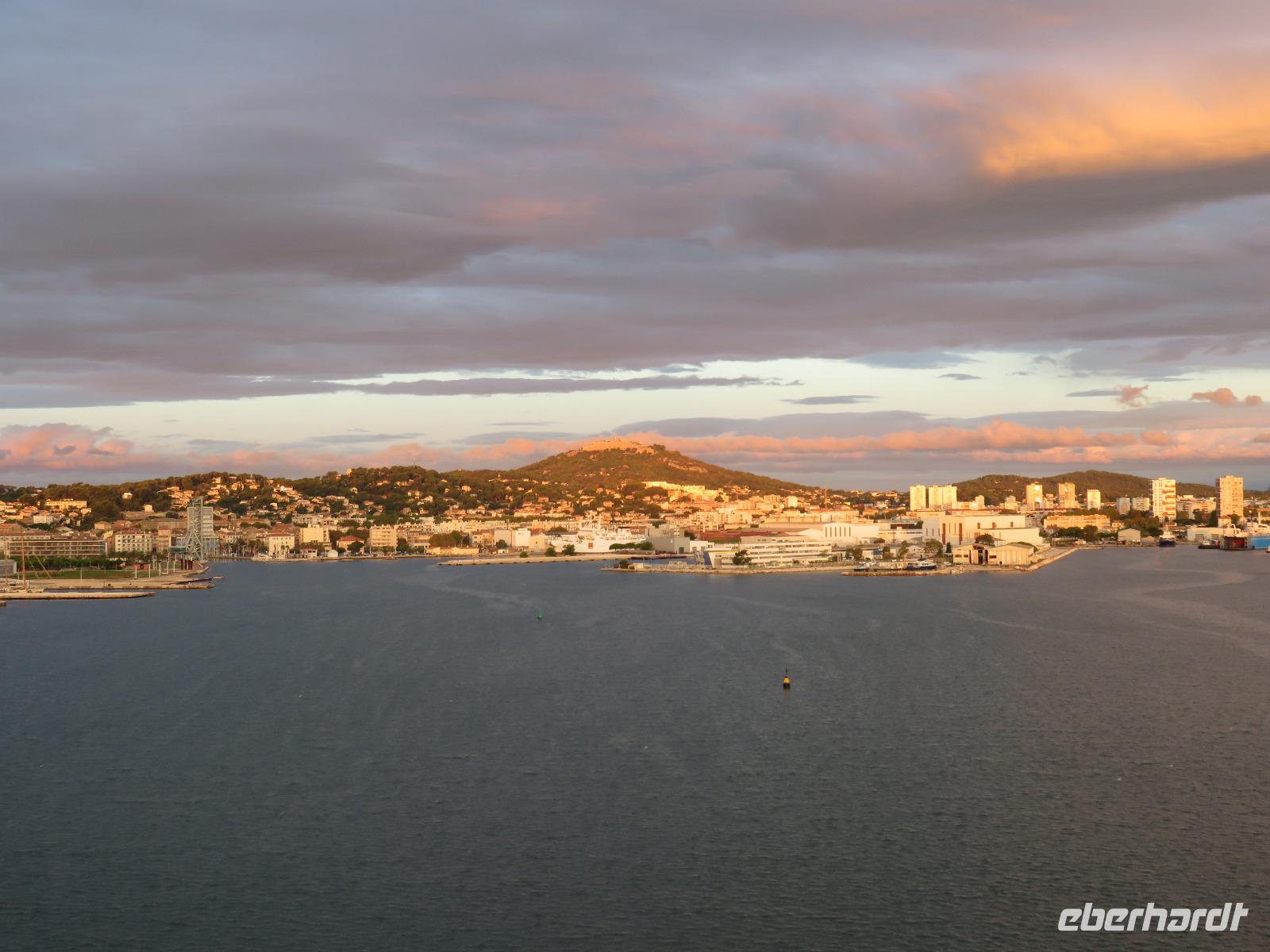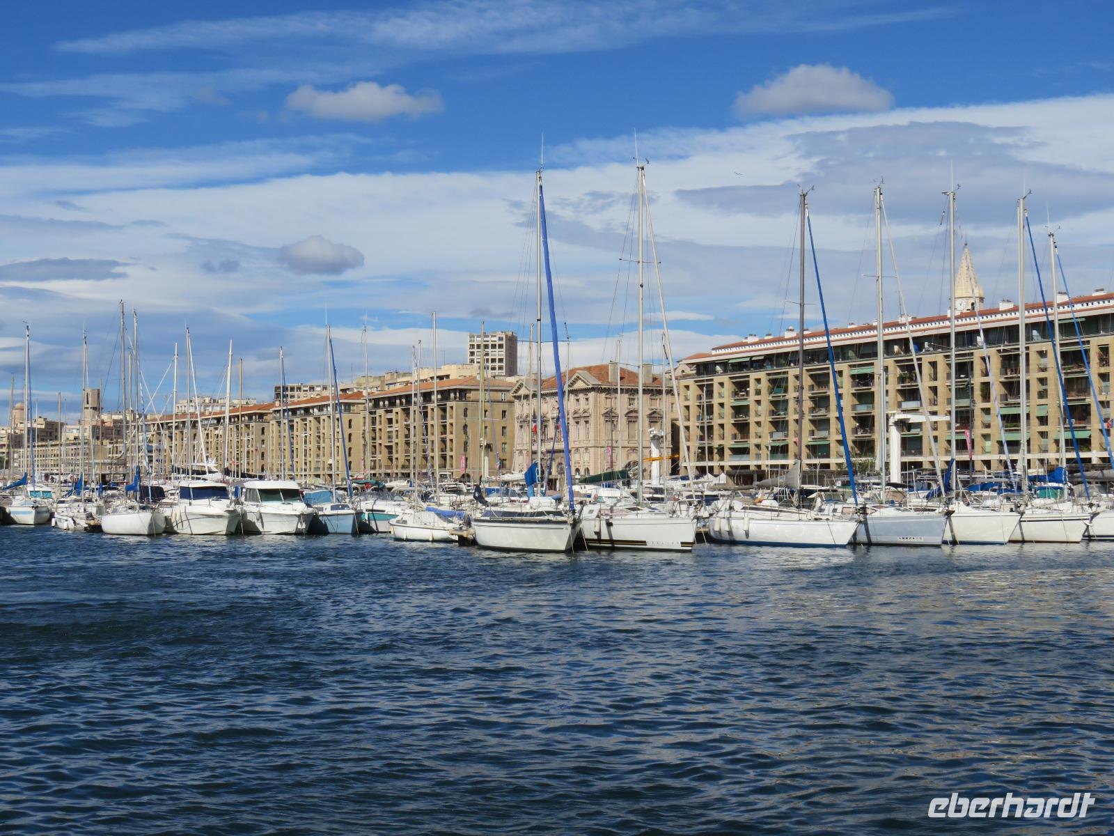 Wir hatten noch einen weiteren Tag, die Schönheiten von Südfrankreich kennen zu lernen. Der Hafen von La Seyne ist ein idealer Ausgangspunkt für die vielfältigen die Ausflüge vom Schiff. Der größte Teil unserer Gruppe hatte sich für den Ausflug nach Marseille entschieden. Zunächst fuhren wir aus La Seyne in Richtung Cassis. Der örtliche Reiseleiter Michael erzählte uns viel von der Umgebung. Die Hafenstadt La Seyne ist ein Vorort Toulon und befindet sich im Departement Var. Um nach Marseille zu kommen, fuhren wir etwa 1 Stunde mit dem Bus auf der Autobahn A50. Vorbei an Bandol, dem Weinanbaugebiet der Region und Cassis, welches für seinen Johannisbeer-Likör bekannt ist, erreichten wir Marseille. Entlang der Küstenstraße fuhren wir durch die Stadtteile am Meer mit Blick auf die Inseln Friaul und d'If mit dem gleichnamigen Château, welches bereits im 16. Jahrhundert errichtet wurde und Berühmtheit durch den Romanhelden Graf von Monte Christo erlangte. Durch die engen Gassen der Stadt ging es nun hinauf zur Kathedrale Notre-Dame de la Garde. Auf einem Hügel hoch über der Stadt thront die Kirche. Auf ihr scheint die goldene Mutter Gottes über die Stadt zu schweben. Bereits im 15.Jahrhundert wurde eine erste Kapelle auf dem Hügel zum Schutz der Seefahrer errichtet. Daher auch der Name Notre-Dame de la Garde, was so viel wie zum Schutz bedeutet. Wir waren beeindruckt von der reichen Ausstattung der Kathedrale mit wunderschönen Mosaiken und im Kirchenschiff hängenden Modellschiffen. Nun faszinierte uns noch der einmalige Panoramablick über die gesamte Stadt von den Terrassen der Kathedrale. Anschließend stiegen wir die 200 Stufen wieder hinab und mit dem Bus ging es hinunter in die Stadt. Am Hafen legten wir eine Pause ein. Wir hatten Zeit das Flair der Stadt am Sonntagvormittag in uns aufzunehmen. Wir besuchten die Galerie La Fajette und spazierten entlang des Hafenbeckens über den Kunsthandwerkermarkt. Einige Gäste besuchten das Rathaus der Stadt, welches zum Tag der offenen Tür einlud. Am Mittag fuhren wir über die Autobahn zurück nach La Seyne. Den Nachmittag nutzen wir zum Entspannen an Deck bei schönsten Sonnenschein.