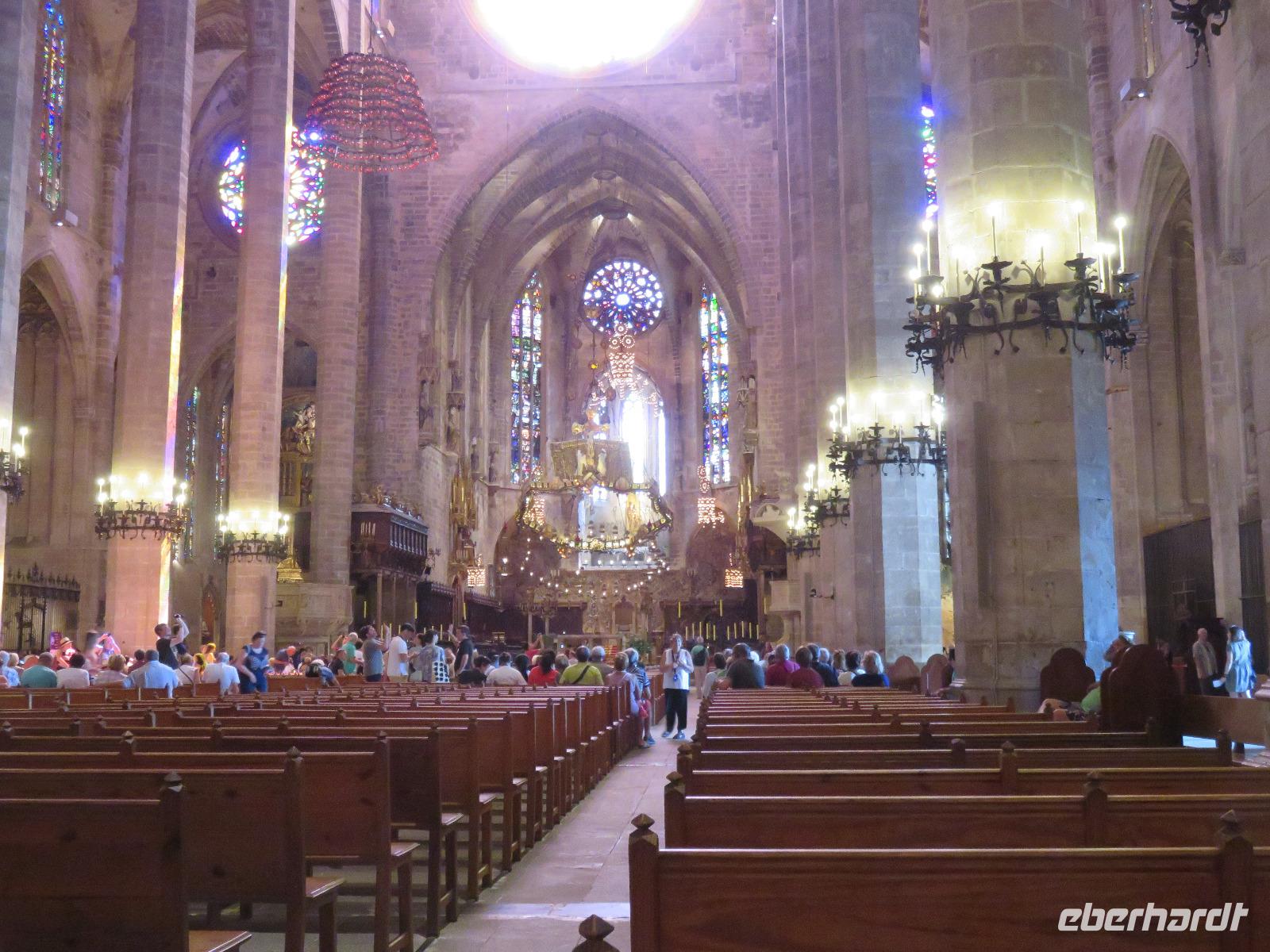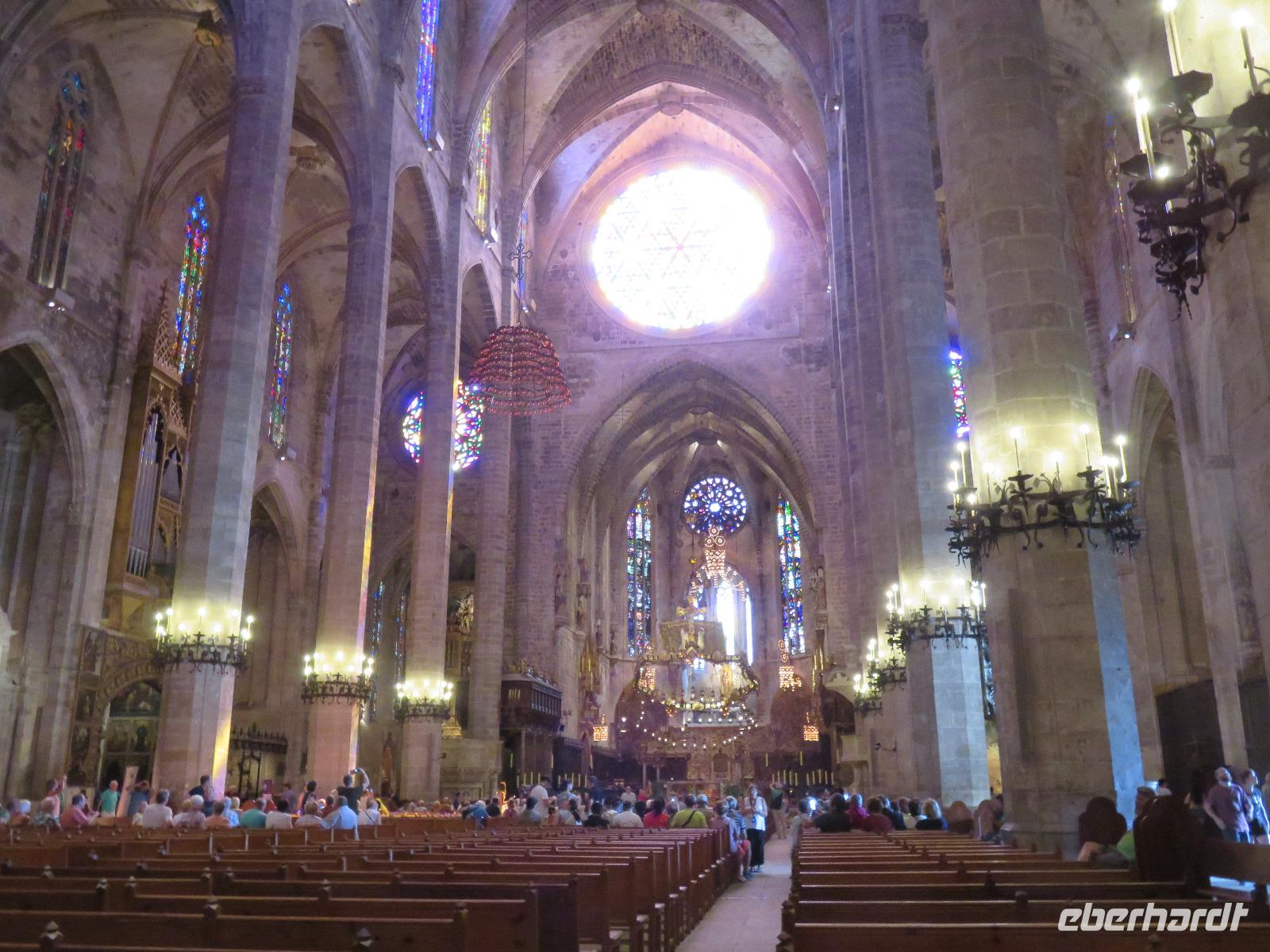 Wir machten im sprichwörtlichen Sinn die Nacht zum Tag und starteten von den Flughäfen Dresden oder Leipzig/Halle mit den ersten Flugzeugen in den jungen Tag nach Palma de Mallorca. Alle Transfers brachten uns pünktlich zum Abflug. Nach einem stärkenden Frühstück hoben wir in Richtung Palma de Mallorca ab. Am Flughafen in Palma begrüßte uns unsere örtliche Reiseleiterin Magdalena, eine sehr sachkundige, warmherzige Mallorcinerin. Zuerst fuhren wir zu unserem Hotel Tryp Bellver, direkt an der Uferpromenade mit Blick zum Yachthafen, zum Kreuzfahrthafen und zur Kathedrale La Seu. Vier Gäste stiegen sofort aus, um Palma individuell zu erkunden. Der Bus brachte uns hinauf zum Schloss Bellver, das wir nach einer Erfrischungspause besichtigten. Mit seinen mächtigen Mauern vermittelt es sofort den Eindruck einer Trutzburg. Magdalena erläuterte die kreisrunde Bauweise und die Geschichte der Nutzung der Anlage. Über den Innenhof erreichten wir schließlich den oberen Ring und bei guter Fernsicht konnten wir auf Palma sowie die Bucht von Palma bis Arenal blicken. Unser Chauffeur brachte uns schließlich zum Park de la Mer, von wo wir unseren Spaziergang begannen. Zuerst lenkten wir unsere Schritte hinauf zur Kathedrale La Seu. Über den Almoseneingang betraten wir das Innere dieses gewaltigen Kirchenbaus. Magdalena gab uns wichtige Informationen zur Geschichte, zur Architektur und zur Nutzung der Kathedrale. Wir bestaunten die schlanken Säulen, die das Kirchenschiff prägen, einzelne der Kapellen, die neugestaltete Kapelle von Barcelo, den Altar, der die Handschrift von Antonio Gaudí trägt, und natürlich die Rosette, die mit einem Durchmesser von 12,55 Metern zu den größten ihrer Art in Europa und der ganzen Welt zählt. Das durch das bunte Glas hereinkommende Tageslicht tanzte mit pastellfarbenen Streifen im Raum und an den Säulen der Kathedrale - ein Spiel der Farben und des Lichtes, einzigartig schön. Anschließend lenkten wir unsere Schritte durch die engen Gassen der Altstadt zum Rathaus, davor der alte Olivenbaum, über die Plaza Mayor zur Markthalle Mercat de l'Olivar. Hier legten wir eine Pause zum Schauen, Riechen oder auch Verkosten der unterschiedlichen Köstlichkeiten ein. Eine Vielfalt an Obst, Gemüse, Fisch und Fleischwaren, dazu Gewürze, bekannt und unbekannt, einheimisch und exotisch ... Nun war es an der Zeit zu unserem Hotel zu fahren und die Zimmer zu beziehen. Vom Spanischen Platz fuhren wir mit dem Bus zum Tryp Bellver: Für alle eine willkommene lange Pause zum Erholen, Frischmachen oder auch zum Bummeln - je nach Lust und Kondition.