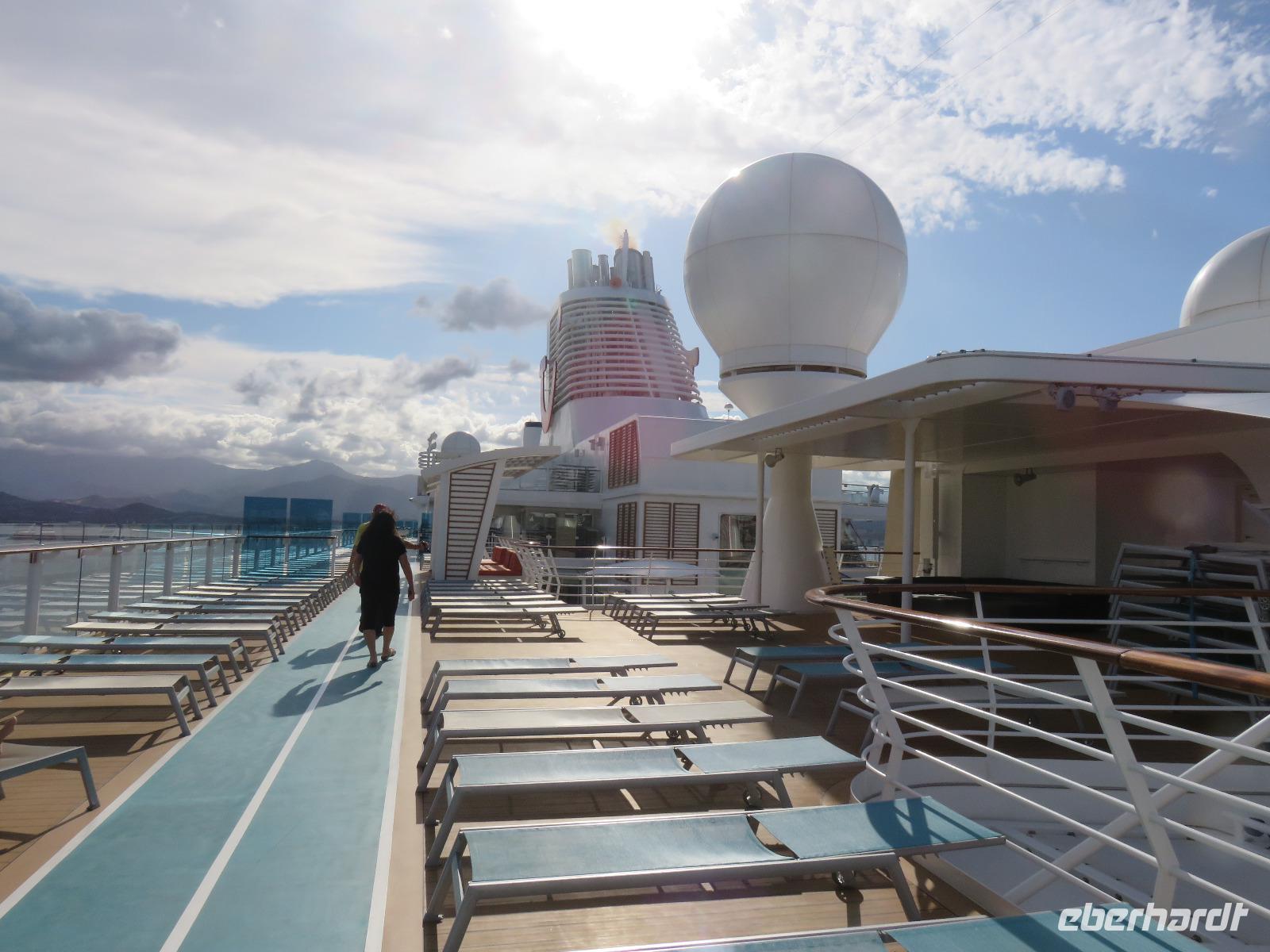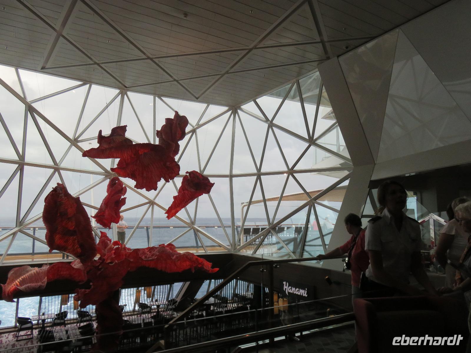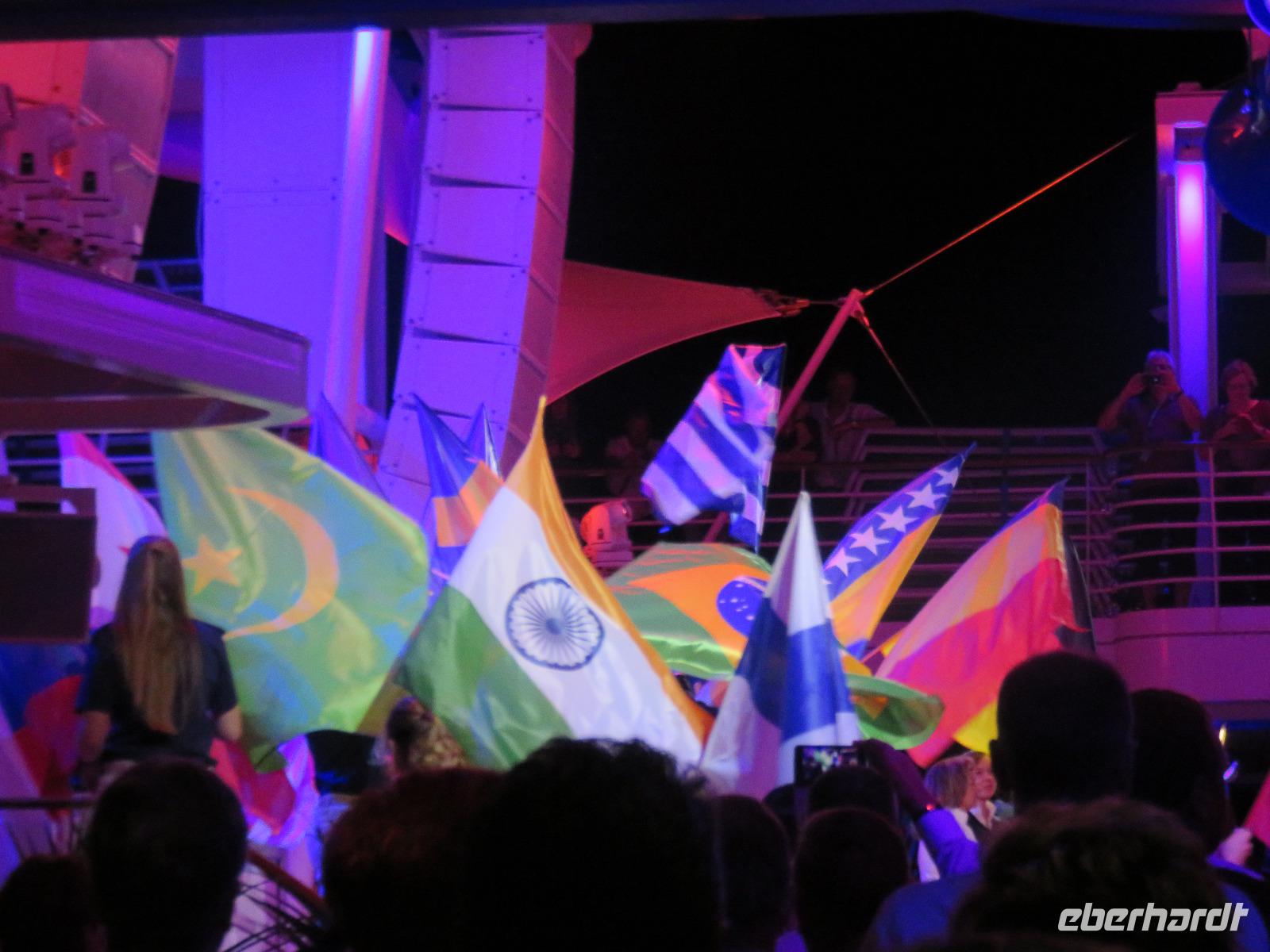 Wir trafen uns zur stimmungsvollen Show der Crew auf dem Pooldeck, Vertreter aus allen Bereichen verabschiedeten uns. Neben Kreuzfahrtdirektorin Nina nahmen Crewmitglieder aus 45 Nationen Aufstellung. Das Leben an Bord ist von gegenseitiger Achtung und Anerkennung geprägt, egal welcher Religion oder Hautfarbe. Diesen Gedanken hob die Kreuzfahrtdirektorin hervor: Hier an Bord sind wir eine Familie, und es funktioniert. Möge es in der ganzen Welt so werden! Eine Lasershow beendete unsere Verabschiedung. Wer wollte, konnte in den Morgen tanzen.