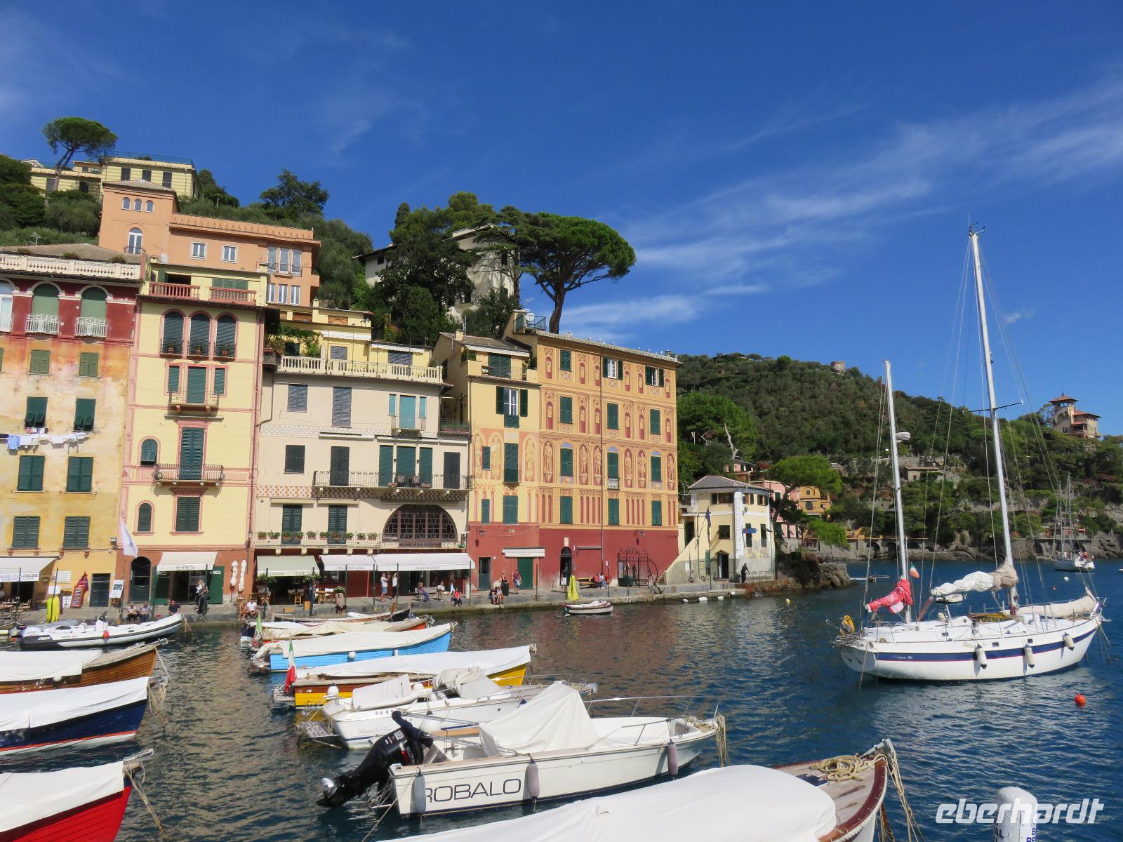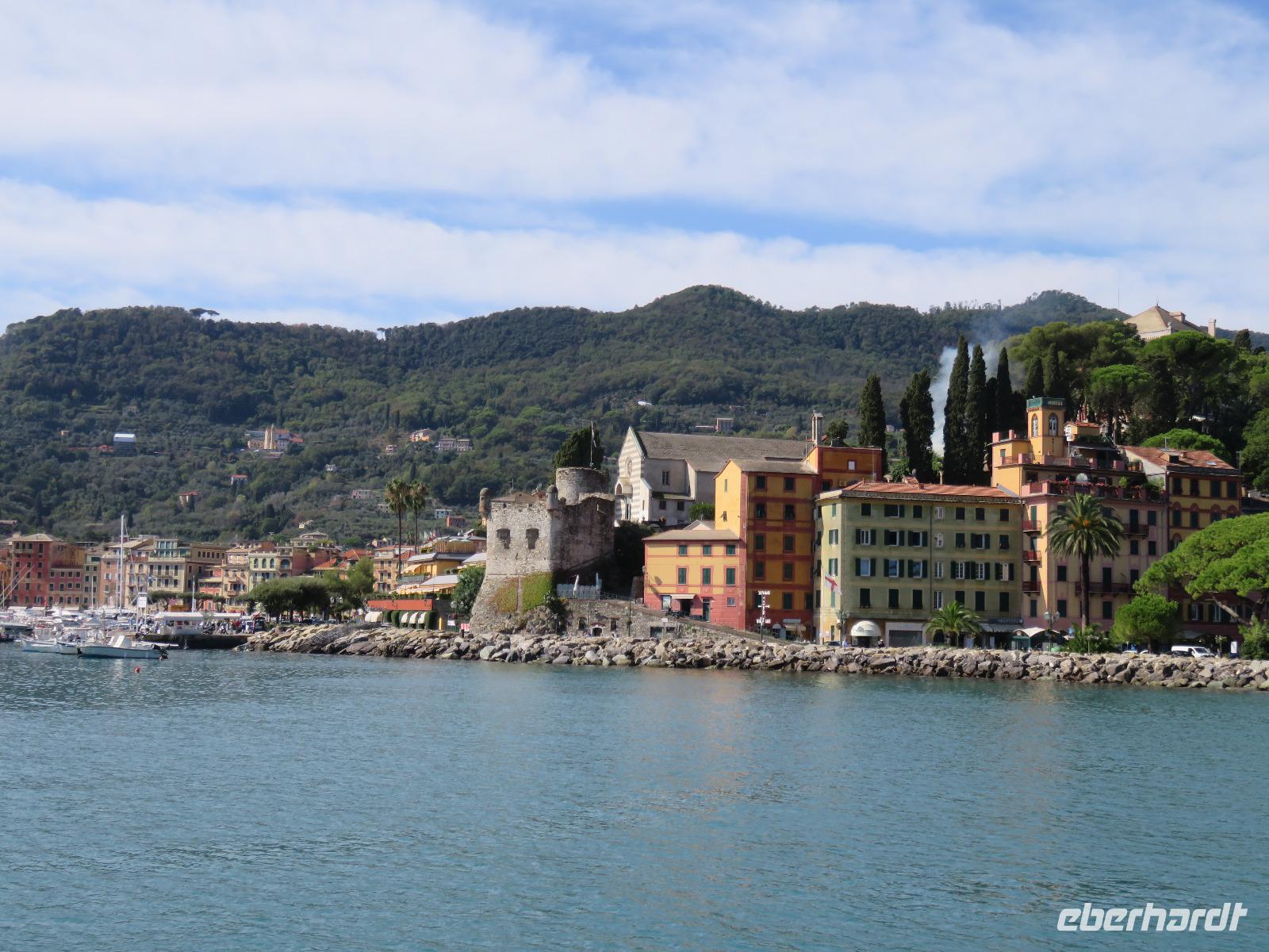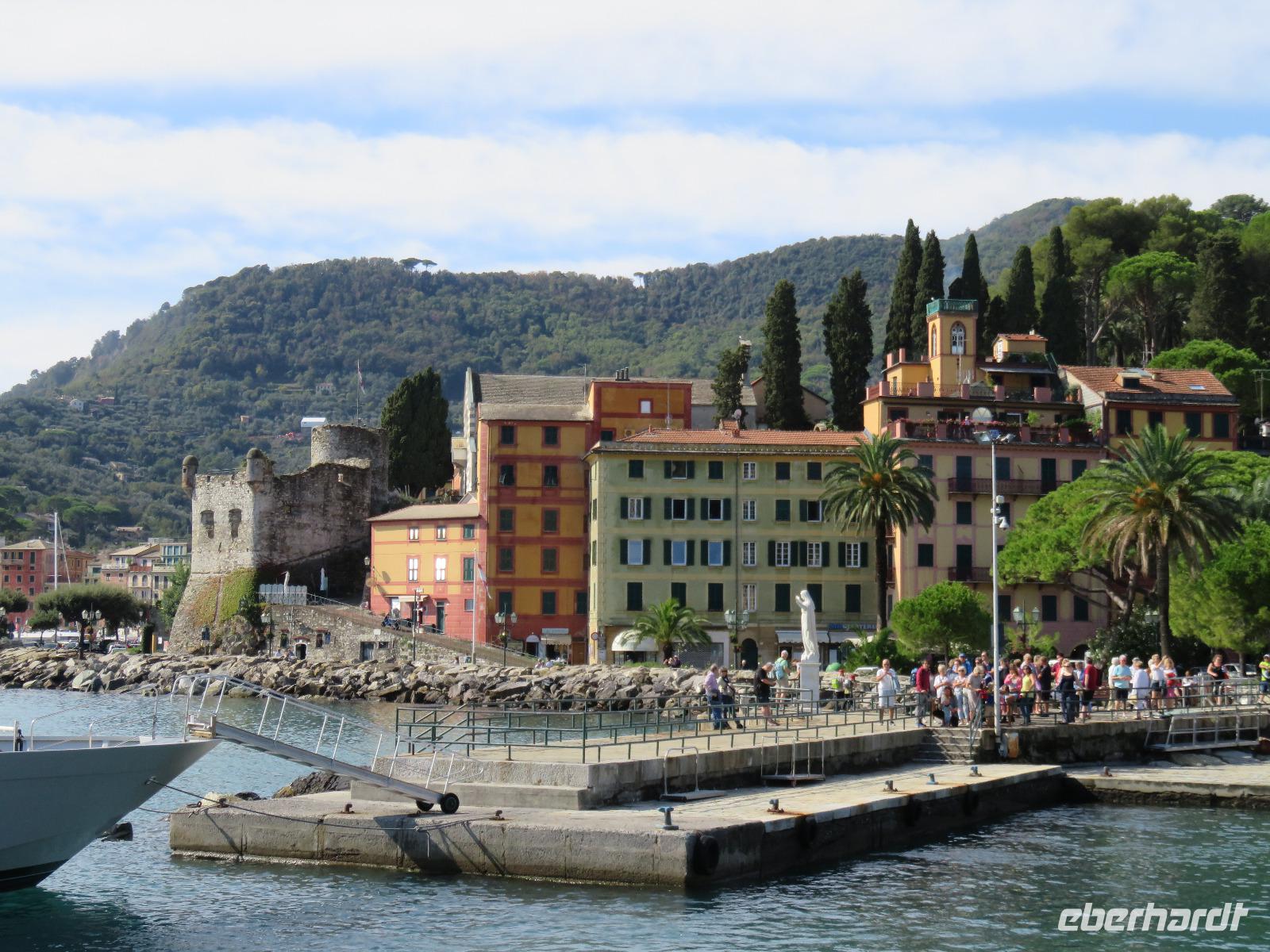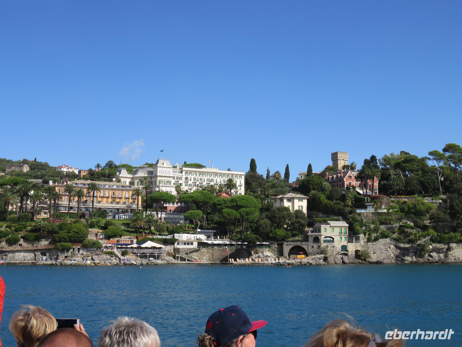 Beim Ausflug nach Portofino war unsere erste Station St. Margherita de Ligure direkt am Golfo Paradiso. Dieser Ort präsentierte sich als kleine, romantische Stadt mit Gassen und Gässchen, dem Hafen und natürlich dem Dom. Wir spazierten bis zum Hauptplatz und hatten dann etwas Freizeit zum Bummeln und Flanieren, zum Kaffeetrinken oder auch einfach nur zum Schauen und zur Aufnahme der besonderen Atmosphäre. An mehreren Häusern viel uns eine blaue Flagge auf, diese kündet von der sehr guten Wasserqualität entlang der Strände der Region. Natürlich haben wir auch von der Pogaggia gekostet: luftig, deftig und lecker ... Pünktlich trafen wir uns alle am Denkmal für Victorio Emanuelle II. am Hafen. Ziel unserer kleinen Schifffahrt war das 15 Minuten entfernte bezaubernde Portofino. Entlang der Küste blickten wir auf kleine, feine Strände, zu herrschaftlichen Villen und ein kleiner Schwenk nach rechts und dann der Blick in die kleine Bucht von Portofino mit der berühmten Häuserzeile: strahlend, blauer Himmel, türkisfarbenes Meer und die bunten Häuser. Schnell an Land und diese Szenerie aufnehmen. Nach Hinweisen zu den einzelnen Straßen, die von der Piazetta abzweigen, zum besten Eis des Städtchens, zum Aufstieg zur Kirche San Giorgio oder zum Castello Brown, war Freizeit und jeder lenkte seine Schritte nach Lust und Laune. Nur das Eis war mit 3 € pro Kugel etwas teuer. Aber wir hatten doch in einer Nebenstraße auch eine kleine Gelateria entdeckt und diese verwendete ebenfalls nur natürliche Rohstoffe, also laufen wir wieder zurück, denn die Lage dieses Geschäftes wollten wir nicht mitbezahlen. Wer von uns gute Kondition hatte und den Weg hinauf zur Kirche San Giorgio nicht scheute, wurde mit einem wundervollen Panoramablick auf Portofino und auf das offene Meer belohnt. Mit dem Boot fuhren wir schließlich zurück und von dort mit dem Bus wieder nach La Spezia. Wir wären aber nicht hier gewesen, hätten wir in Rapallo nicht einen Blick auf das berühmte Hotel Imperiale Palace geworfen. Hier wurde 1922 der Vertrag zwischen Deutschland und Russland geschlossen und Weltgeschichte geschrieben. Damit nahmen beide Länder diplomatische Beziehungen, die durch den 1. Weltkrieg und die Oktoberrevolution unterbrochen waren, wieder auf.