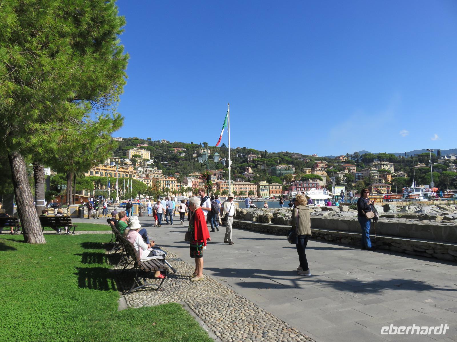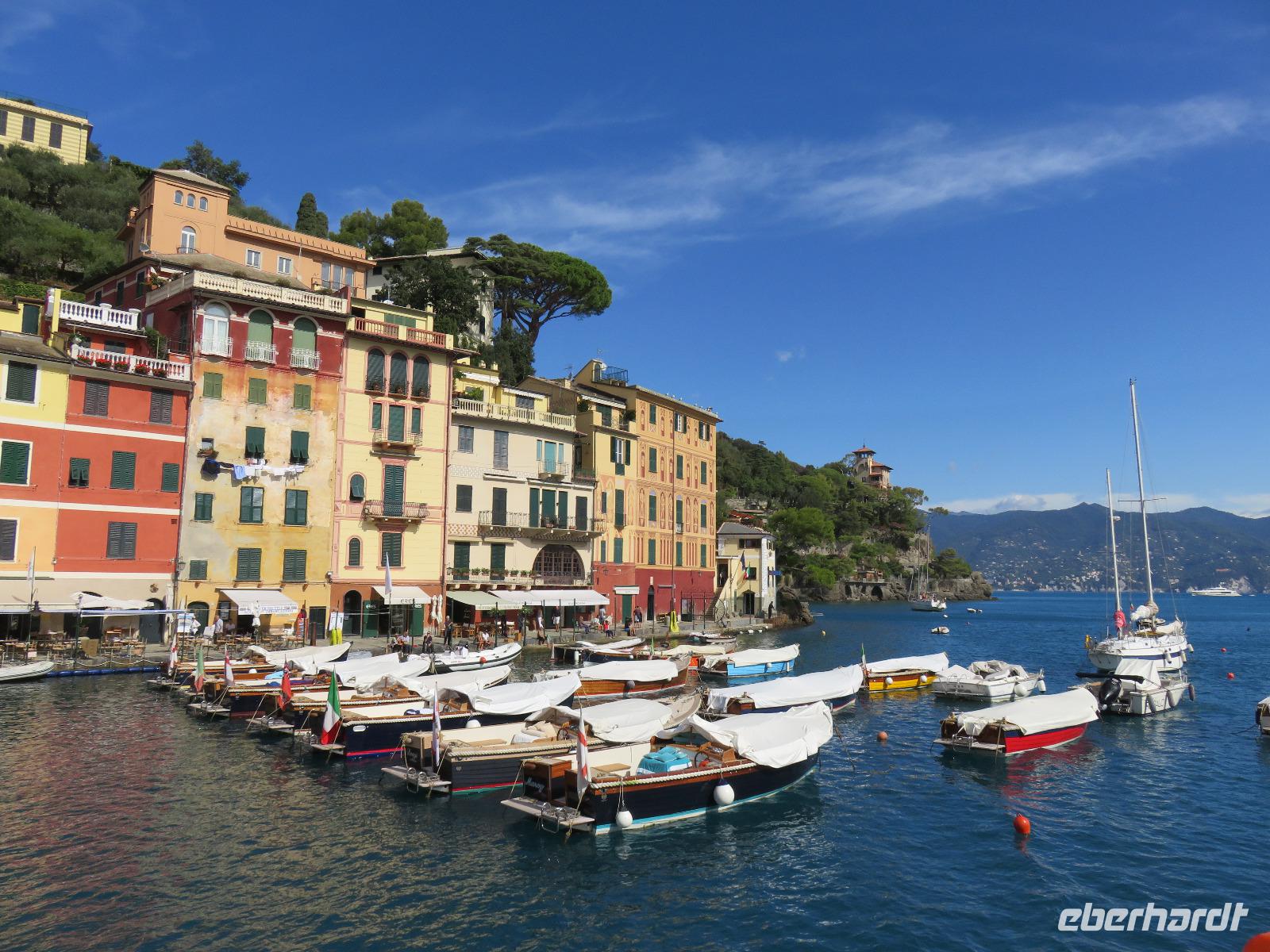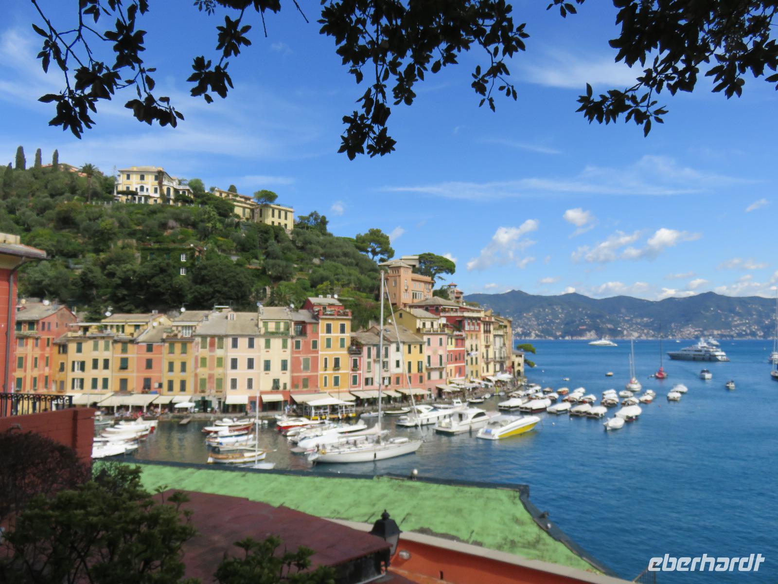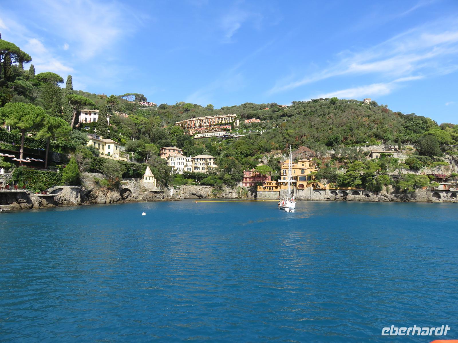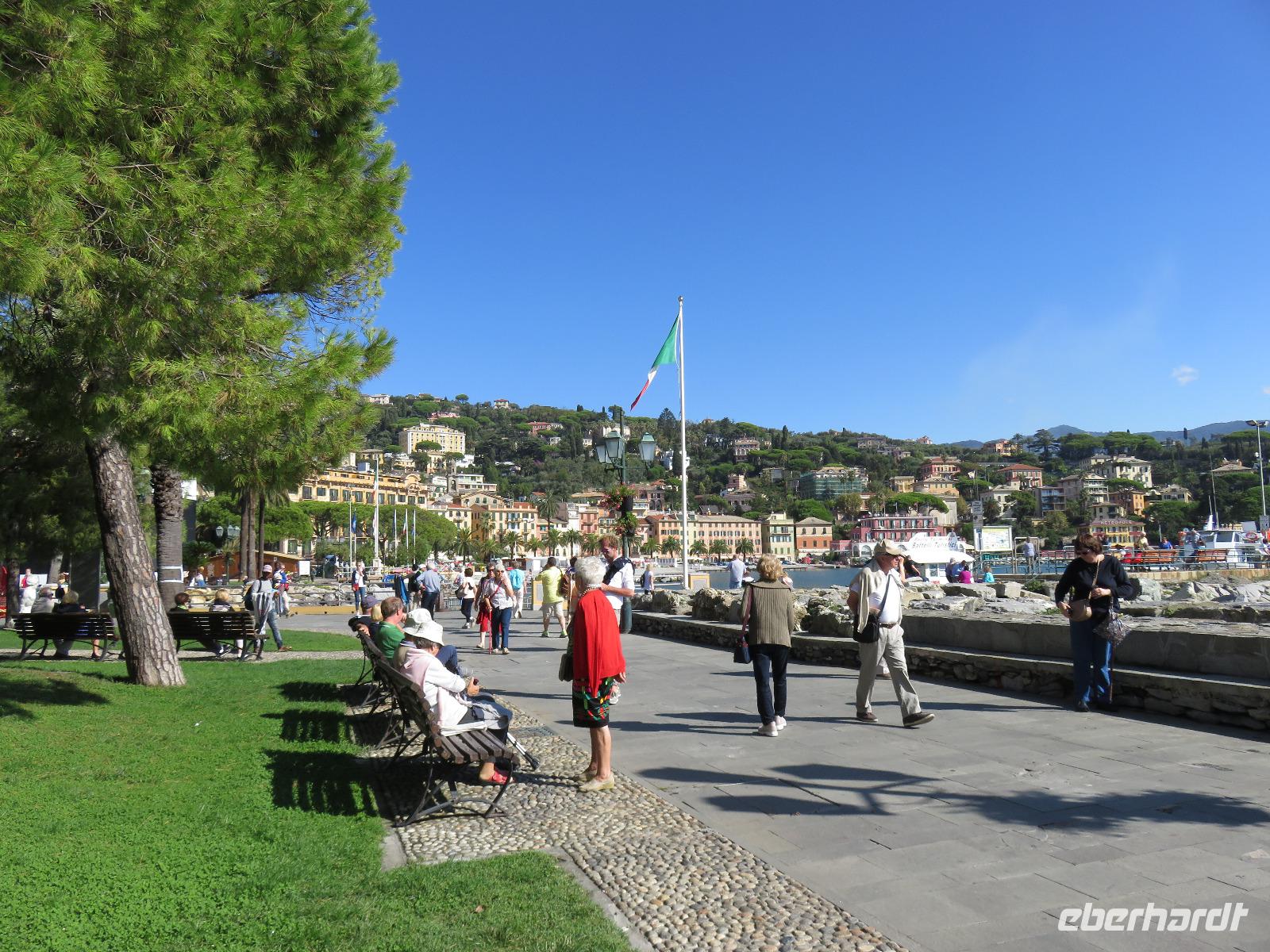 Beim Ausflug nach Portofino war unsere erste Station St. Margherita de Ligure direkt am Golfo Paradiso. Dieser Ort präsentierte sich als kleine, romantische Stadt mit Gassen und Gässchen, dem Hafen und natürlich dem Dom. Wir spazierten bis zum Hauptplatz und hatten dann etwas Freizeit zum Bummeln und Flanieren, zum Kaffeetrinken oder auch einfach nur zum Schauen und zur Aufnahme der besonderen Atmosphäre. An mehreren Häusern viel uns eine blaue Flagge auf, diese kündet von der sehr guten Wasserqualität entlang der Strände der Region. Natürlich haben wir auch von der Pogaggia gekostet: luftig, deftig und lecker ... Pünktlich trafen wir uns alle am Denkmal für Victorio Emanuelle II. am Hafen. Ziel unserer kleinen Schifffahrt war das 15 Minuten entfernte bezaubernde Portofino. Entlang der Küste blickten wir auf kleine, feine Strände, zu herrschaftlichen Villen und ein kleiner Schwenk nach rechts und dann der Blick in die kleine Bucht von Portofino mit der berühmten Häuserzeile: strahlend, blauer Himmel, türkisfarbenes Meer und die bunten Häuser. Schnell an Land und diese Szenerie aufnehmen. Nach Hinweisen zu den einzelnen Straßen, die von der Piazetta abzweigen, zum besten Eis des Städtchens, zum Aufstieg zur Kirche San Giorgio oder zum Castello Brown, war Freizeit und jeder lenkte seine Schritte nach Lust und Laune. Nur das Eis war mit 3 € pro Kugel etwas teuer. Aber wir hatten doch in einer Nebenstraße auch eine kleine Gelateria entdeckt und diese verwendete ebenfalls nur natürliche Rohstoffe, also laufen wir wieder zurück, denn die Lage dieses Geschäftes wollten wir nicht mitbezahlen. Wer von uns gute Kondition hatte und den Weg hinauf zur Kirche San Giorgio nicht scheute, wurde mit einem wundervollen Panoramablick auf Portofino und auf das offene Meer belohnt. Mit dem Boot fuhren wir schließlich zurück und von dort mit dem Bus wieder nach La Spezia. Wir wären aber nicht hier gewesen, hätten wir in Rapallo nicht einen Blick auf das berühmte Hotel Imperiale Palace geworfen. Hier wurde 1922 der Vertrag zwischen Deutschland und Russland geschlossen und Weltgeschichte geschrieben. Damit nahmen beide Länder diplomatische Beziehungen, die durch den 1. Weltkrieg und die Oktoberrevolution unterbrochen waren, wieder auf.