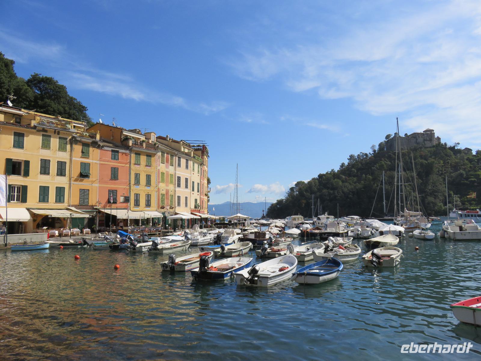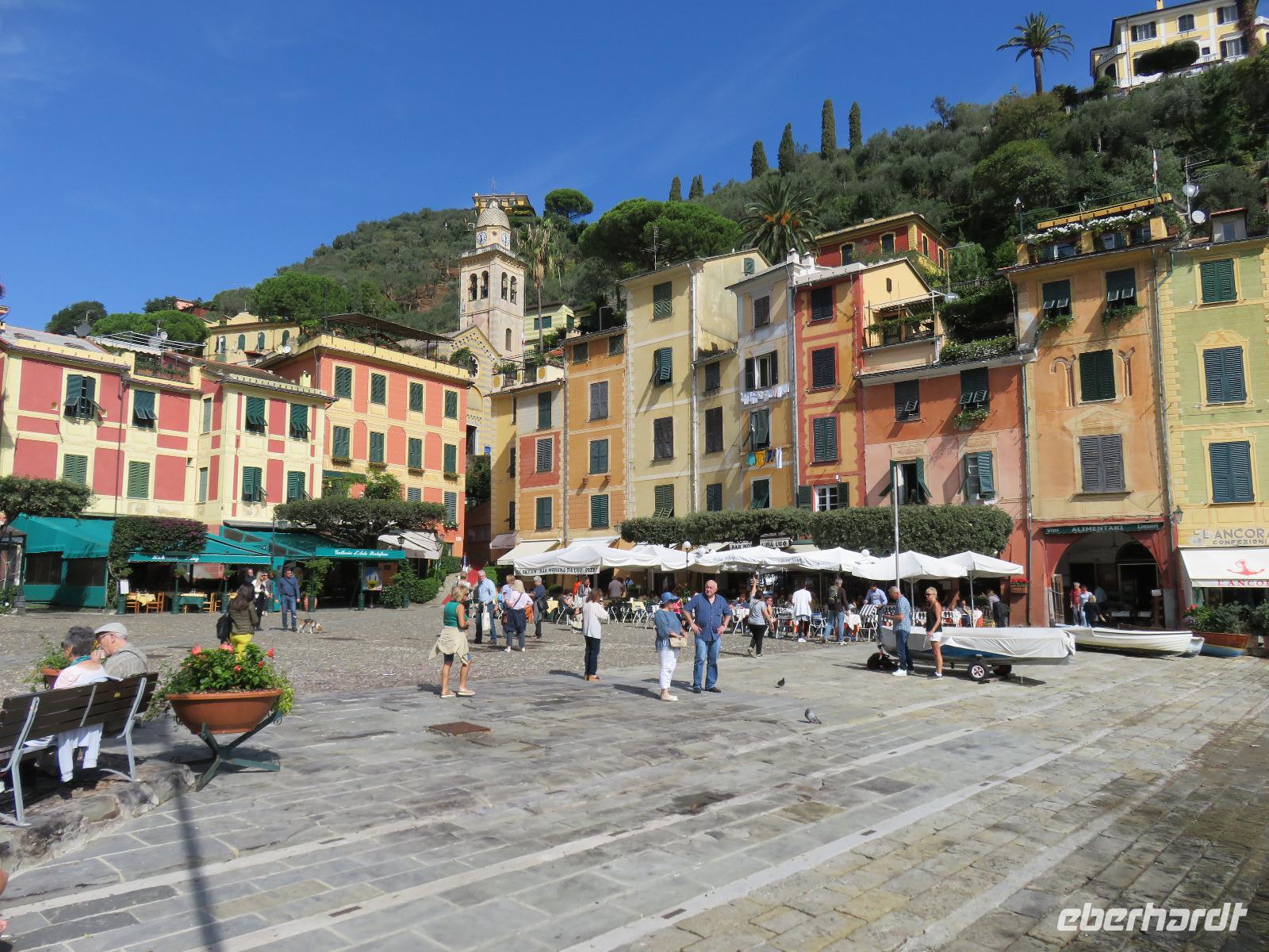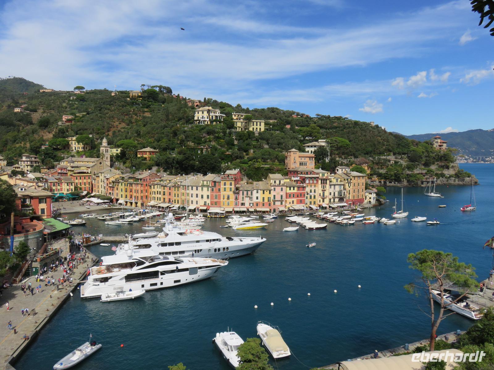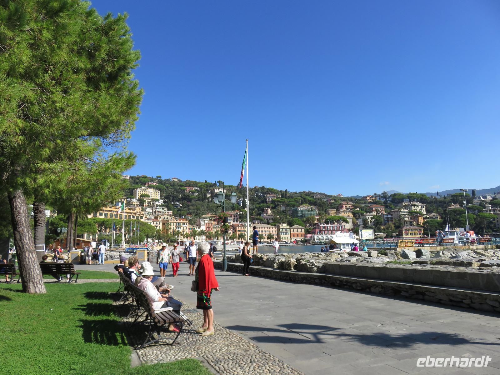 Beim Ausflug nach Portofino war unsere erste Station St. Margherita de Ligure direkt am Golfo Paradiso. Dieser Ort präsentierte sich als kleine, romantische Stadt mit Gassen und Gässchen, dem Hafen und natürlich dem Dom. Wir spazierten bis zum Hauptplatz und hatten dann etwas Freizeit zum Bummeln und Flanieren, zum Kaffeetrinken oder auch einfach nur zum Schauen und zur Aufnahme der besonderen Atmosphäre. An mehreren Häusern viel uns eine blaue Flagge auf, diese kündet von der sehr guten Wasserqualität entlang der Strände der Region. Natürlich haben wir auch von der Pogaggia gekostet: luftig, deftig und lecker ... Pünktlich trafen wir uns alle am Denkmal für Victorio Emanuelle II. am Hafen. Ziel unserer kleinen Schifffahrt war das 15 Minuten entfernte bezaubernde Portofino. Entlang der Küste blickten wir auf kleine, feine Strände, zu herrschaftlichen Villen und ein kleiner Schwenk nach rechts und dann der Blick in die kleine Bucht von Portofino mit der berühmten Häuserzeile: strahlend, blauer Himmel, türkisfarbenes Meer und die bunten Häuser. Schnell an Land und diese Szenerie aufnehmen. Nach Hinweisen zu den einzelnen Straßen, die von der Piazetta abzweigen, zum besten Eis des Städtchens, zum Aufstieg zur Kirche San Giorgio oder zum Castello Brown, war Freizeit und jeder lenkte seine Schritte nach Lust und Laune. Nur das Eis war mit 3 € pro Kugel etwas teuer. Aber wir hatten doch in einer Nebenstraße auch eine kleine Gelateria entdeckt und diese verwendete ebenfalls nur natürliche Rohstoffe, also laufen wir wieder zurück, denn die Lage dieses Geschäftes wollten wir nicht mitbezahlen. Wer von uns gute Kondition hatte und den Weg hinauf zur Kirche San Giorgio nicht scheute, wurde mit einem wundervollen Panoramablick auf Portofino und auf das offene Meer belohnt. Mit dem Boot fuhren wir schließlich zurück und von dort mit dem Bus wieder nach La Spezia. Wir wären aber nicht hier gewesen, hätten wir in Rapallo nicht einen Blick auf das berühmte Hotel Imperiale Palace geworfen. Hier wurde 1922 der Vertrag zwischen Deutschland und Russland geschlossen und Weltgeschichte geschrieben. Damit nahmen beide Länder diplomatische Beziehungen, die durch den 1. Weltkrieg und die Oktoberrevolution unterbrochen waren, wieder auf.