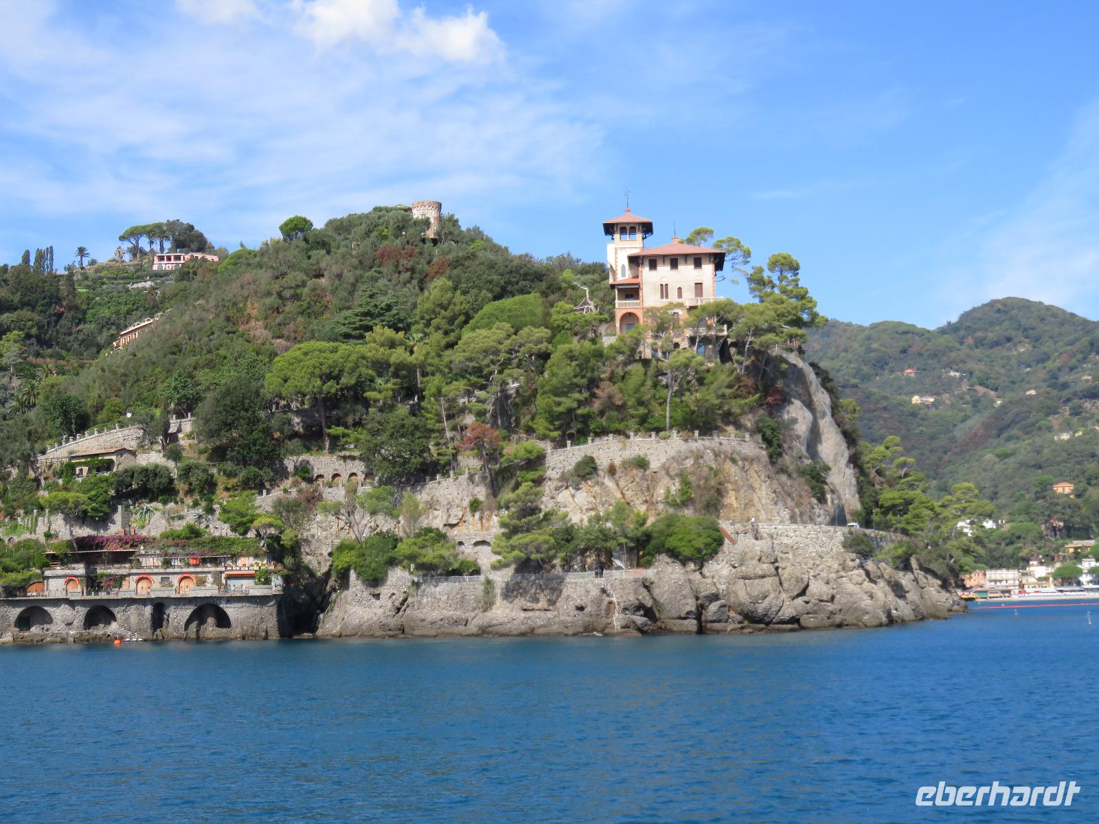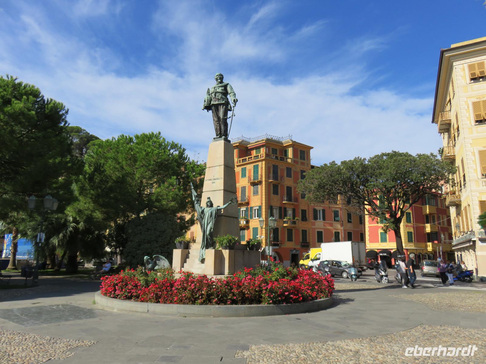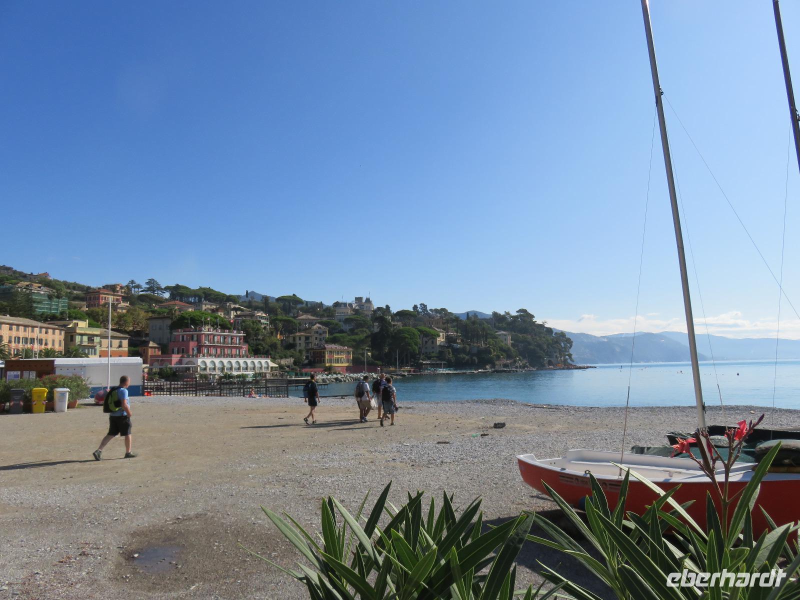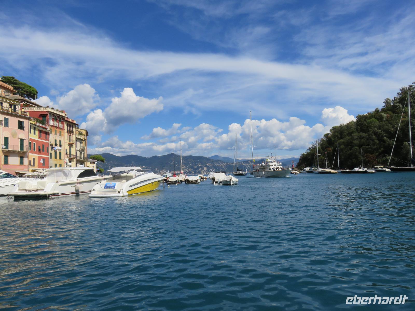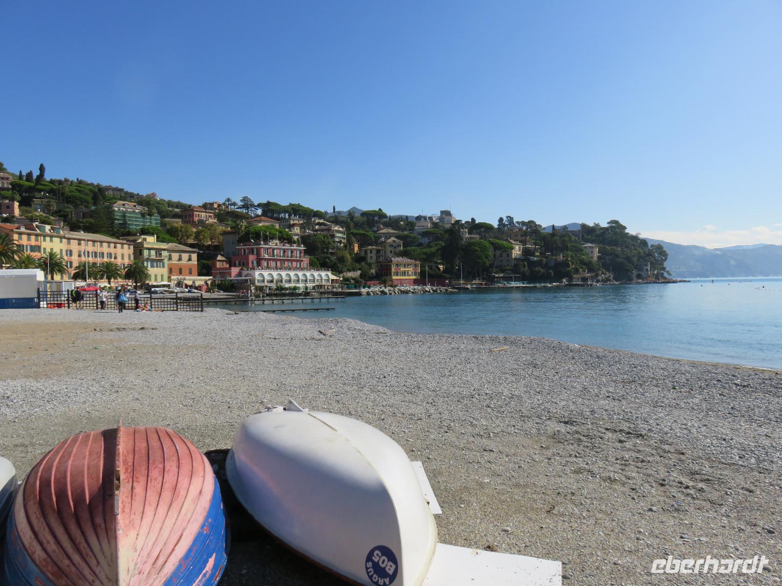 Beim Ausflug nach Portofino war unsere erste Station St. Margherita de Ligure direkt am Golfo Paradiso. Dieser Ort präsentierte sich als kleine, romantische Stadt mit Gassen und Gässchen, dem Hafen und natürlich dem Dom. Wir spazierten bis zum Hauptplatz und hatten dann etwas Freizeit zum Bummeln und Flanieren, zum Kaffeetrinken oder auch einfach nur zum Schauen und zur Aufnahme der besonderen Atmosphäre. An mehreren Häusern viel uns eine blaue Flagge auf, diese kündet von der sehr guten Wasserqualität entlang der Strände der Region. Natürlich haben wir auch von der Pogaggia gekostet: luftig, deftig und lecker ... Pünktlich trafen wir uns alle am Denkmal für Victorio Emanuelle II. am Hafen. Ziel unserer kleinen Schifffahrt war das 15 Minuten entfernte bezaubernde Portofino. Entlang der Küste blickten wir auf kleine, feine Strände, zu herrschaftlichen Villen und ein kleiner Schwenk nach rechts und dann der Blick in die kleine Bucht von Portofino mit der berühmten Häuserzeile: strahlend, blauer Himmel, türkisfarbenes Meer und die bunten Häuser. Schnell an Land und diese Szenerie aufnehmen. Nach Hinweisen zu den einzelnen Straßen, die von der Piazetta abzweigen, zum besten Eis des Städtchens, zum Aufstieg zur Kirche San Giorgio oder zum Castello Brown, war Freizeit und jeder lenkte seine Schritte nach Lust und Laune. Nur das Eis war mit 3 € pro Kugel etwas teuer. Aber wir hatten doch in einer Nebenstraße auch eine kleine Gelateria entdeckt und diese verwendete ebenfalls nur natürliche Rohstoffe, also laufen wir wieder zurück, denn die Lage dieses Geschäftes wollten wir nicht mitbezahlen. Wer von uns gute Kondition hatte und den Weg hinauf zur Kirche San Giorgio nicht scheute, wurde mit einem wundervollen Panoramablick auf Portofino und auf das offene Meer belohnt. Mit dem Boot fuhren wir schließlich zurück und von dort mit dem Bus wieder nach La Spezia. Wir wären aber nicht hier gewesen, hätten wir in Rapallo nicht einen Blick auf das berühmte Hotel Imperiale Palace geworfen. Hier wurde 1922 der Vertrag zwischen Deutschland und Russland geschlossen und Weltgeschichte geschrieben. Damit nahmen beide Länder diplomatische Beziehungen, die durch den 1. Weltkrieg und die Oktoberrevolution unterbrochen waren, wieder auf.