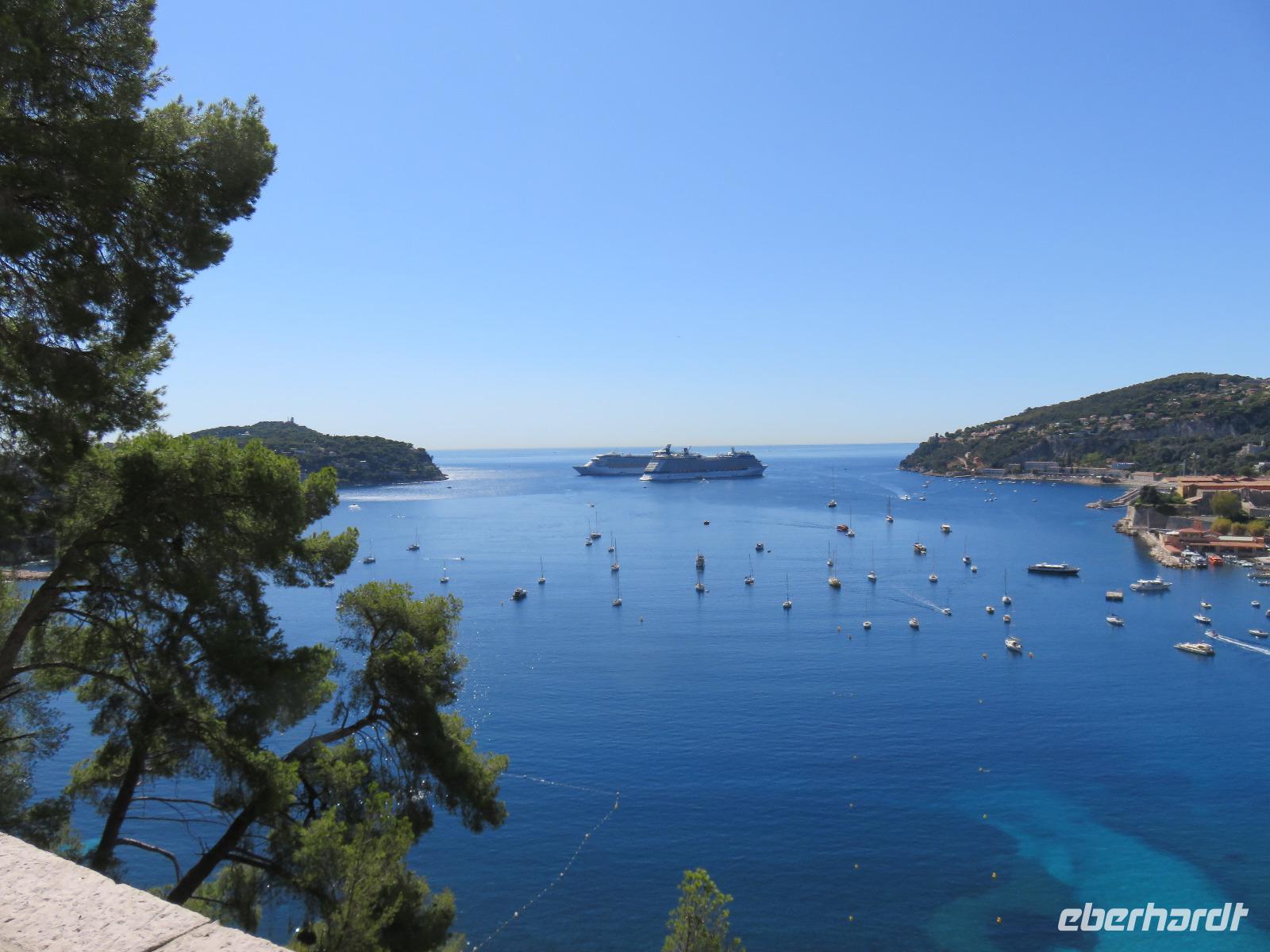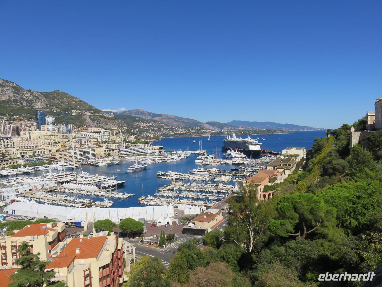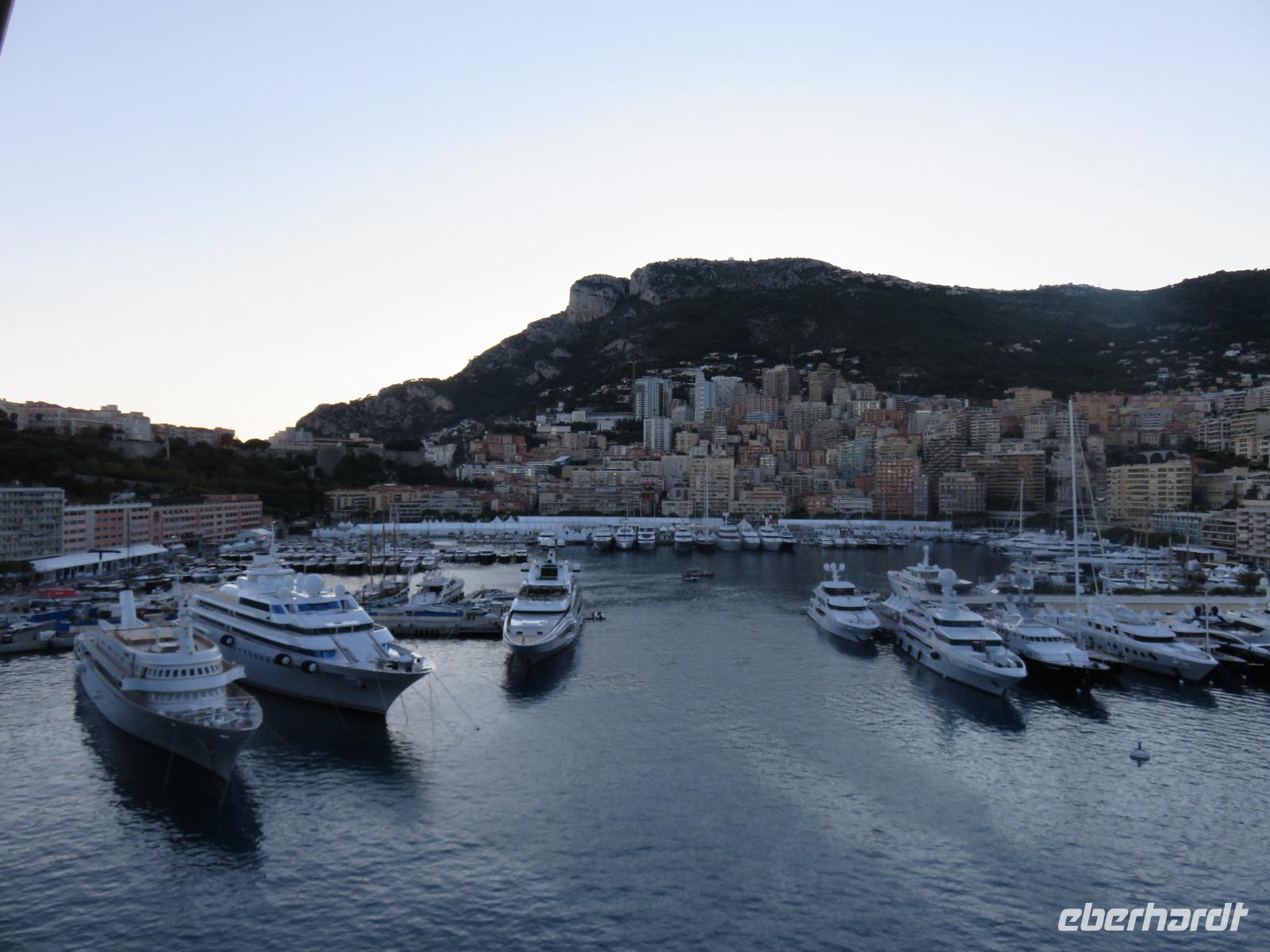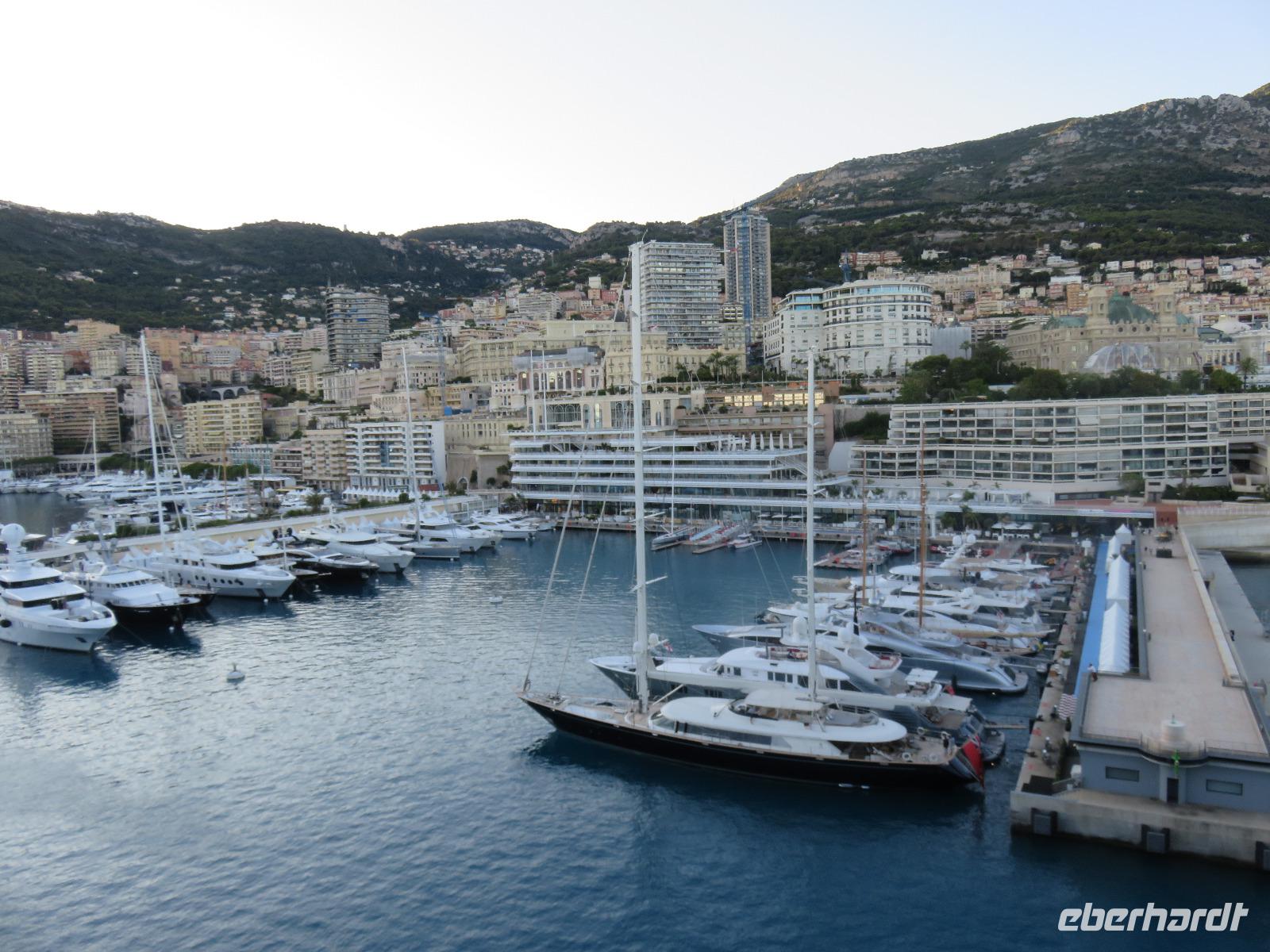 Um Zwölf Uhr hörten wir den Kanonendonner, der vom Schloss seit 1860 abgefeuert wird. Er geht auf Sir Thomas Coventry zurück und soll an ein regelmäßiges Mittagessen erinnern. Nach etwas Freizeit fuhren wir ein großes Stück entlang dieses sieben Kilometer langen Boulevards. Im Golf von Villefranche-sur-Mer blickten wir während eines Fotostopps auf das türkisfarbene Meer und die beiden Kreuzfahrtschiffe, die hier ankerten und deren Gäste mit Tenderbooten an Land gebracht worden. Weiter nahmen wir die Küstenstraße, um nach Monaco zurückzukehren. Unterwegs berichtete Helena vom Leben im Fürstentum, von der Fürstenfamilie der Grimaldis und die Bauweise der Häuser. Hier wird sehr gut gebaut, obwohl viele Häuser auf Pfählen stehen und teilweise in das Mittelmeer ragen, sind sie Erbeben sicher errichtet und sollen bis zu einer Stärke von 8 der Richterskala trotzen. Wir sahen die Strecke der Formel 1, verharrten ganz kurz an der Poolposition und dann ging es in steilem Bogen hinein in das Parkhaus der Busse. Von dort nahmen wir die Rolltreppe, den Fahrstuhl und die Rolltreppe und schon waren wir auf der Ebene des Felsens von Monaco. Wir besichtigten die neoromanische Kathedrale der unbefleckten Empfängnis mit der Fürstengruft der Grimaldis. Das Grab von Fürstin Gracia Patricia (Grace Kelly) war besonders üppig mit Blumen geschmückt. Danach spazierten wir durch die engen Gassen zum Fürstlichen Palast. Offensichtlich war Fürst Albert zu Hause, seine Flagge wehte im Wind. Die Freizeit nutzten wir zu einer Erfrischung, wir beobachteten die Ablösung der Ehrenwache am Schloss, erfreuten uns am wahrlich imposanten Blick auf Monte Carlo und den Hafen La Condamine mit unzähligen Yachten verschiedenster Größen und Kategorien. Nur eins haben wir nicht getan, unser Glück im berühmten Großen Casino versucht. Also dann doch einen Bummel im kleinen Botanischen Garten an der Katherdale. Nun wieder hinab zum Bus, Rolltreppe, Fahrstuhl, Rolltreppe ... Und mit dem Bus um drei Ecken und schon waren wir am Hafen und damit am Schiff. Herzlich verabschiedeten wir uns von Helena und Patrick, die mit uns einen äußerst interessanten Tag verbracht hatten.