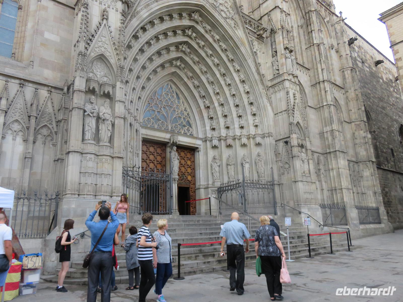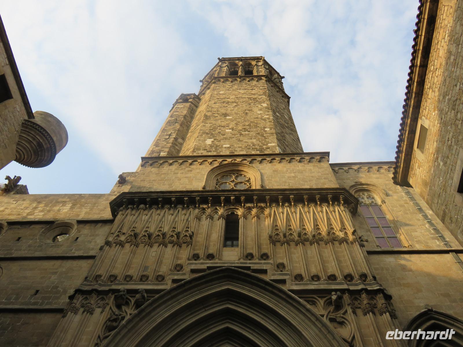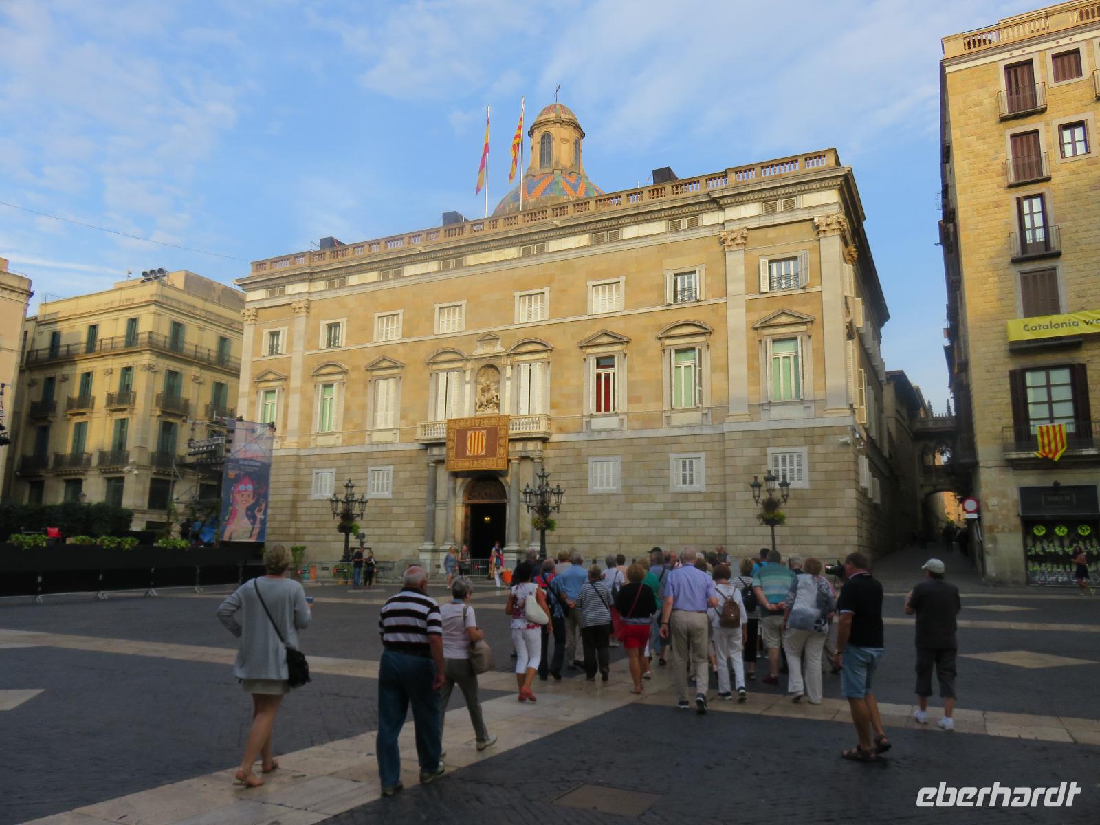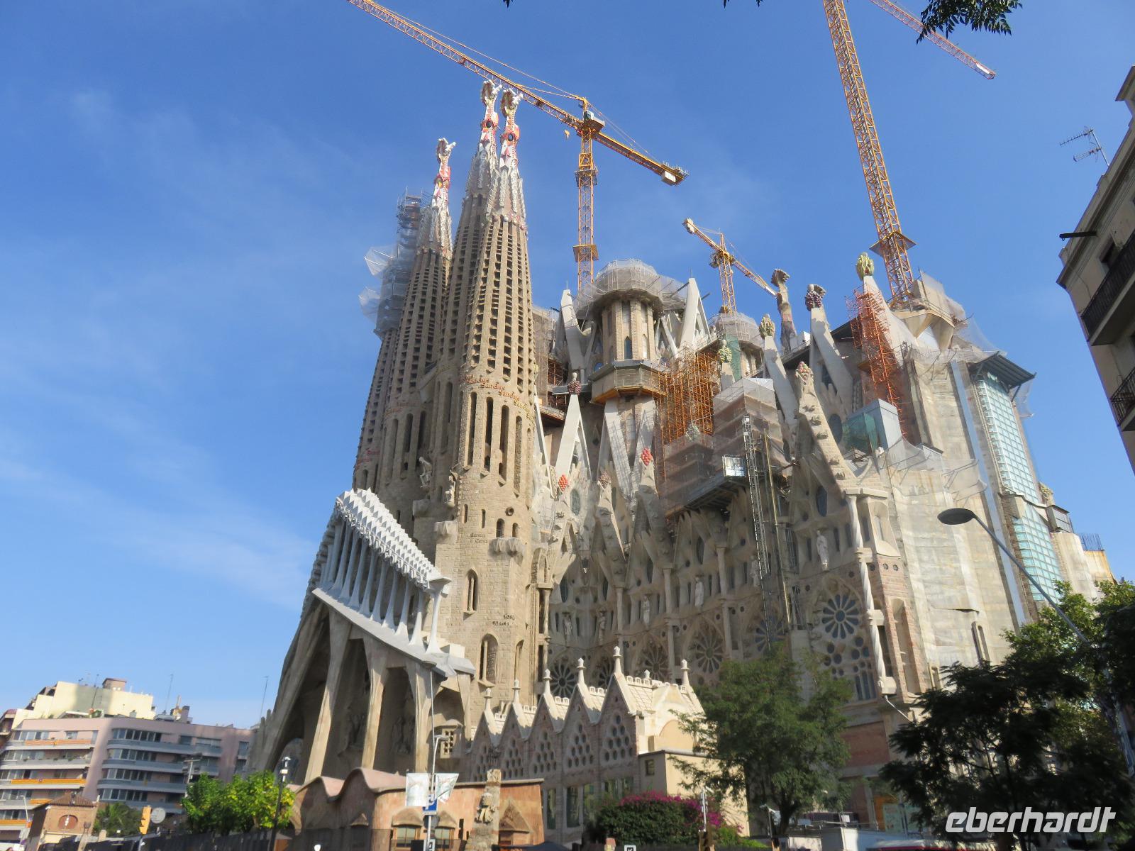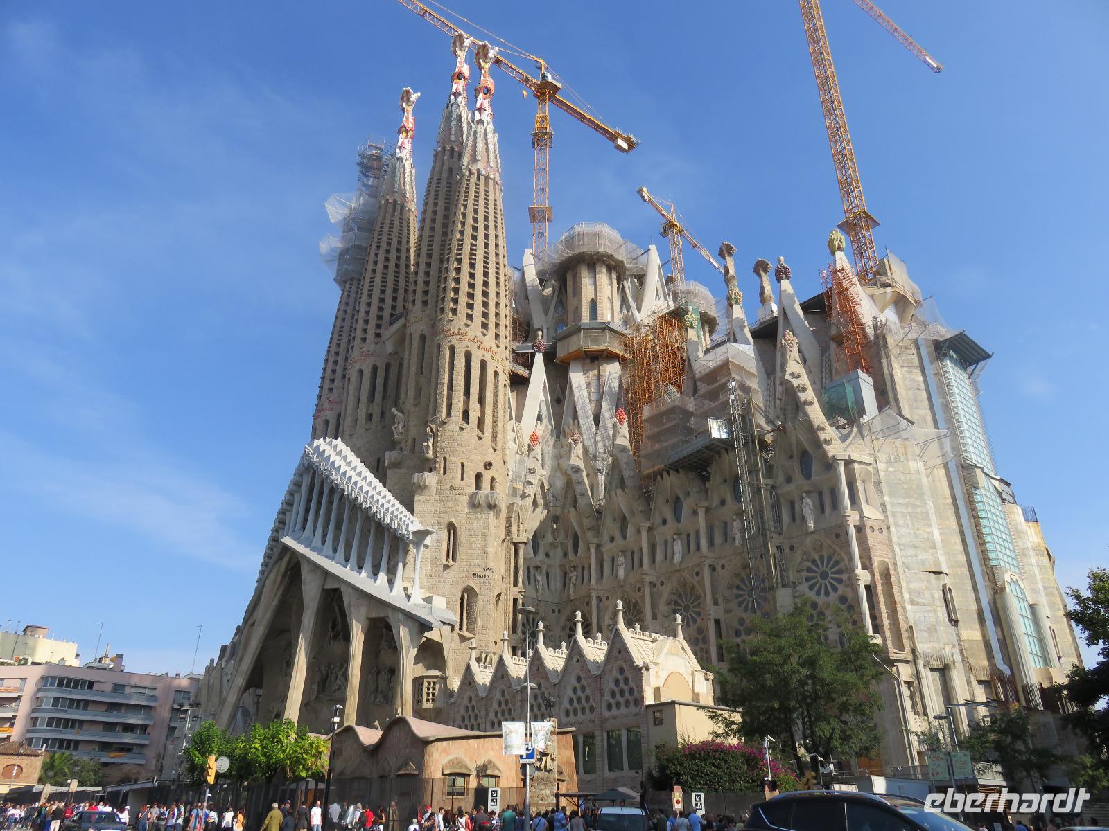 Wieder zeigte sich die Sonne vom fast wolkenlosen Himmel. Wir trafen uns im Theater und die Mehrzahl der Gäste unserer Gruppe begab sich auf die Besichtigungstour in der Hauptstadt Kataloniens. Mit Joke, einer Holländerin, spazierten wir zuerst durch die Altstadt mit dem Barri Gòtic, dem Gotischen Viertel, zur gewaltigen Kathedrale Santa Eulàlia, die wir auch von Innen besichtigten. Im Chorgestühl sahen wir die Wappen der Ritter des Goldenen Vlieses, im Kreuzgang sahen wir die berühmte Gänse, die an die Legende der Heiligen Eulalia erinnern. Vorbei an der alten Stadtmauer und dem Äquadukt, der alten römischen Wasserleitung, erreichten wir den Katalanischen Platz. Nun fuhren wir zu Sagrada Familie, dem Hauptwahrzeichen von Barcelona. Schon am Vorabend eindrucksvoll präsentierte sich nun das Bauwerk im Stil der Modernisme mit einer bereits bunten Fassade, auch wenn die Haupttürme noch fehlen! Joke erläuterte einzelne Elemente der Fassaden und wir kamen erneut ins Staunen über die Fülle an Darstellungen und die Phantasie Gaudís. Einzigartig, wie es Architekten gegenwärtig umsetzen und arrangieren.