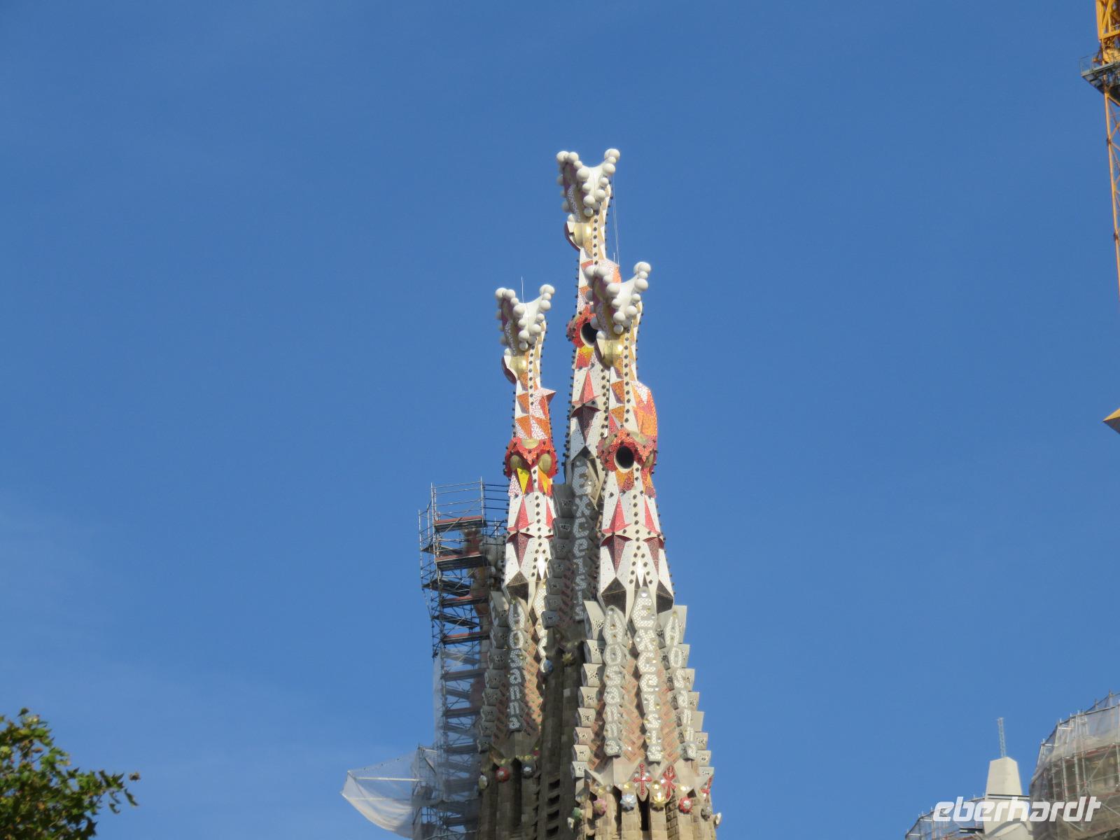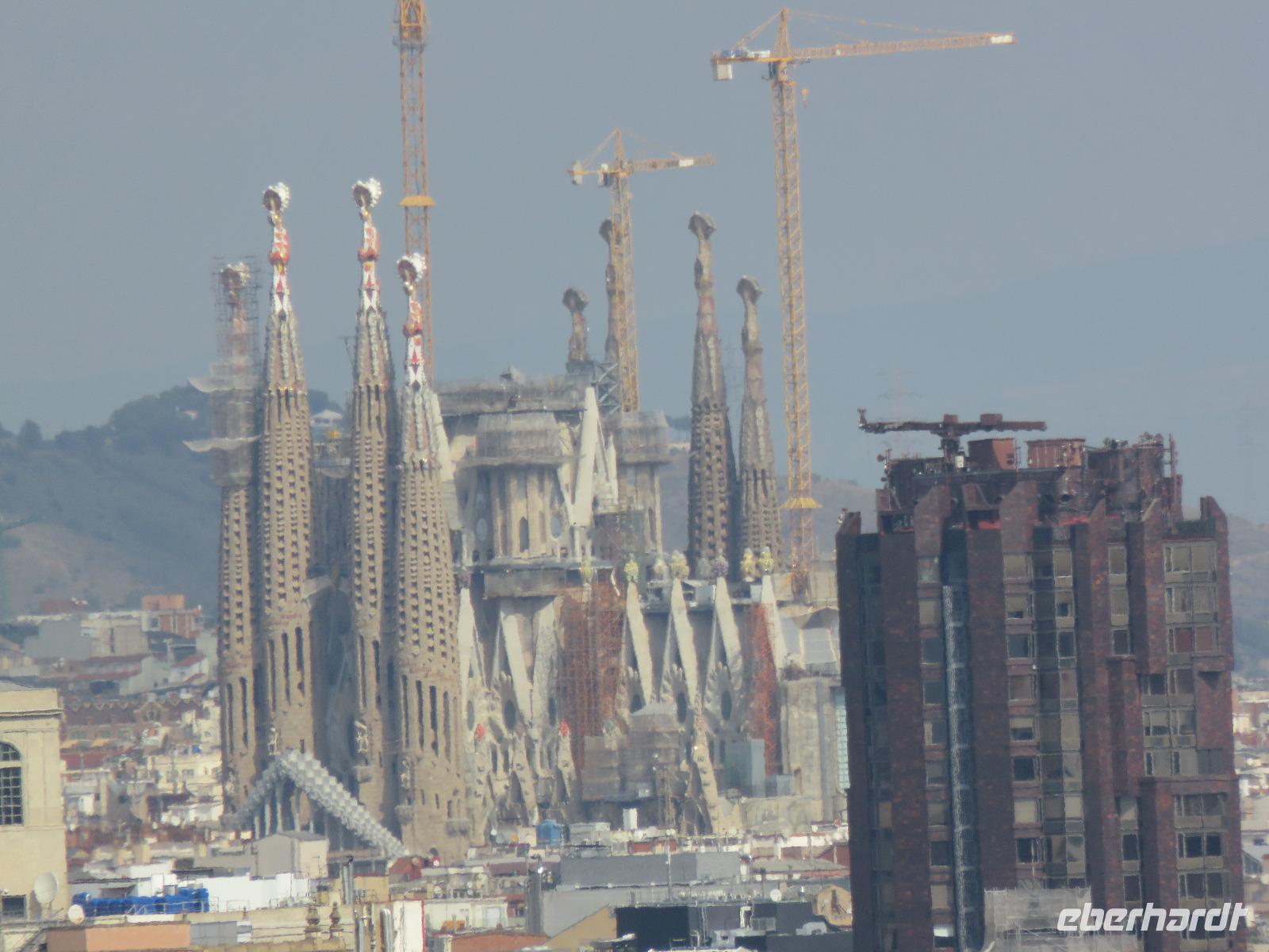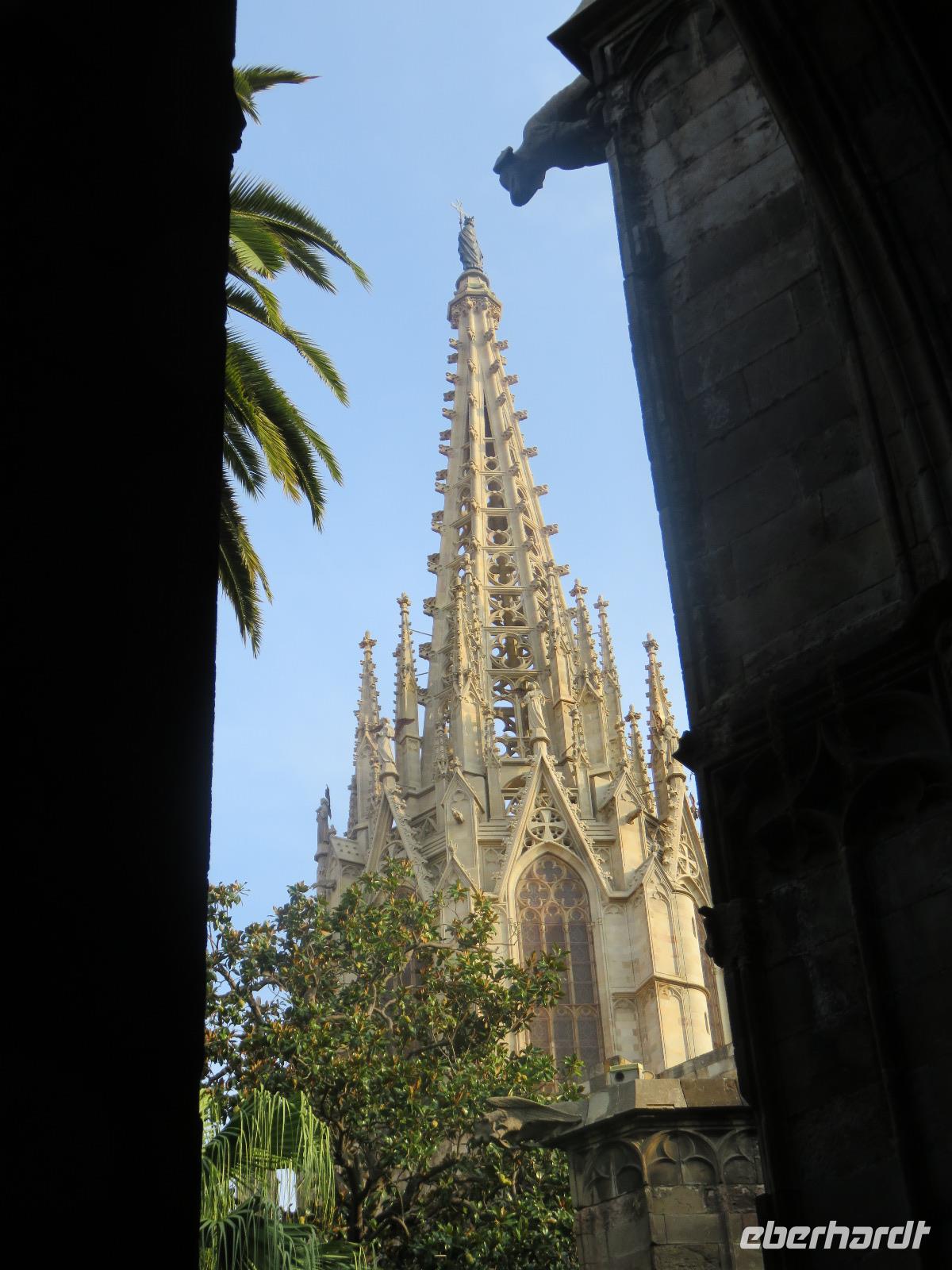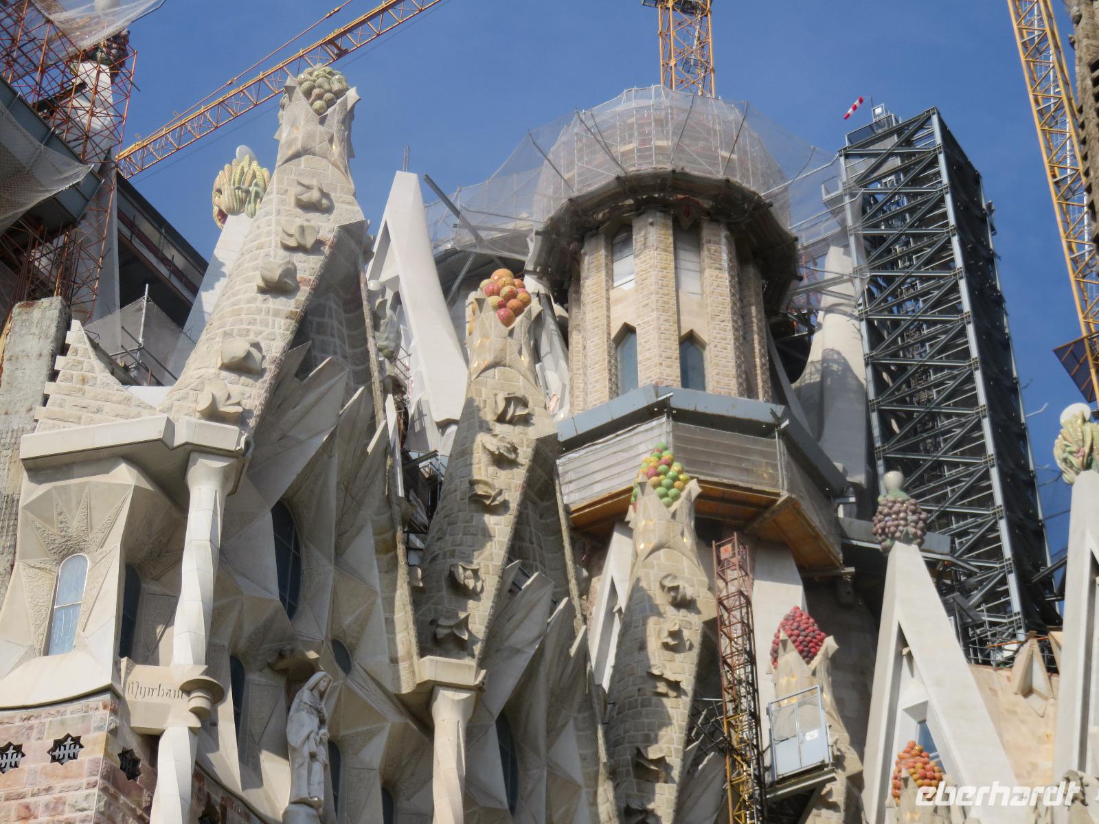 Wieder zeigte sich die Sonne vom fast wolkenlosen Himmel. Wir trafen uns im Theater und die Mehrzahl der Gäste unserer Gruppe begab sich auf die Besichtigungstour in der Hauptstadt Kataloniens. Mit Joke, einer Holländerin, spazierten wir zuerst durch die Altstadt mit dem Barri Gòtic, dem Gotischen Viertel, zur gewaltigen Kathedrale Santa Eulàlia, die wir auch von Innen besichtigten. Im Chorgestühl sahen wir die Wappen der Ritter des Goldenen Vlieses, im Kreuzgang sahen wir die berühmte Gänse, die an die Legende der Heiligen Eulalia erinnern. Vorbei an der alten Stadtmauer und dem Äquadukt, der alten römischen Wasserleitung, erreichten wir den Katalanischen Platz. Nun fuhren wir zu Sagrada Familie, dem Hauptwahrzeichen von Barcelona. Schon am Vorabend eindrucksvoll präsentierte sich nun das Bauwerk im Stil der Modernisme mit einer bereits bunten Fassade, auch wenn die Haupttürme noch fehlen! Joke erläuterte einzelne Elemente der Fassaden und wir kamen erneut ins Staunen über die Fülle an Darstellungen und die Phantasie Gaudís. Einzigartig, wie es Architekten gegenwärtig umsetzen und arrangieren.