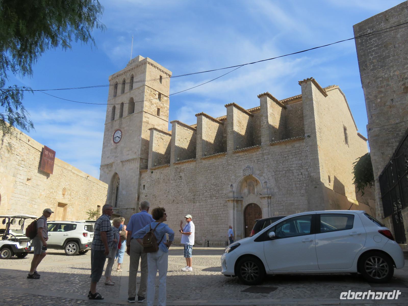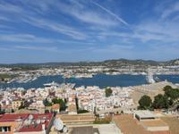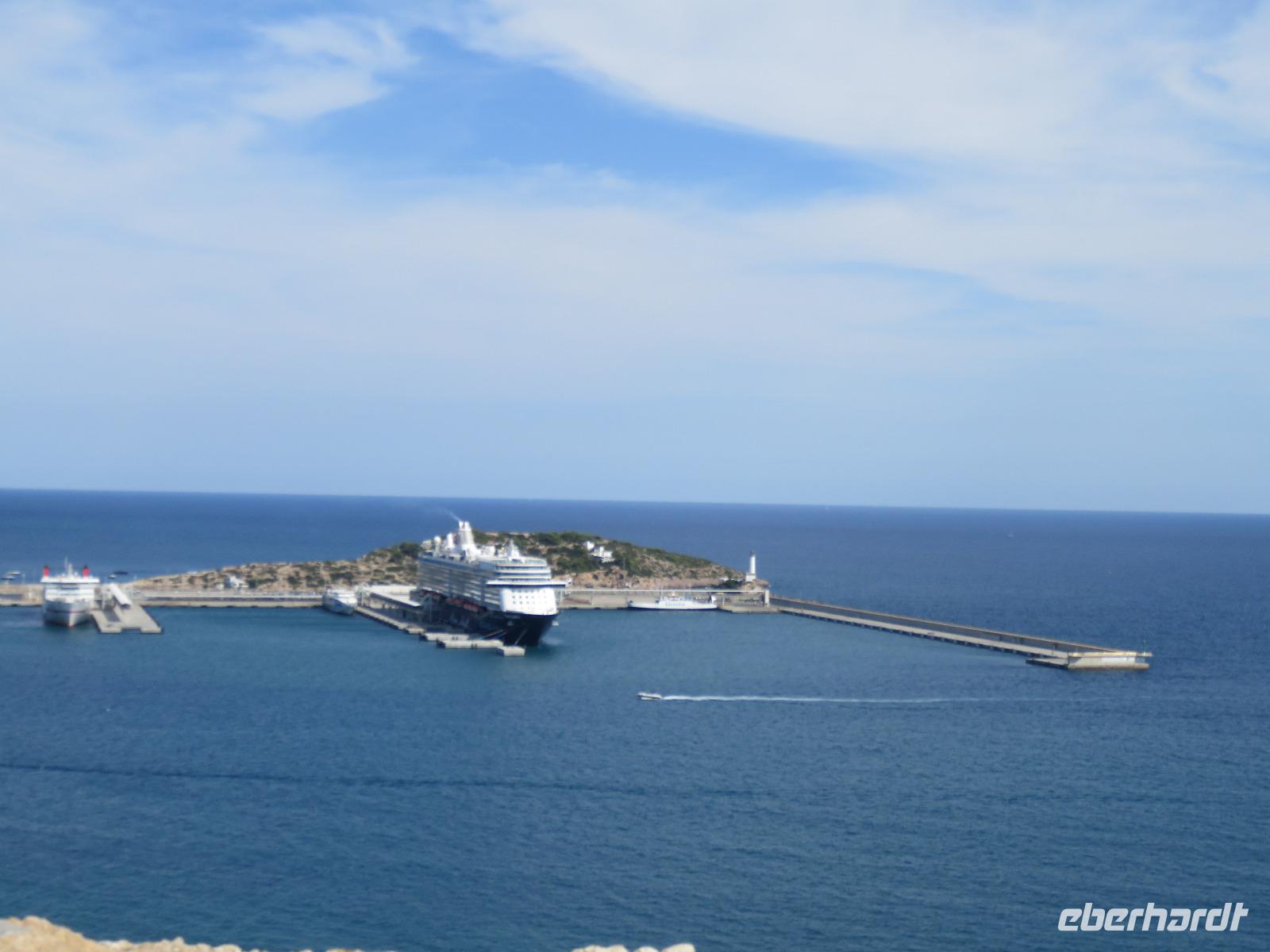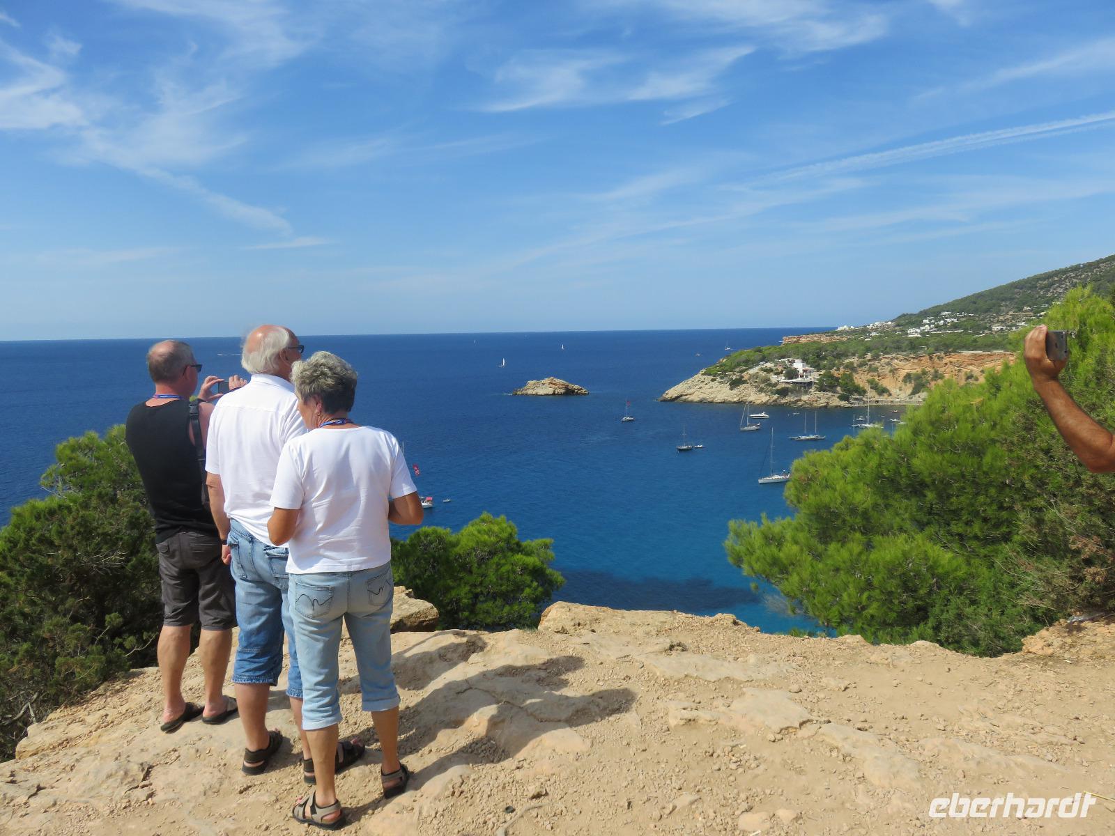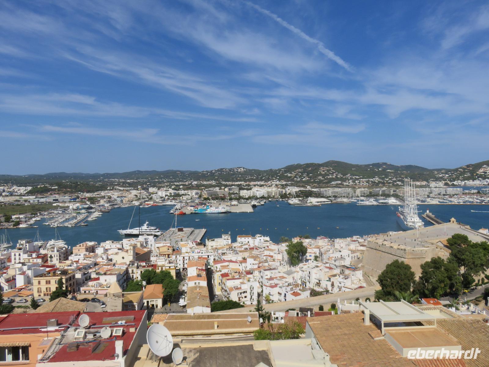 Nach einem späten Frühstück genossen wir den Vormittag an Bord. Am Mittag trafen wir uns mit Francisca zu unserer kleinen Inselrundfahrt auf der Nachbarinsel von Mallorca und drittgrößten Insel der Balearen, damit unserem dritten Eberhardt-Inklusiv-Ausflug. Auf der Landschaftstour in Richtung Westküste berichtete unsere örtliche Reiseleiterin über das Leben auf der Insel, die Geschichte und aktuelle Probleme. Auch hier ist zu spüren, dass die Bewohner sich nach einem gemäßigten Tourismus sehnen ... Sie haben gern Gäste, aber so, dass es für Mensch, Tier und die Natur verkraftbar ist. Zuerst erreichten wir den Aussichtspunkt in der Cala d'Hort mit Blick zur kleinen Insel Es Vedra. Wir genossen den Blick auf das türkisblaue Meer, das sich in unterschiedlichen Nuancen zeigte. Erneut durch die anmutige Landschaft der Insel, vorbei an kleinen Fincas, Weinfeldern, Kaki-bäume (bei uns auch als Sharon-Frucht bekannt) und Kapernsträuchern erreichten wir die Bucht von Es Cubells mit der Katholischen Kirche Nuestra Seniora del Carmen, die weiß in der Sonne strahlte. Bei klarem, sonnigen Wetter konnten wir am Horizont die Insel Formentera erkennen. Anschließend fuhren wir hinauf zur Ober- und Altstadt von Ibiza. Wir spazierten zuerst durch die alte, wehrhafte Stadtmauer aus dem 16. Jahrhundert hindurch. Diese ist 21 Meter hoch und bis zu 4 Meter dick, also nehmen wir den Tunnel mit seinen gut ausgebauten Stufen hinauf zum Aussichtspunkt zum Hafen und zur Nachbarinsel Formentera. Von der Terrasse an der Kathedrale eröffnete sich uns ein fantastischer Panoramablick auf die Unterstadt und den Hafen mit unserem schwimmenden Hotel.