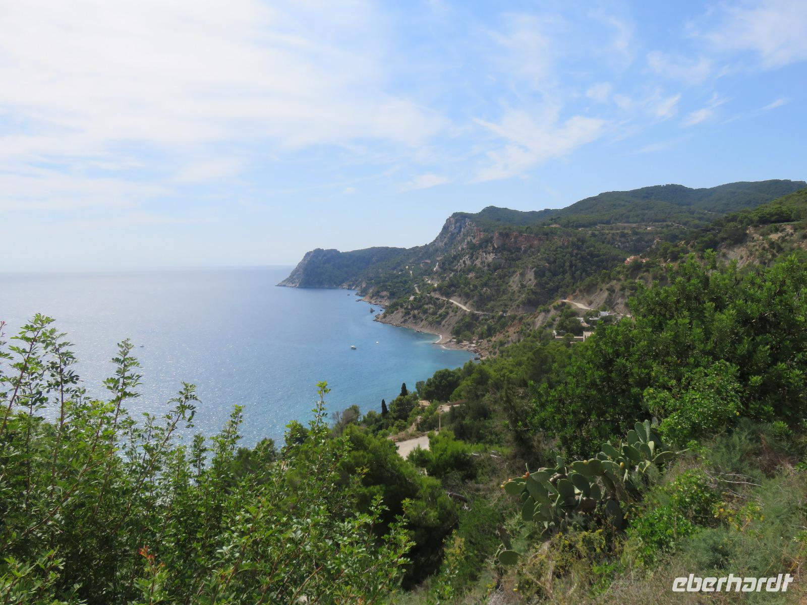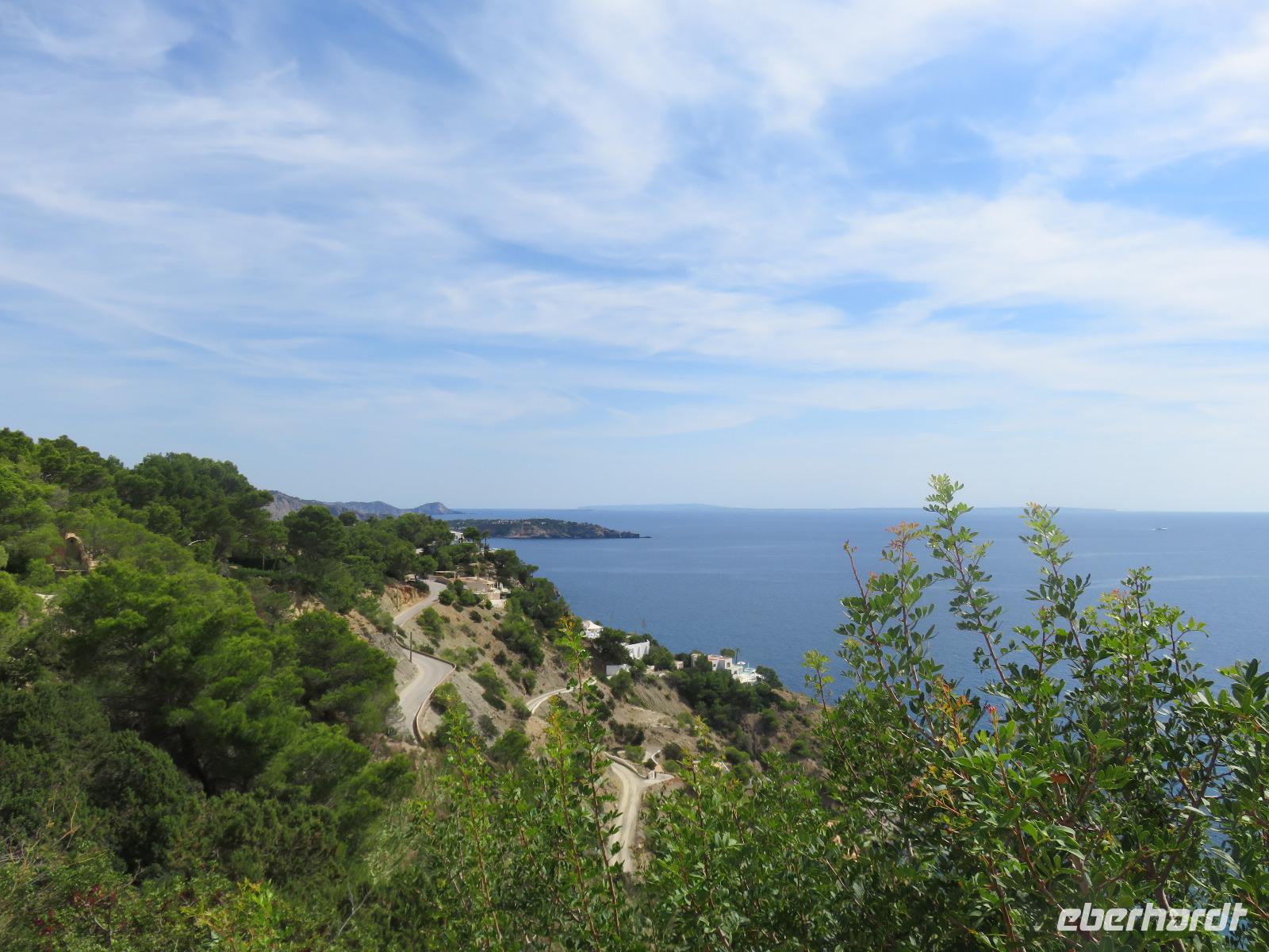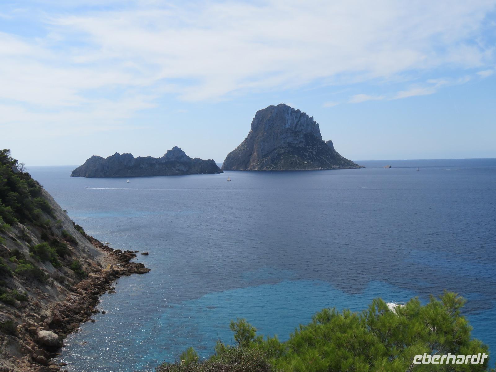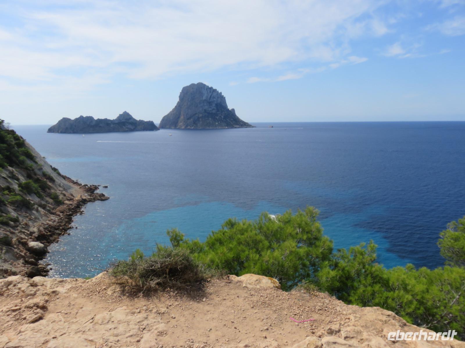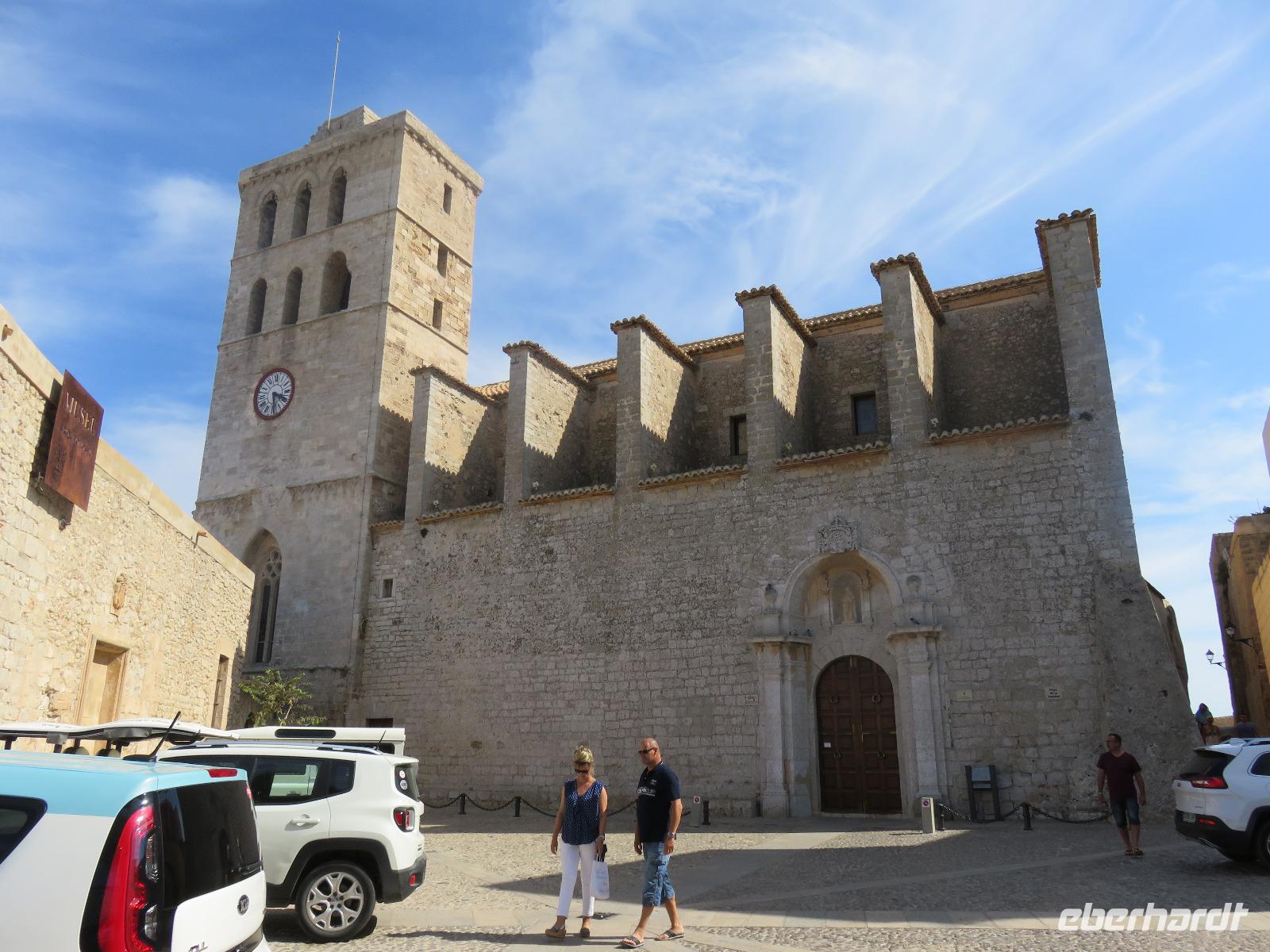 Nach einem späten Frühstück genossen wir den Vormittag an Bord. Am Mittag trafen wir uns mit Francisca zu unserer kleinen Inselrundfahrt auf der Nachbarinsel von Mallorca und drittgrößten Insel der Balearen, damit unserem dritten Eberhardt-Inklusiv-Ausflug. Auf der Landschaftstour in Richtung Westküste berichtete unsere örtliche Reiseleiterin über das Leben auf der Insel, die Geschichte und aktuelle Probleme. Auch hier ist zu spüren, dass die Bewohner sich nach einem gemäßigten Tourismus sehnen ... Sie haben gern Gäste, aber so, dass es für Mensch, Tier und die Natur verkraftbar ist. Zuerst erreichten wir den Aussichtspunkt in der Cala d'Hort mit Blick zur kleinen Insel Es Vedra. Wir genossen den Blick auf das türkisblaue Meer, das sich in unterschiedlichen Nuancen zeigte. Erneut durch die anmutige Landschaft der Insel, vorbei an kleinen Fincas, Weinfeldern, Kaki-bäume (bei uns auch als Sharon-Frucht bekannt) und Kapernsträuchern erreichten wir die Bucht von Es Cubells mit der Katholischen Kirche Nuestra Seniora del Carmen, die weiß in der Sonne strahlte. Bei klarem, sonnigen Wetter konnten wir am Horizont die Insel Formentera erkennen. Anschließend fuhren wir hinauf zur Ober- und Altstadt von Ibiza. Wir spazierten zuerst durch die alte, wehrhafte Stadtmauer aus dem 16. Jahrhundert hindurch. Diese ist 21 Meter hoch und bis zu 4 Meter dick, also nehmen wir den Tunnel mit seinen gut ausgebauten Stufen hinauf zum Aussichtspunkt zum Hafen und zur Nachbarinsel Formentera. Von der Terrasse an der Kathedrale eröffnete sich uns ein fantastischer Panoramablick auf die Unterstadt und den Hafen mit unserem schwimmenden Hotel.