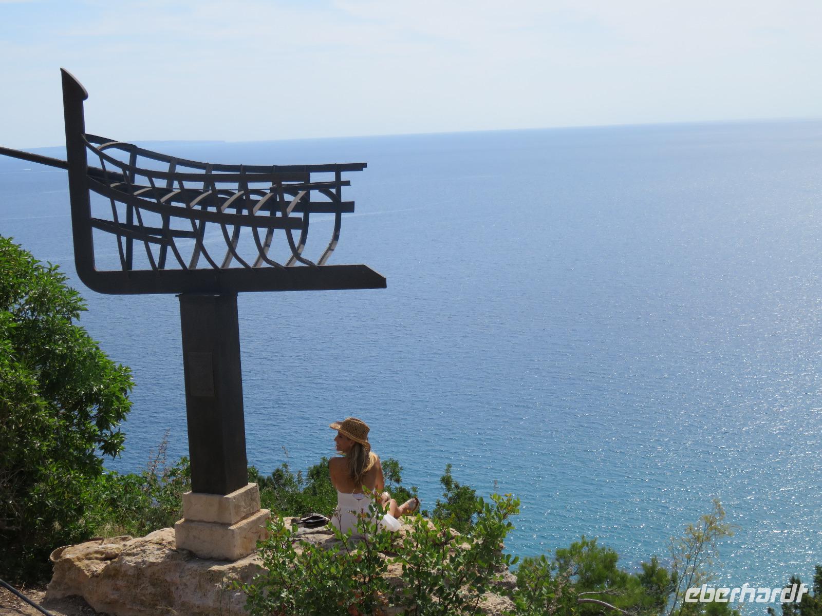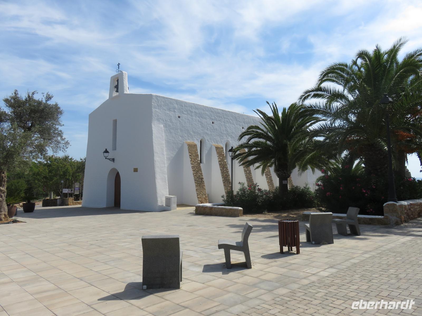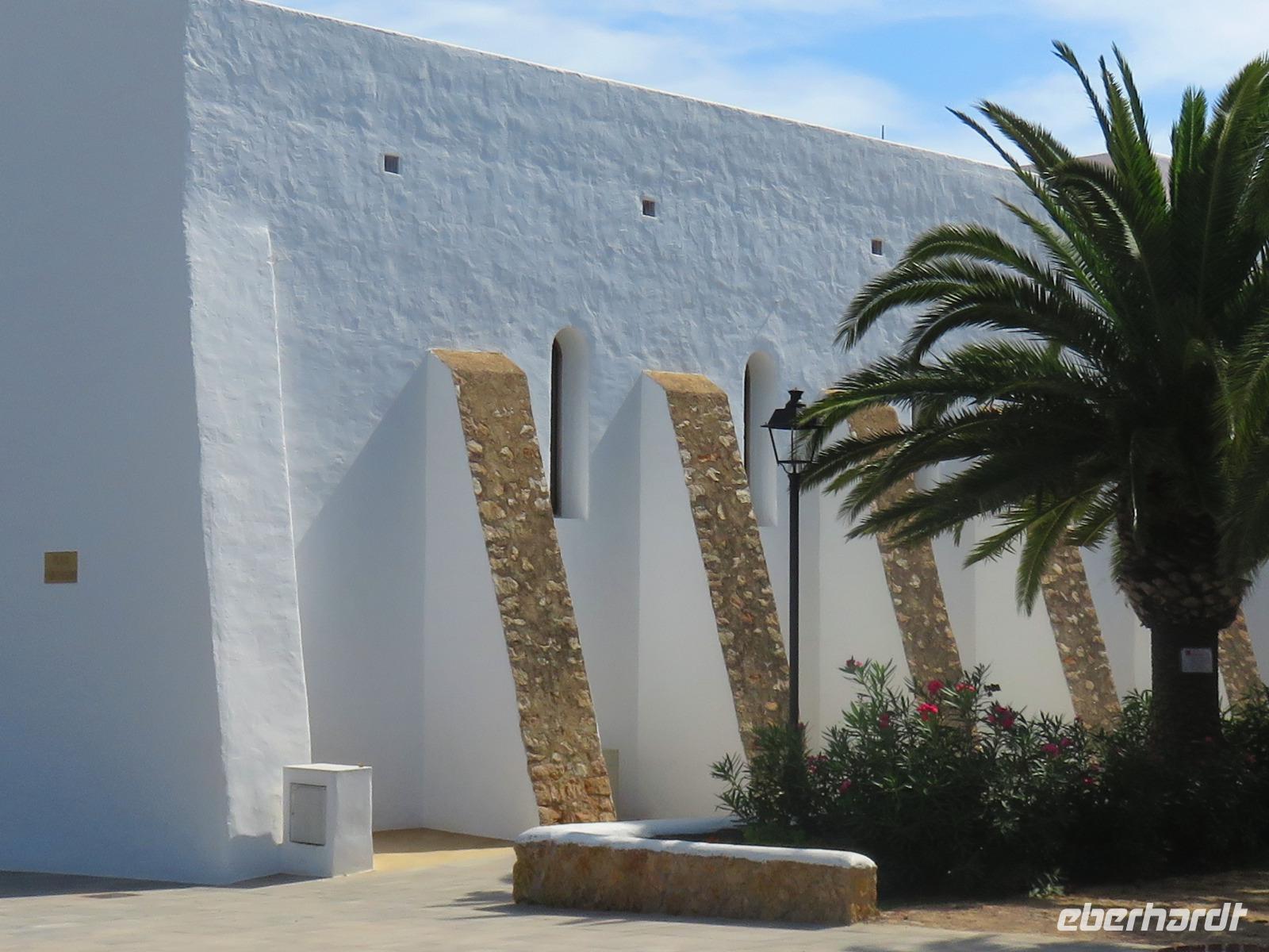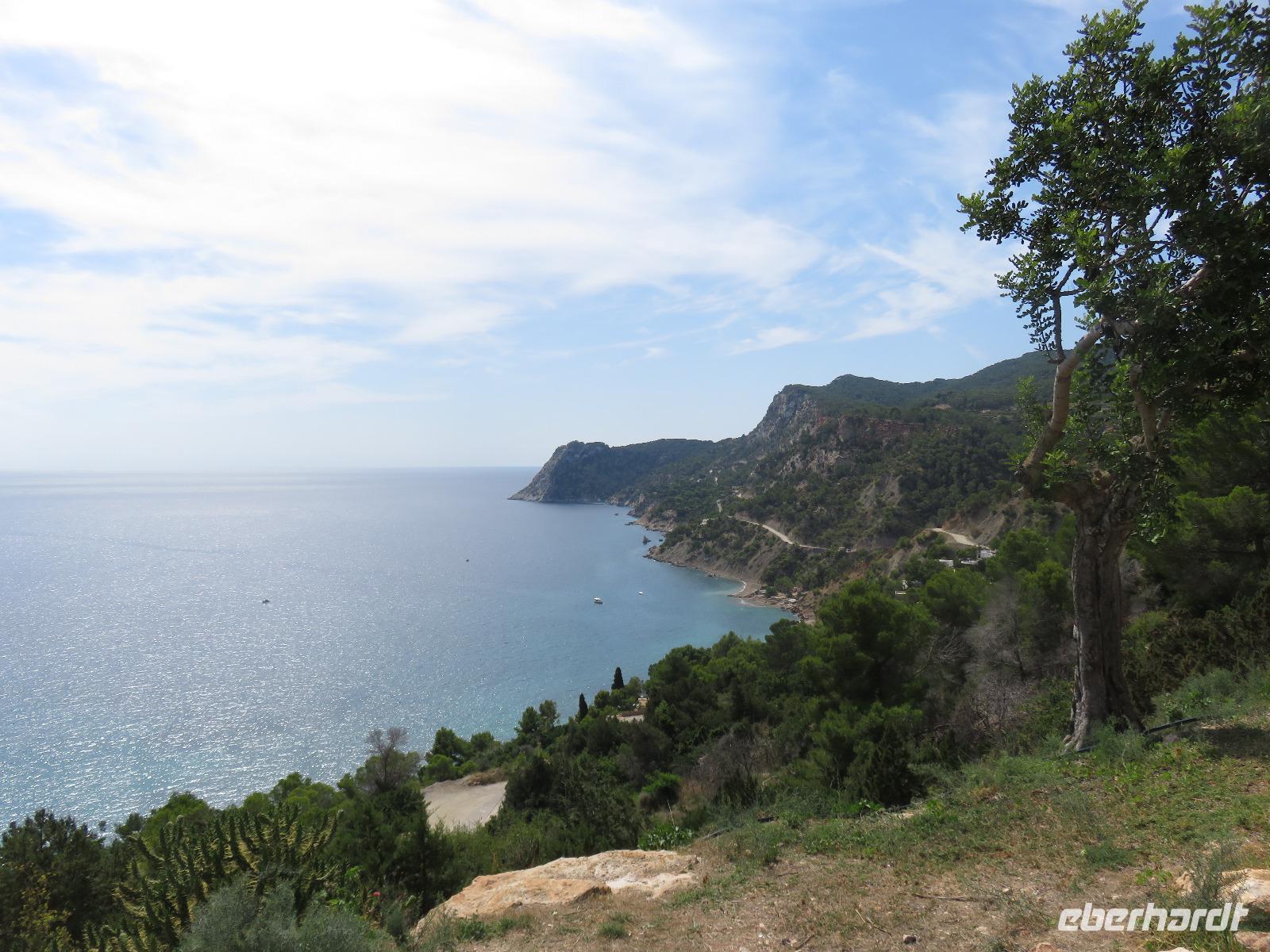 Nach einem späten Frühstück genossen wir den Vormittag an Bord. Am Mittag trafen wir uns mit Francisca zu unserer kleinen Inselrundfahrt auf der Nachbarinsel von Mallorca und drittgrößten Insel der Balearen, damit unserem dritten Eberhardt-Inklusiv-Ausflug. Auf der Landschaftstour in Richtung Westküste berichtete unsere örtliche Reiseleiterin über das Leben auf der Insel, die Geschichte und aktuelle Probleme. Auch hier ist zu spüren, dass die Bewohner sich nach einem gemäßigten Tourismus sehnen ... Sie haben gern Gäste, aber so, dass es für Mensch, Tier und die Natur verkraftbar ist. Zuerst erreichten wir den Aussichtspunkt in der Cala d'Hort mit Blick zur kleinen Insel Es Vedra. Wir genossen den Blick auf das türkisblaue Meer, das sich in unterschiedlichen Nuancen zeigte. Erneut durch die anmutige Landschaft der Insel, vorbei an kleinen Fincas, Weinfeldern, Kaki-bäume (bei uns auch als Sharon-Frucht bekannt) und Kapernsträuchern erreichten wir die Bucht von Es Cubells mit der Katholischen Kirche Nuestra Seniora del Carmen, die weiß in der Sonne strahlte. Bei klarem, sonnigen Wetter konnten wir am Horizont die Insel Formentera erkennen. Anschließend fuhren wir hinauf zur Ober- und Altstadt von Ibiza. Wir spazierten zuerst durch die alte, wehrhafte Stadtmauer aus dem 16. Jahrhundert hindurch. Diese ist 21 Meter hoch und bis zu 4 Meter dick, also nehmen wir den Tunnel mit seinen gut ausgebauten Stufen hinauf zum Aussichtspunkt zum Hafen und zur Nachbarinsel Formentera. Von der Terrasse an der Kathedrale eröffnete sich uns ein fantastischer Panoramablick auf die Unterstadt und den Hafen mit unserem schwimmenden Hotel.