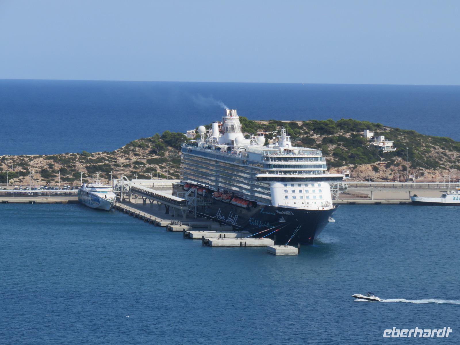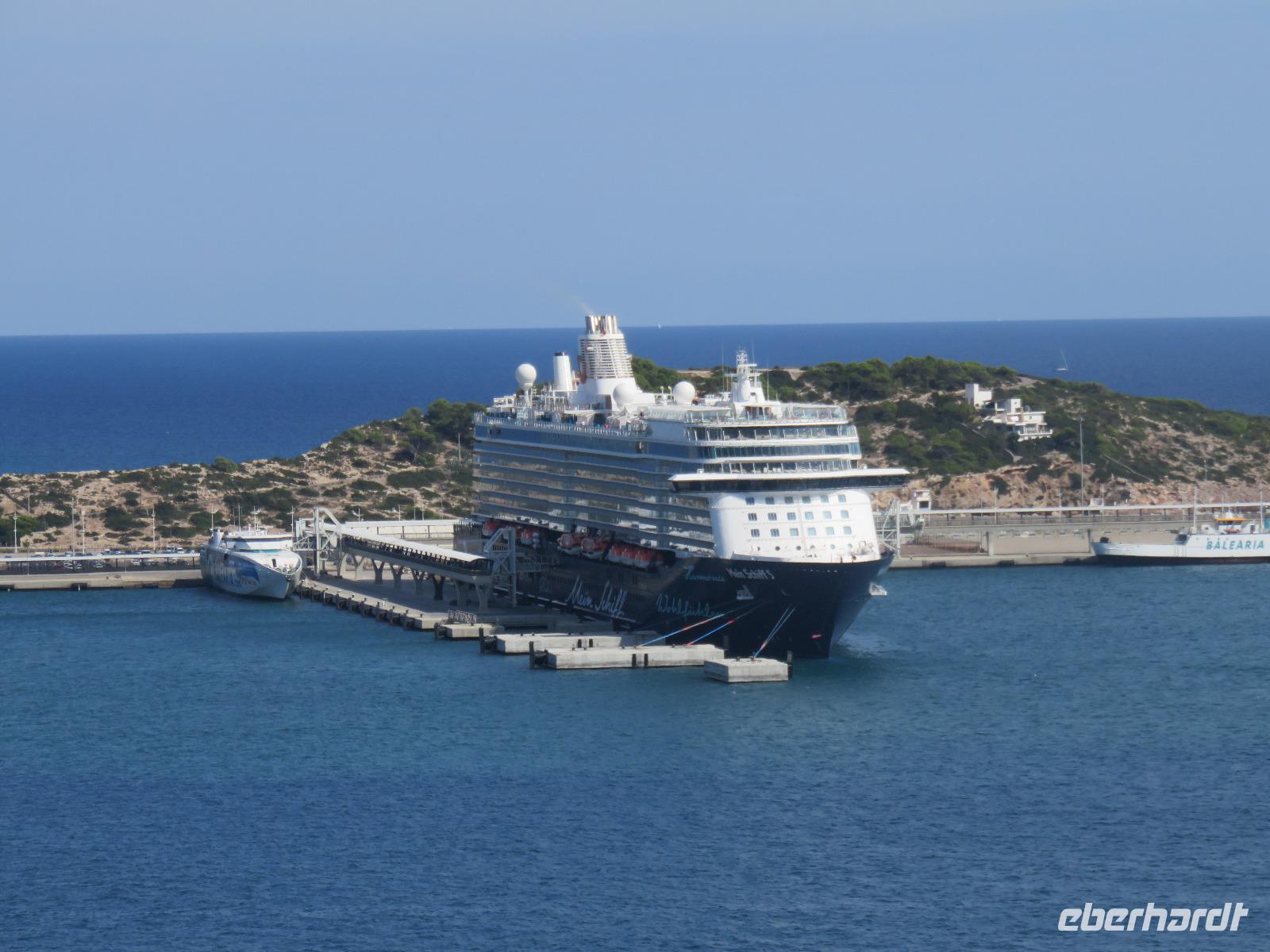 Auch heute bildete die Fahrt zum Montjuîc-Hügel den Abschluss. Unterwegs erblickten wir immer wieder gelungene Verbindungen historischer Gebäude mit modernen Elementen, zum Beispiel am Spanischen Platz mit der ehemaligen Stierkampfarena - heute ein modernes Kaufhaus im Inneren. Vorbei am National-Palast erreichten wir schließlich das Olympiastadion und dann den Balkon des Hügels. Von hier lag uns die Stadt praktisch zu Füßen und wir genossen die wunderbare Aussicht. Ja, Barcelona ist einen längeren Besuch wert. Wir hatten nur einige der Höhepunkte gesehen. Es lohnt sich wiederzukommen. Eberhardt TRAVEL bietet dazu interessante Möglichkeiten, auch in Kombination mit anderen Regionen und Städten Kataloniens. Der Nachmittag bot Zeit, zu individuellen Besichtigungen in Barcelona oder zum Entspannen an Bord. Am Abend erfreuten wir uns an unterschiedlichen Veranstaltungen, zum Beispiel der CREW-Show. Das Theater war bis zum letzten Platz gefüllt, als die MEIN SCHIFF-Talente ihre Tänze, Songs oder Theaterstücke darboten - tolle Stimmen ... Kreuzfahrtdirektorin Nina führte stimmungsvoll durch das Programm der besten Talente aus der 1.031 Mann umfassenden Crew. Nun hatte unser Schiff bereits Kurs auf Ibiza genommen.