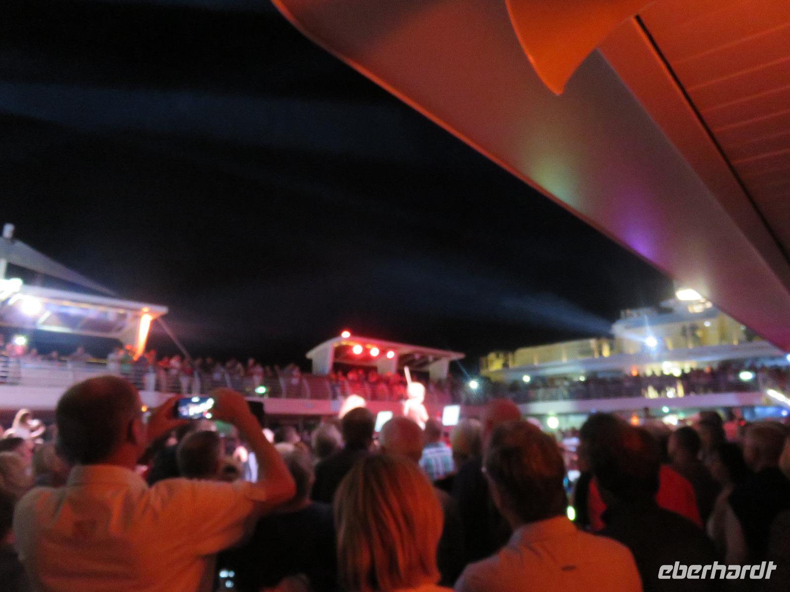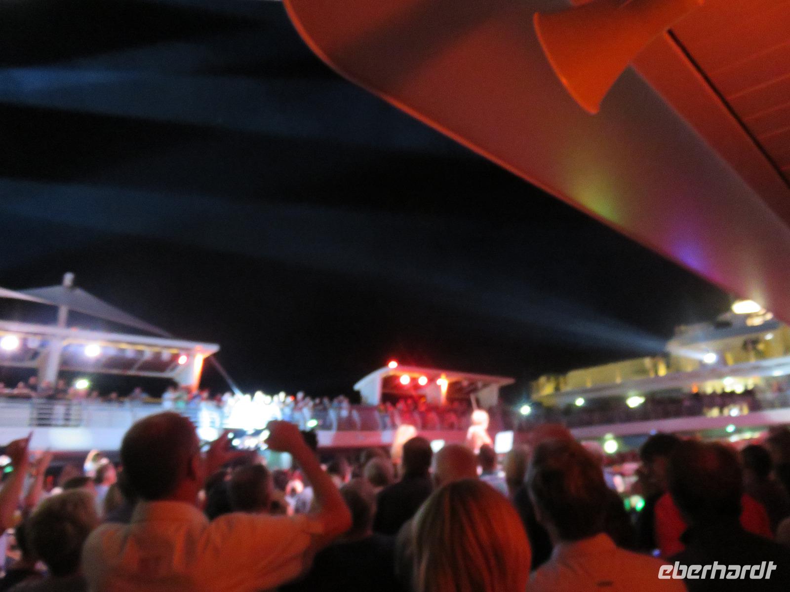 Das Bordleben bunt und unterhaltsam: Malkurs, Vorträge, Workshops, Konzertfilm und natürlich die erste Poolparty unserer Kreuzfahrt. Leider ging der Tag nicht so heiter zu Ende. Im wahrsten Sinn des Wortes viel die Party ins Wasser. Petrus meinte es nicht so gut und schickte uns Regen und ein Gewitter.
