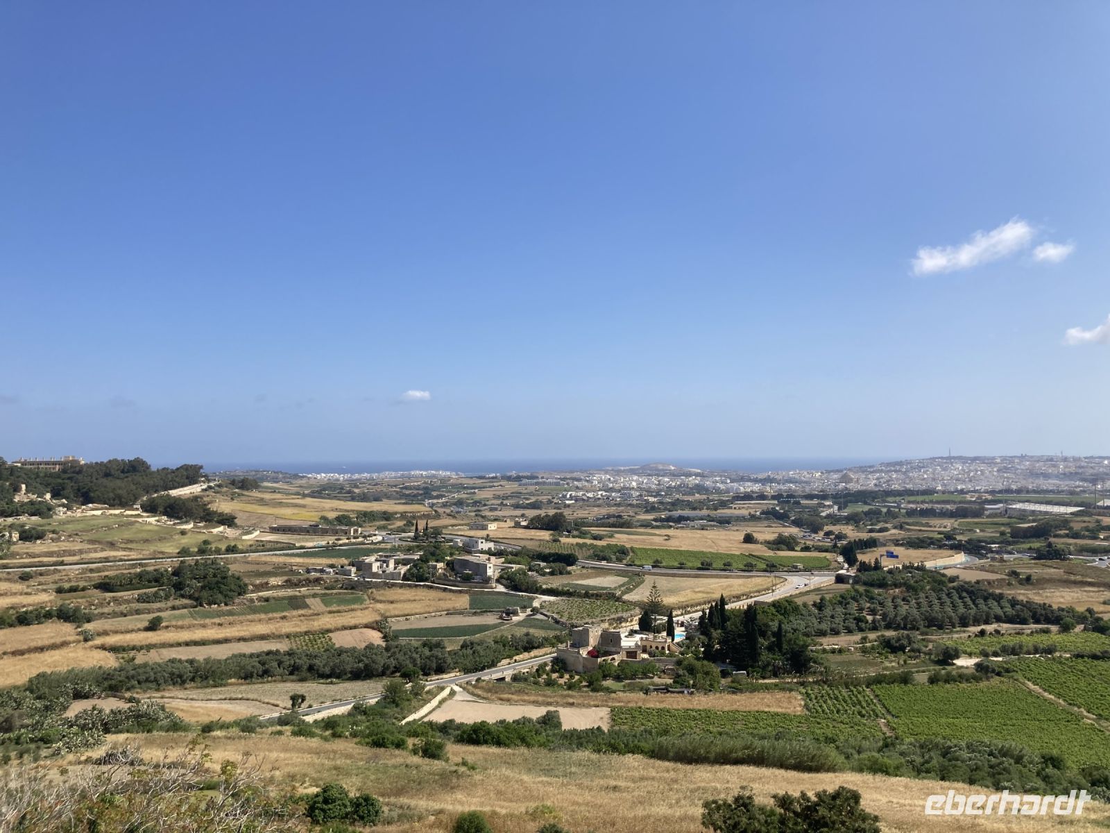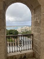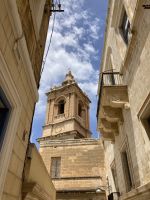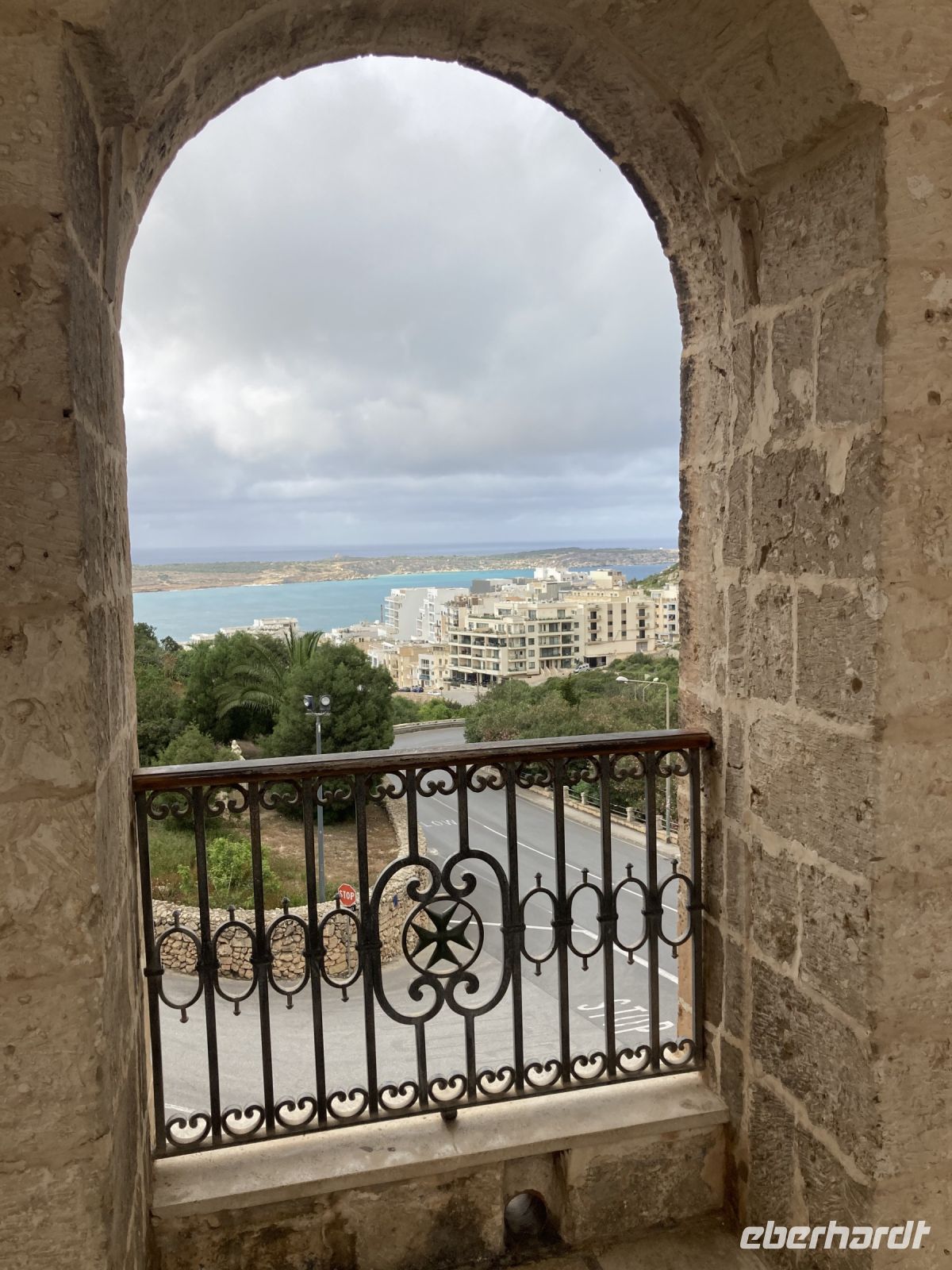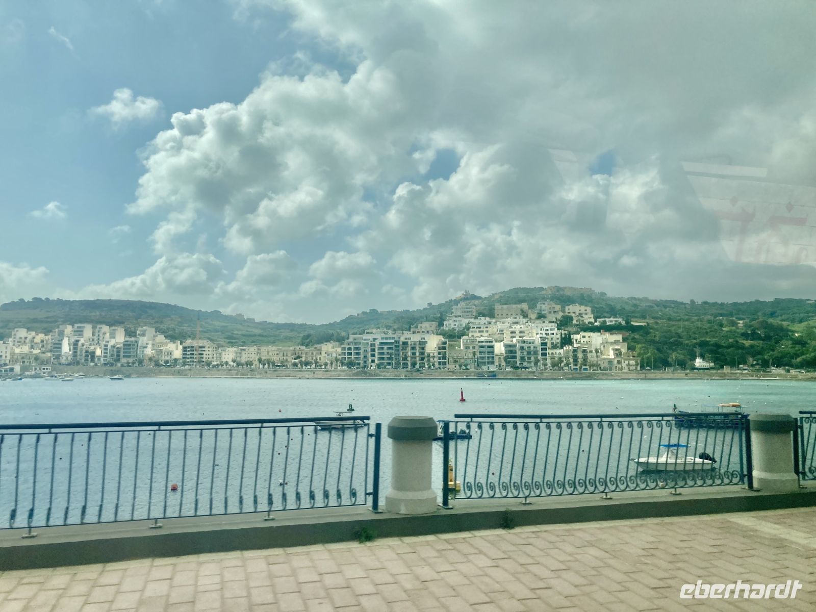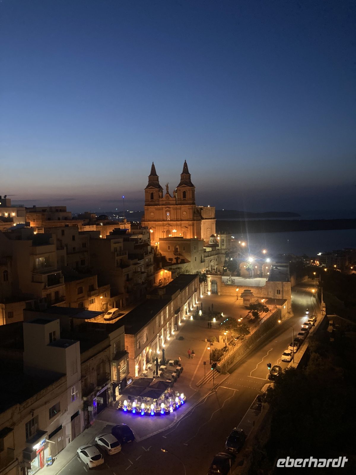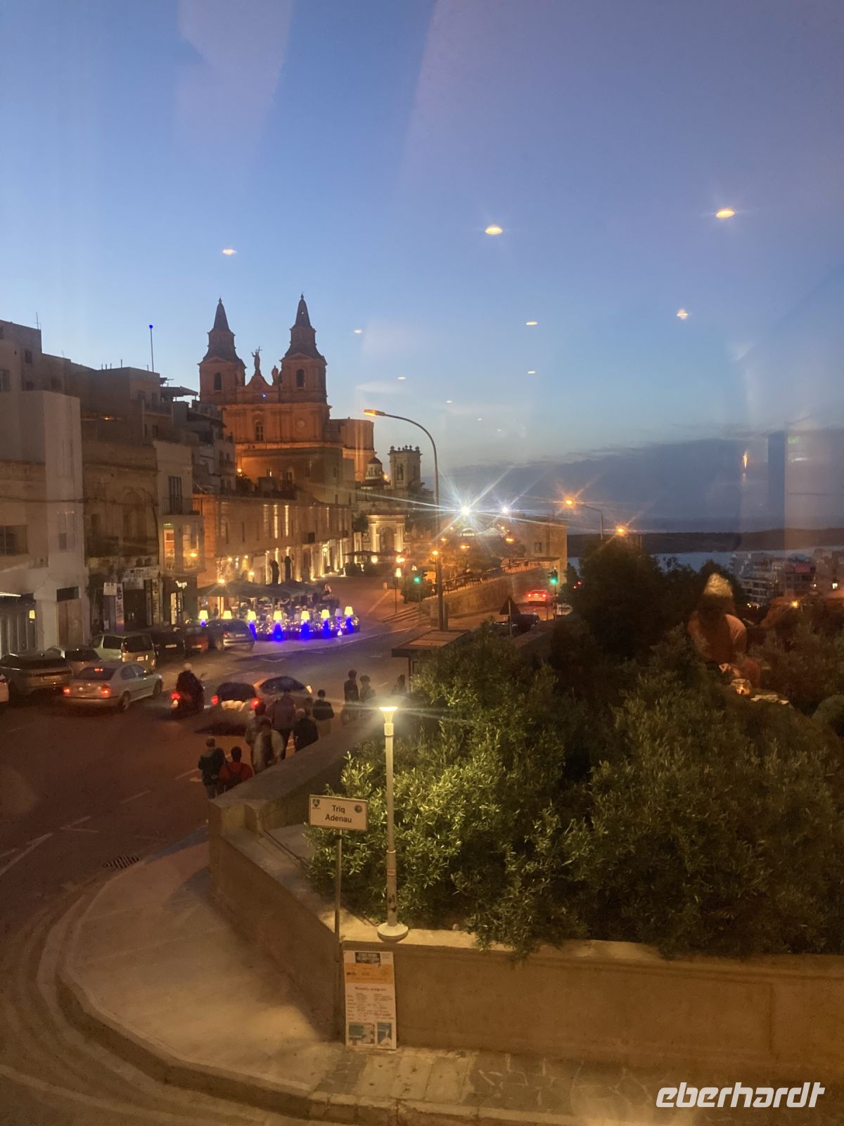 Früh fängt der Tag für uns an. 6:05 Uhr soll z.B. die Maschine in Dresden abheben. Und sie tut es auch. Leider die ab Leipzig jedoch nicht, technischer Defekt. So sind wir erst gegen Mitternacht komplett. Sehr freundlich werden wir im Hotel begrüßt und es gibt das colaähnliche, maltatypische Getränk zur Begrüßung. Obwohl es noch früh am Tag ist, können alle Zimmer bereits benutzt werden. Auch können wir vier Reisende begrüßen, die von Sizilien zu uns stoßen. Man kann diese Maltareise mit einer Sizilienrundreise kombinieren. Nach einer kleinen Pause machen wir den ersten Stadtrundgang durch Melliha, besichtigen Kirche und Friedhof. Natürlich darf der schöne Ausblick vom Freisitz der benachbarten Cocktailbar nicht versäumt werden.