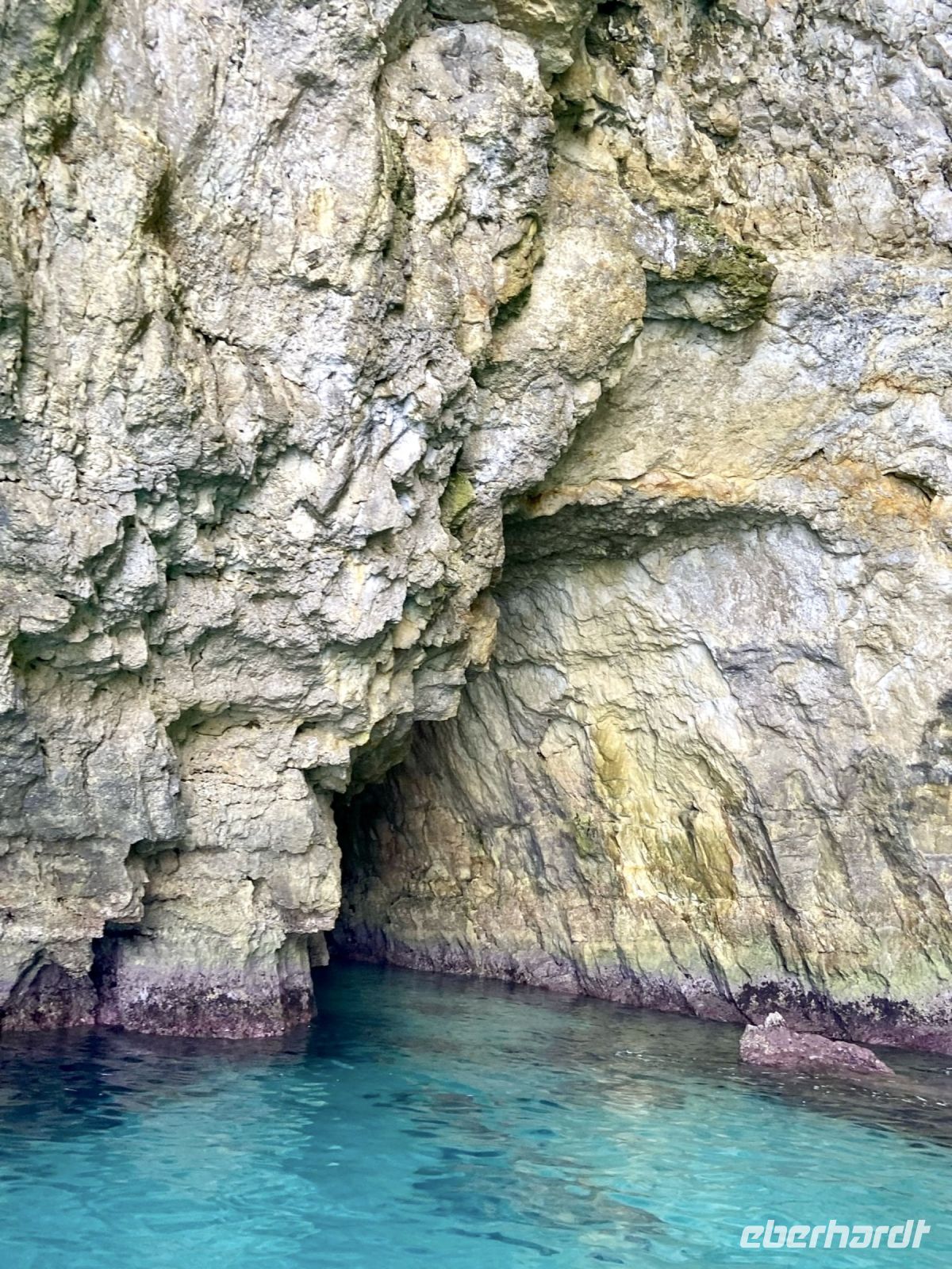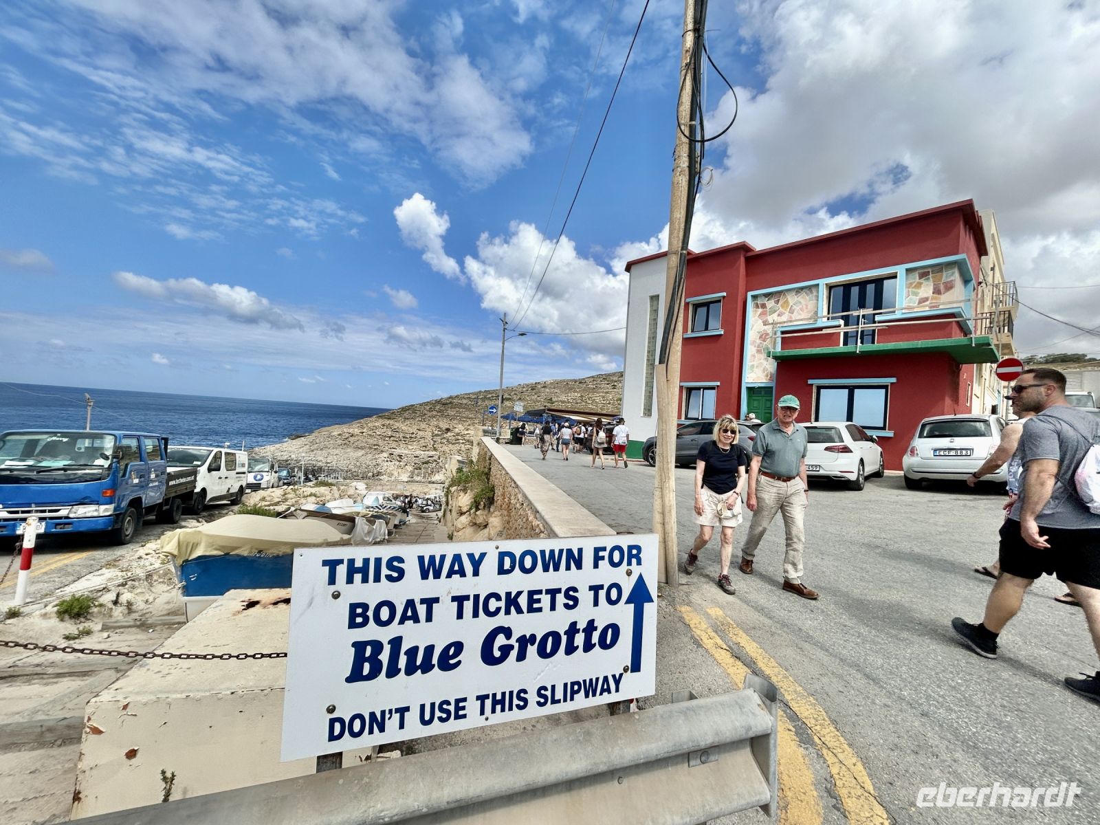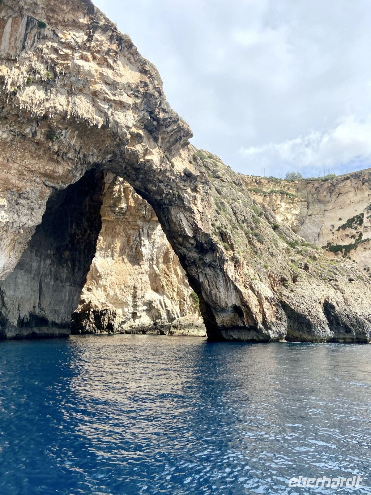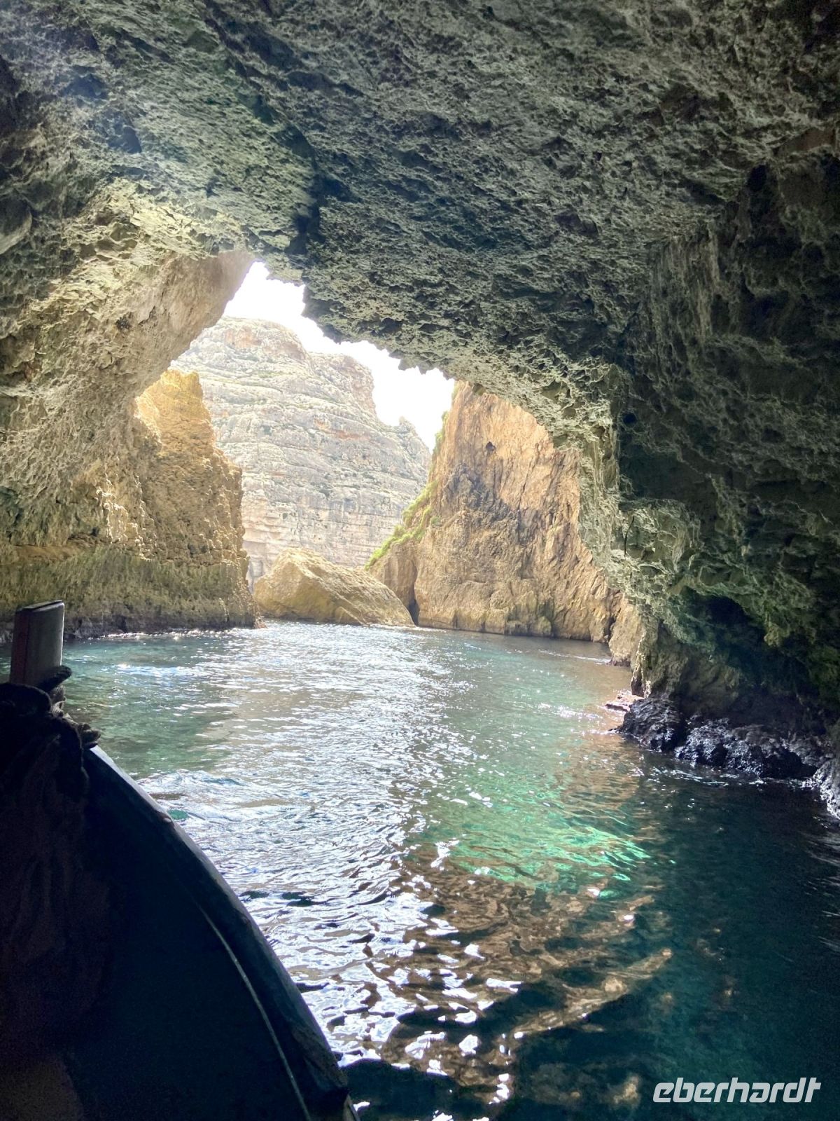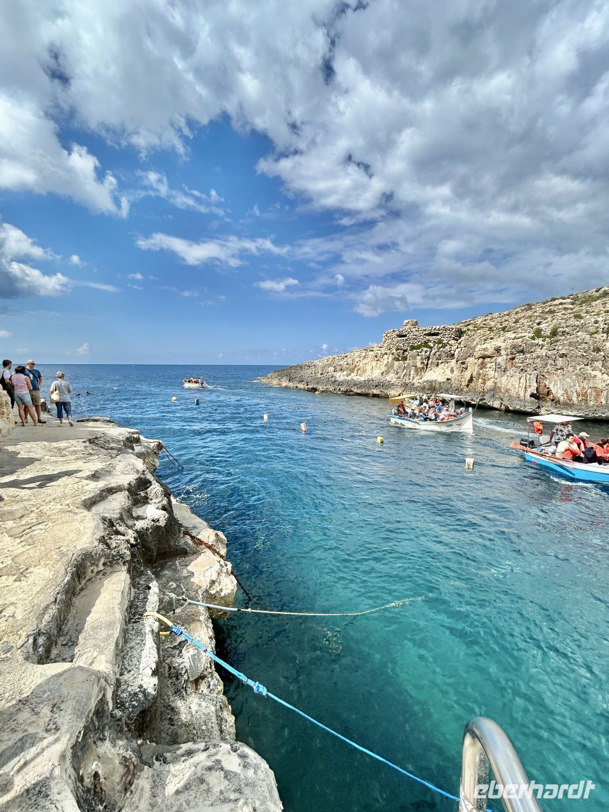 Gleich zu Beginn unserer Rundfahrt besuchen wir die Blue Grotto – ein Naturwunder aus Meer und Kalkstein. Das Wetter spielt mit, es ist nicht zu windig, wir steigen in der Bucht in eines der bunten Boote und schippern direkt zu den eindrucksvollen Küstenformationen. Das Lichtspiel im Wasser ist magisch, der würzige Geruch des Meeres sowie die sanfte Melodie der Wellen in der Grotte sind einfach zauberhaft.