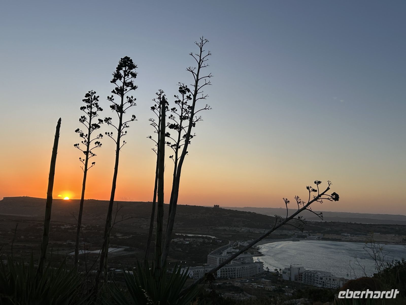 Am Abend spazieren wir zu einem Aussichtspunkt und trotzen etwas dem Abendwind. Mit Blick auf die Westküste, die am Horizont rot untergehende Sonne und die Strandbucht im Licht der blauen Stunde, spüren wir die Seele der Insel. Schade, dass wir da noch nichts von „Belvedere“ wussten… dem Aussichtspunkt auf der anderen Seite.