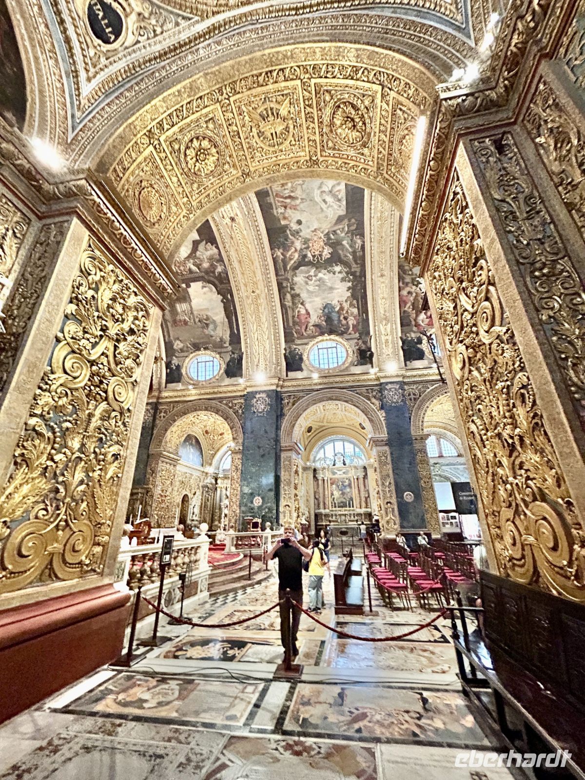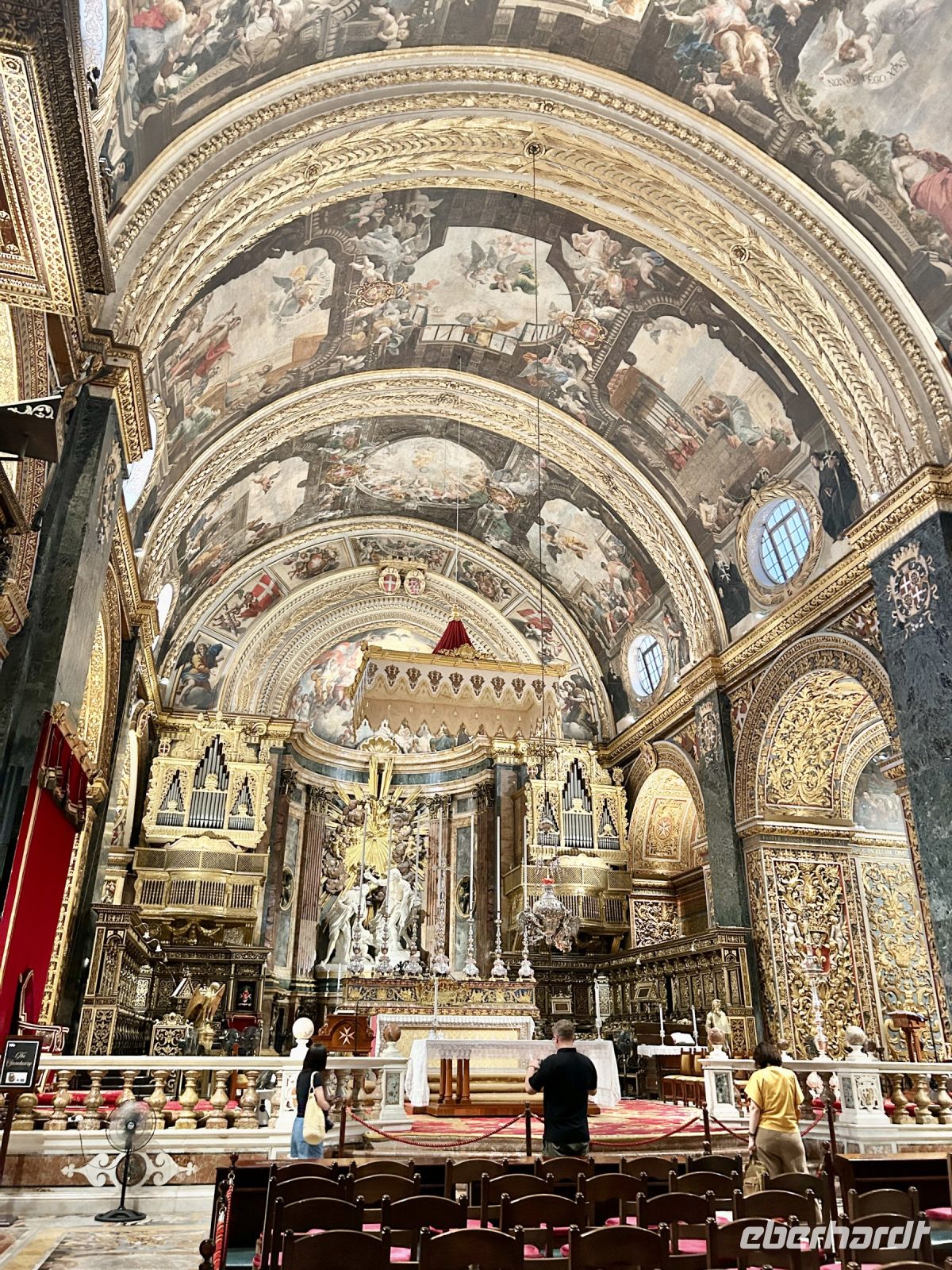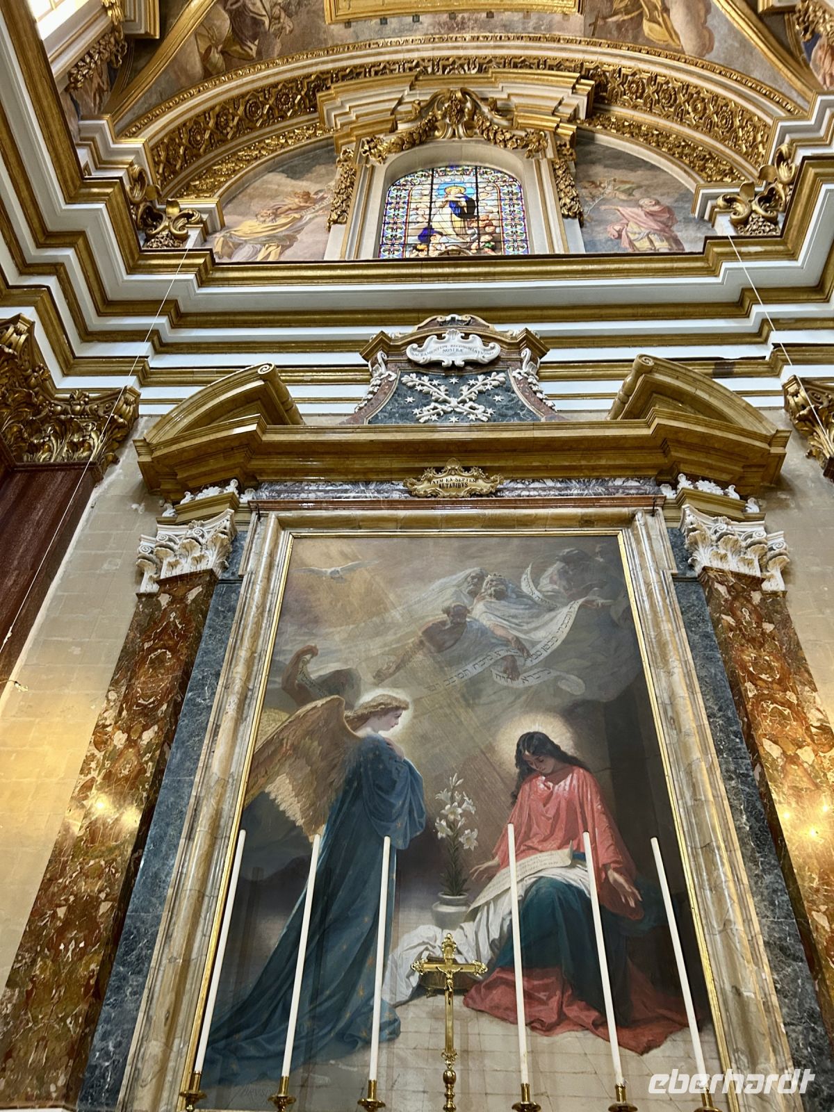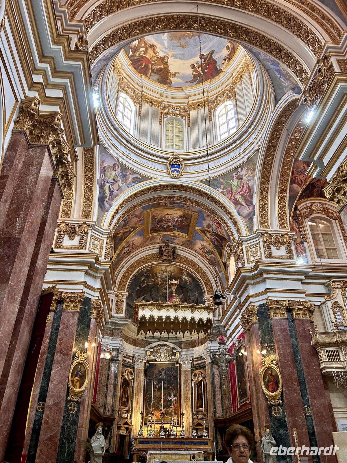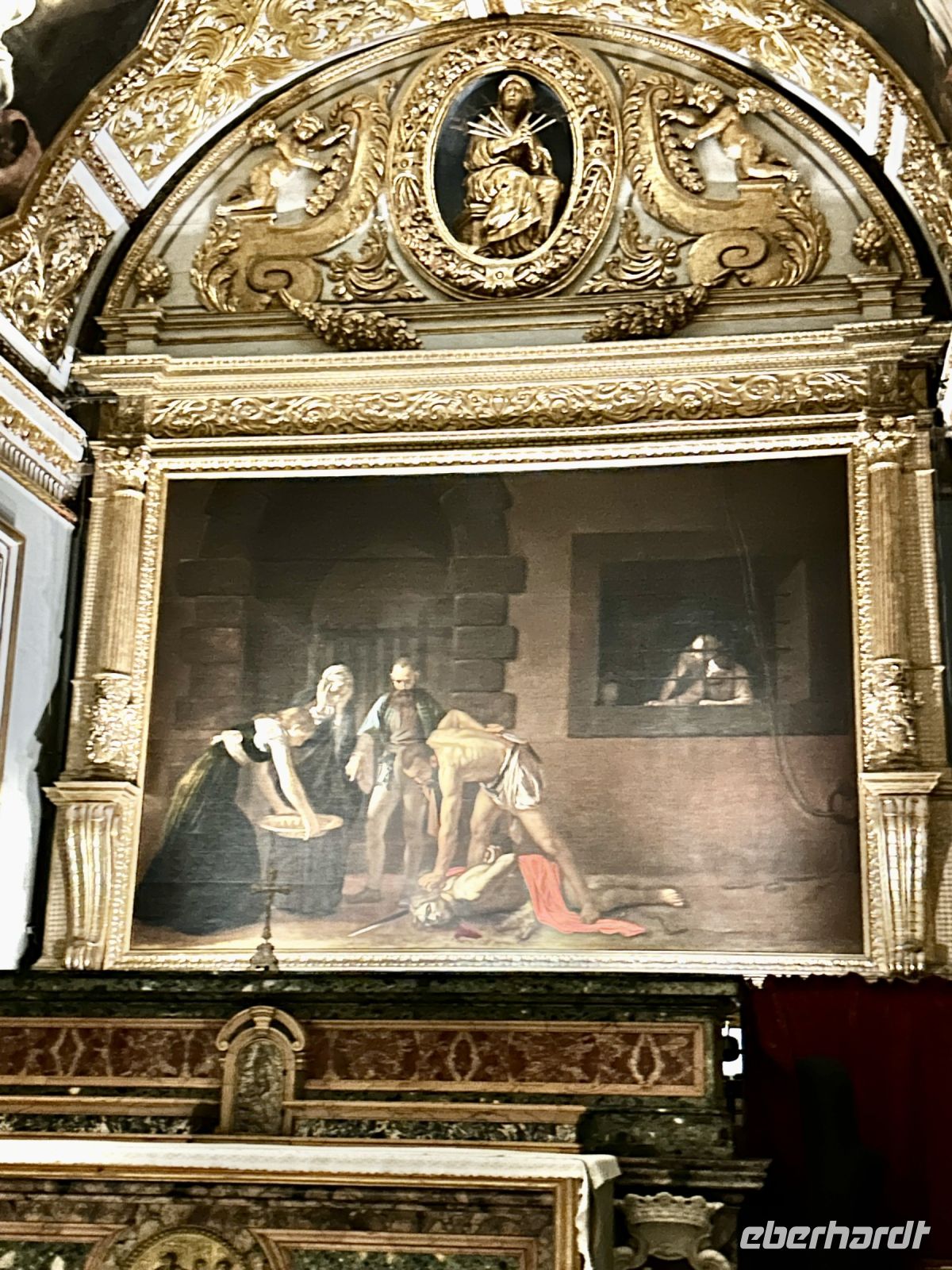 Wir bewundern die barocke St. John’s Co-Kathedrale mit ihren zahlreichen Kapellen beiderseits, wobei die italienische als besonders sehenswert betrachtet wird. Eindrucksvoll auch die Vielzahl der prachtvollen Grabplatten auf dem Fußboden, über die wir spazieren. Den Abschluss bildet der Saal mit Caravaggios Meisterwerk, die Enthauptung von Johannes. Wir erfahren von unserer lokalen Führerin, dass viele internationale Gruppen vor allem für den Besuch dieser Kathedrale nach Malta reisen. Eine Führung in Valetta wäre unvorstellbar ohne diese Kirche. Übrigens soll es in Malta 365 Kirchen geben, eine für jeden Tag!