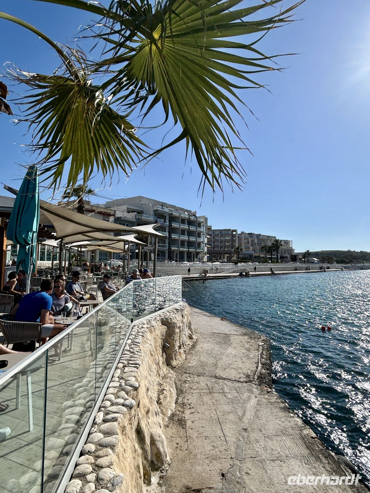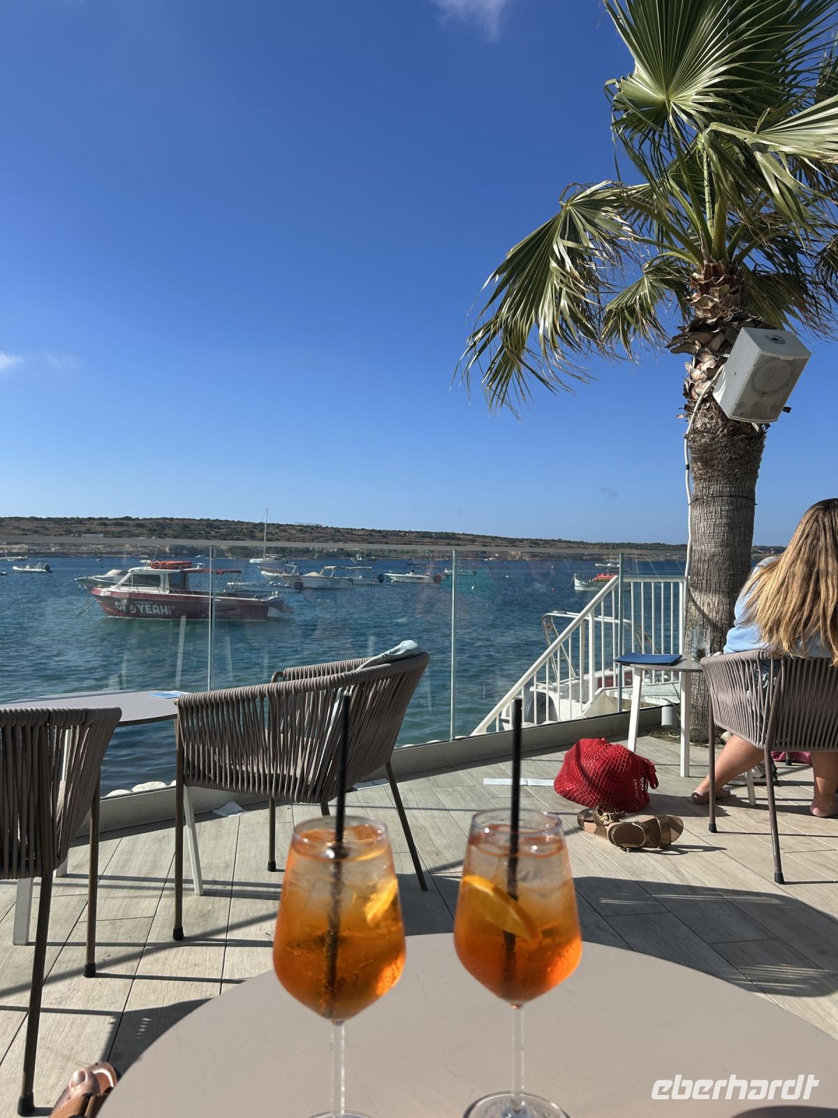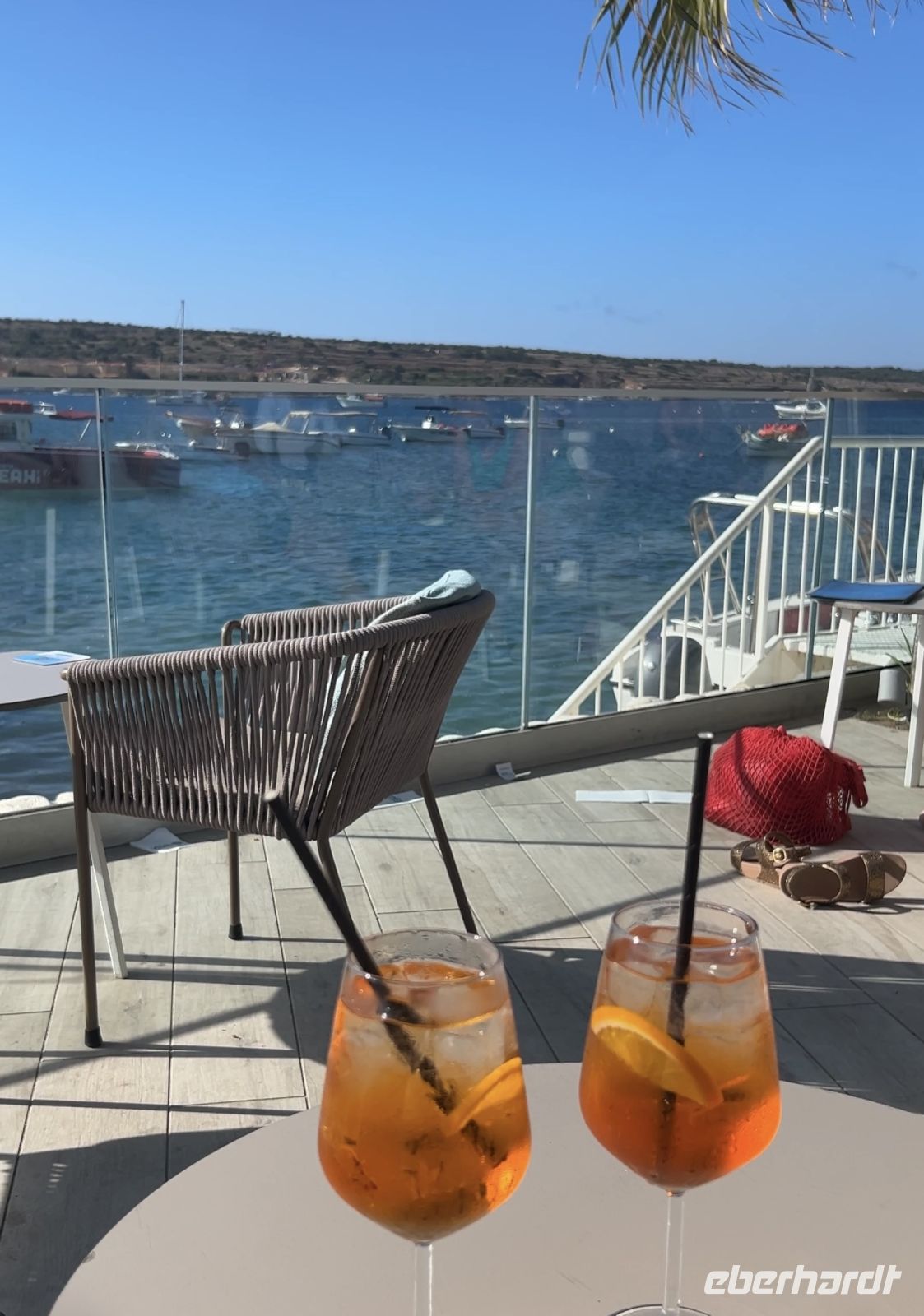 Nach so viel Kunst und Kultur soll die Ferienstimmung nicht zu kurz kommen. Wir steigen in der Bucht Ghadira, am Strand von Mellieha aus und genießen einen herrlich entspannten Abschluss des Nachmittags beim Chill-out auf der BLUE-Terrasse direkt am Wasser. Leckere Cocktails, beschwingte Musik…so kommt das Urlaubsfeeling zum Tragen.