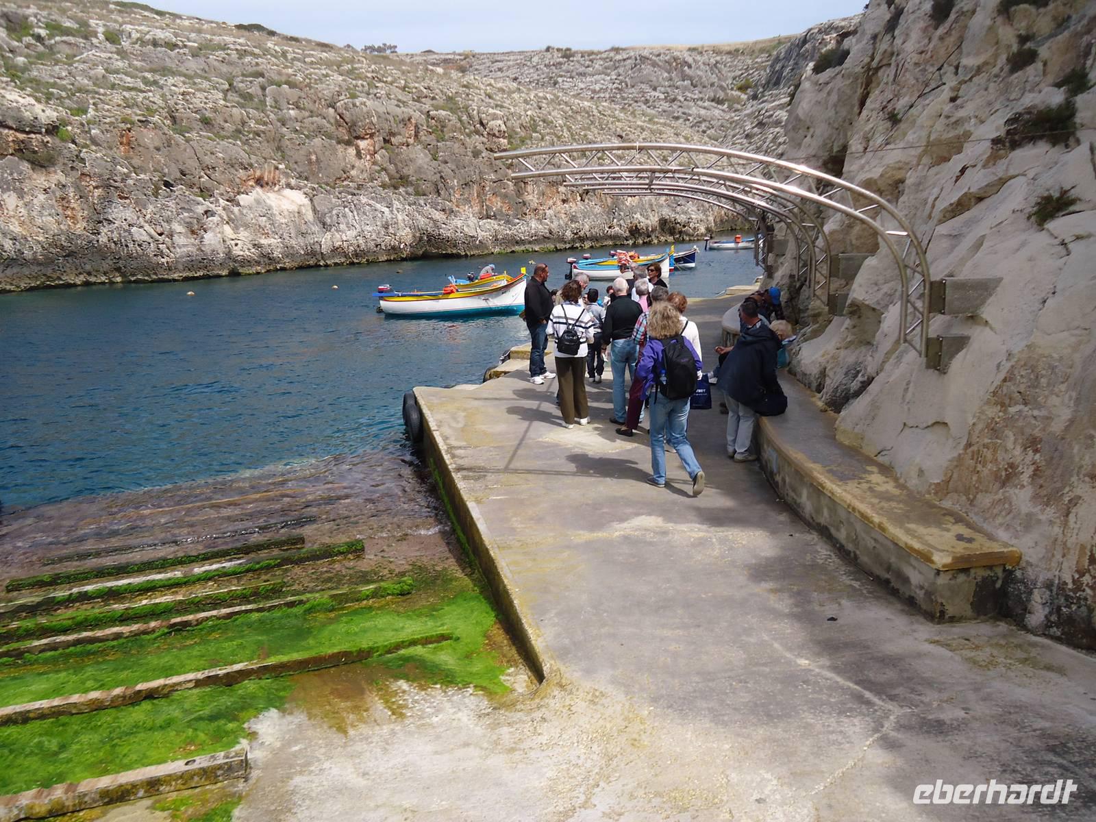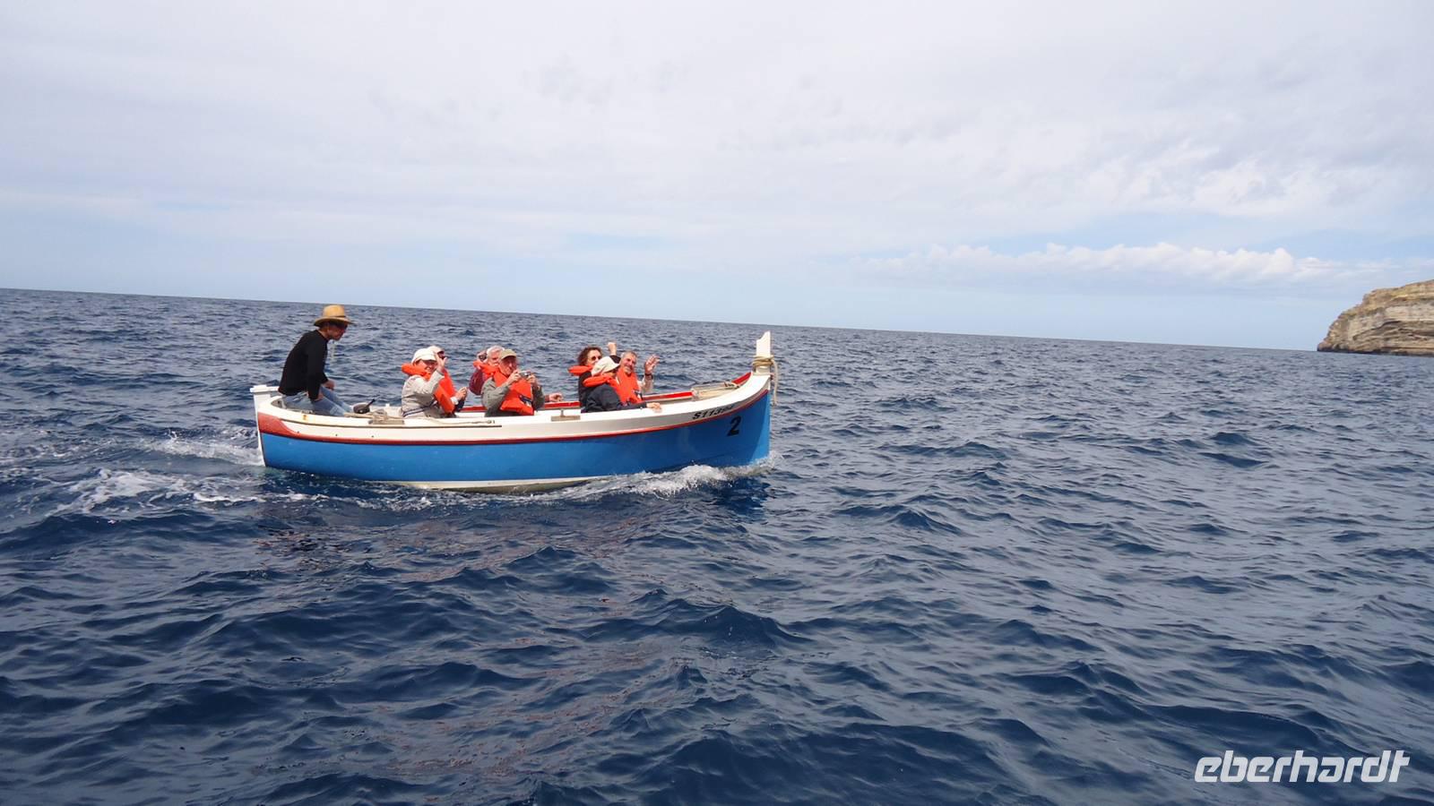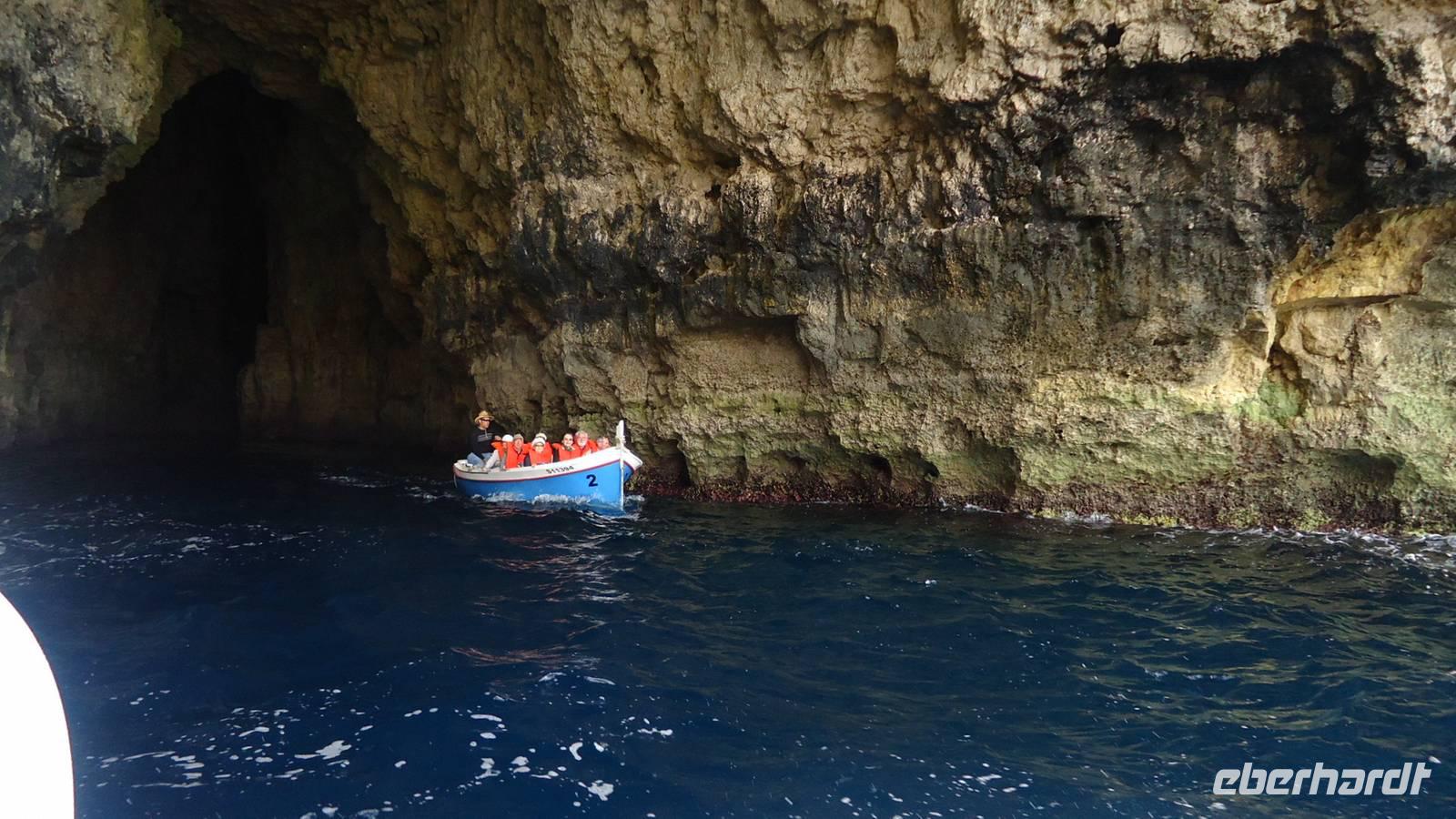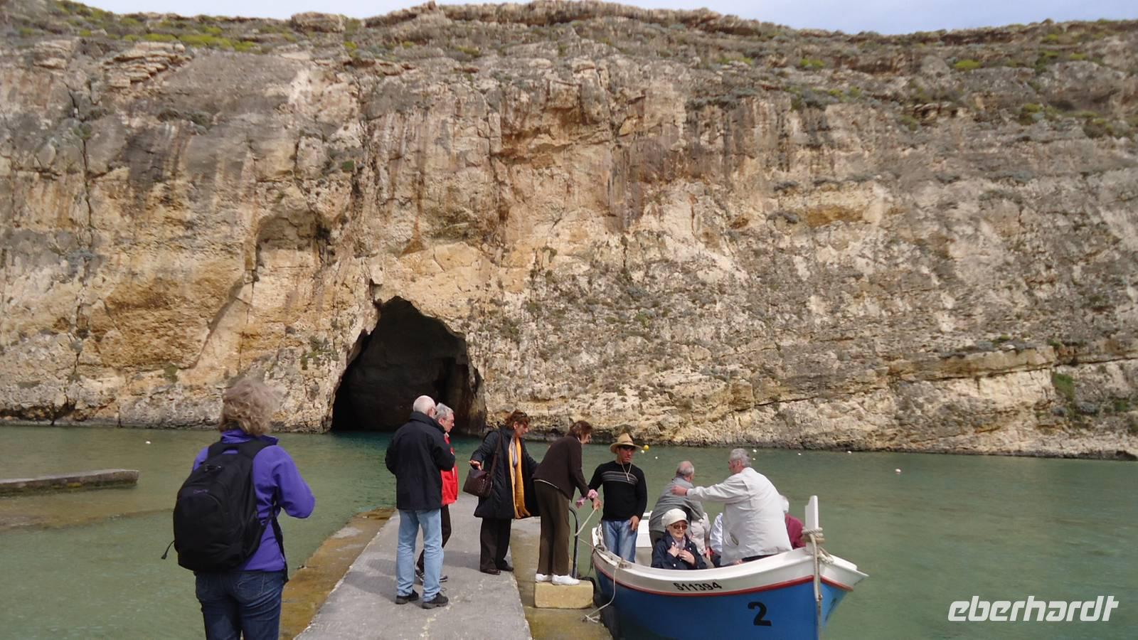 Unser erster Ausflug führt uns nach „Hager Qim", wo wir eine Tempelanlage aus megalitischer Zeit besuchen. Es handelt sich um das wohl älteste neolitische Bauwerk der Welt. Hier begrüßen wir den Frühling! Es ist etwas windig, aber angenehm warm. Good bye, Winter! Der zweite Anlaufpunkt des Tages ist die Blaue Grotte. Wir haben Glück mit dem Wind und dem Meer. So können wir eine Bootsfahrt unternehmen. Es hat sich 100 Prozent gelohnt. Durch die Einstrahlung der Sonne bestaunen wir wunderschöne Farbspiele und betrachten die tiefblaue Färbung des Wassers. Lustig war als sich Herr Schnabel mit mir auf dem letzten Schiff befand, aber das Ticket hatte seine Ehefrau auf dem 2. Schiff unserer Gruppe. Gott sei Dank, müssten wir nicht schwimmen und am Ende der Bootsfahrt konnte ich alle Tickets vorweisen.Noch etwas freie Zeit, bevor wir im kleinen Fischerdorf Marsaxlokk, einst wichtigster Hafen der Phönizier, unsere 2-stündige Mittagspause einlegen. Es ist hier fast wie Sommer, während es in Deutschland gerade schneit, wie wir auf Bildern per Handy sehen. Die bunt bemalten Holzboote im Hafen bieten einen traumhaften Anblick. Faszinierend ist die große Flotte farbenprächtiger Luzzu-Boote, die mit den zwei „Augen des Osiris", die Unheil abwenden sollen, geschmückt sind. Wir haben Zeit zum Bummeln oder zum Essen von fangfrischem Fisch und Meeresfrüchten. Als Ostergeschenk von Eberhardt TRAVEL überreiche ich jedem Gast typisch maltesisches „Nougat". Keine Zeit für Siesta (ein „Nickerchen"), denn wir besichtigen Ghar Dalam (Höhle der Finsternis), eine Karsthöhle und bedeutende Fossillagerstätte. Sie hat eine maximale Breite von 18 Metern, ist bis zu 8 Meter hoch und führt etwa 145 Meter weit in die Kalksteinfelsen, obwohl wir nur die ersten 30 Meter eintreten können. Letzte Station für heute sind die Tempel von Tarxien, errichtet von etwa 3.250 v. Chr. bis 2.500 v. Chr. Die Anlage aus der Jungsteinzeit ist seit 1992 Teil der UNESCO-Welterbestätte „Megalithische Tempel von Malta".