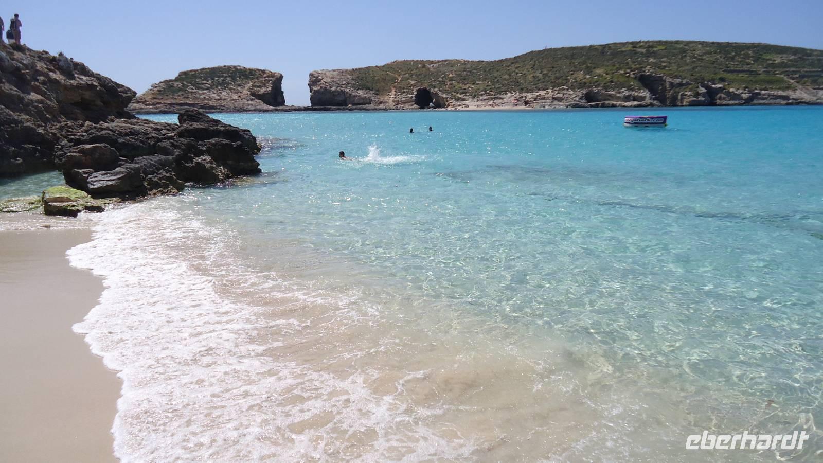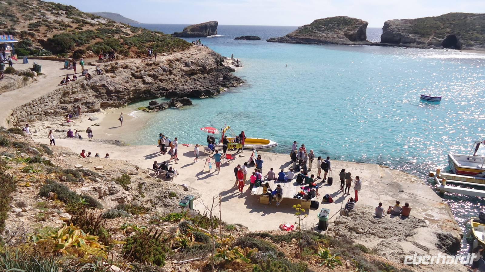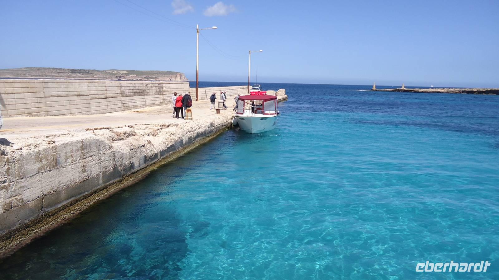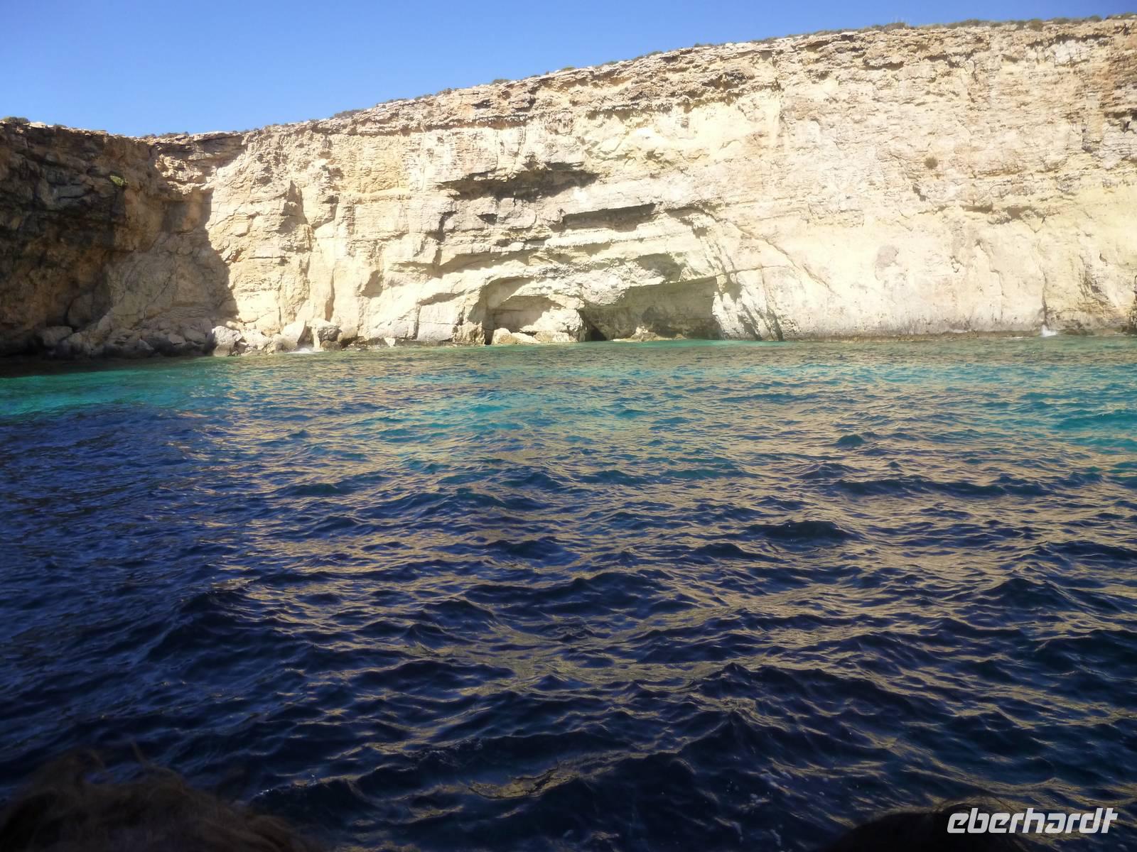 Am Nachmittag haben wir Freizeit. Mit sieben Reisegästen fahre ich nach Comino, zur kleinen Insel zwischen Malta und Gozo. Mit einem schnellen Boot so wie in der TV-Serie „Miami Vice" setzen wir zur wunderschönen und berühmten Blauen Lagune über. Unglaublich schön ist die hellblaue Farbe des Wassers. Ich schwimme im eiskalten Wasser. Wir begeben uns schließlich auf eine kleine Wanderung zur Festung von St. Maris Tower. Zurück zum Hafen nimmt die Fähre die Route entlang der Klippen. So machen wir Fotos von den vielen Grotten.