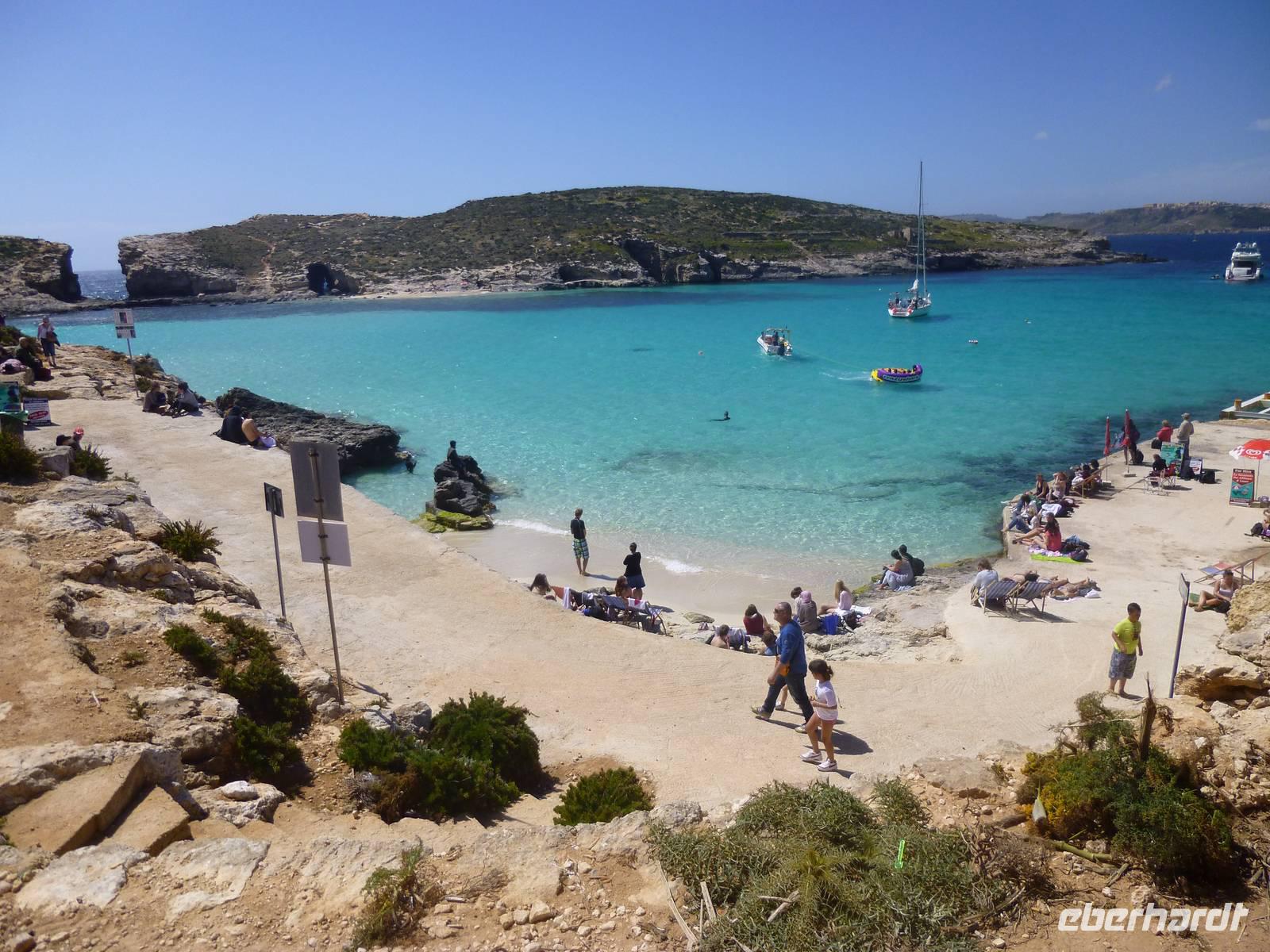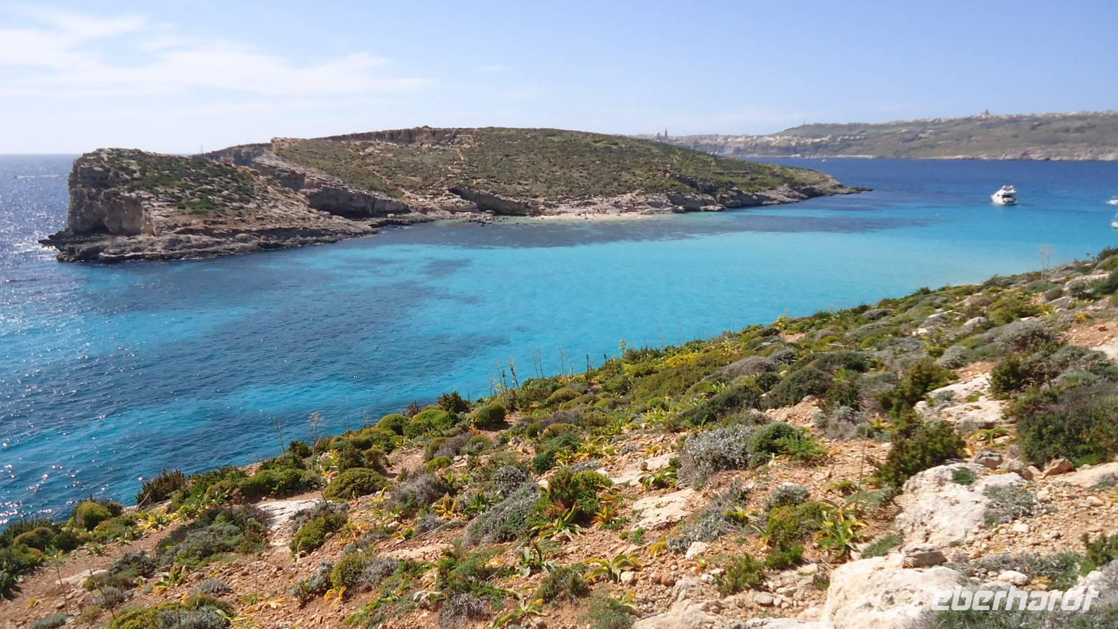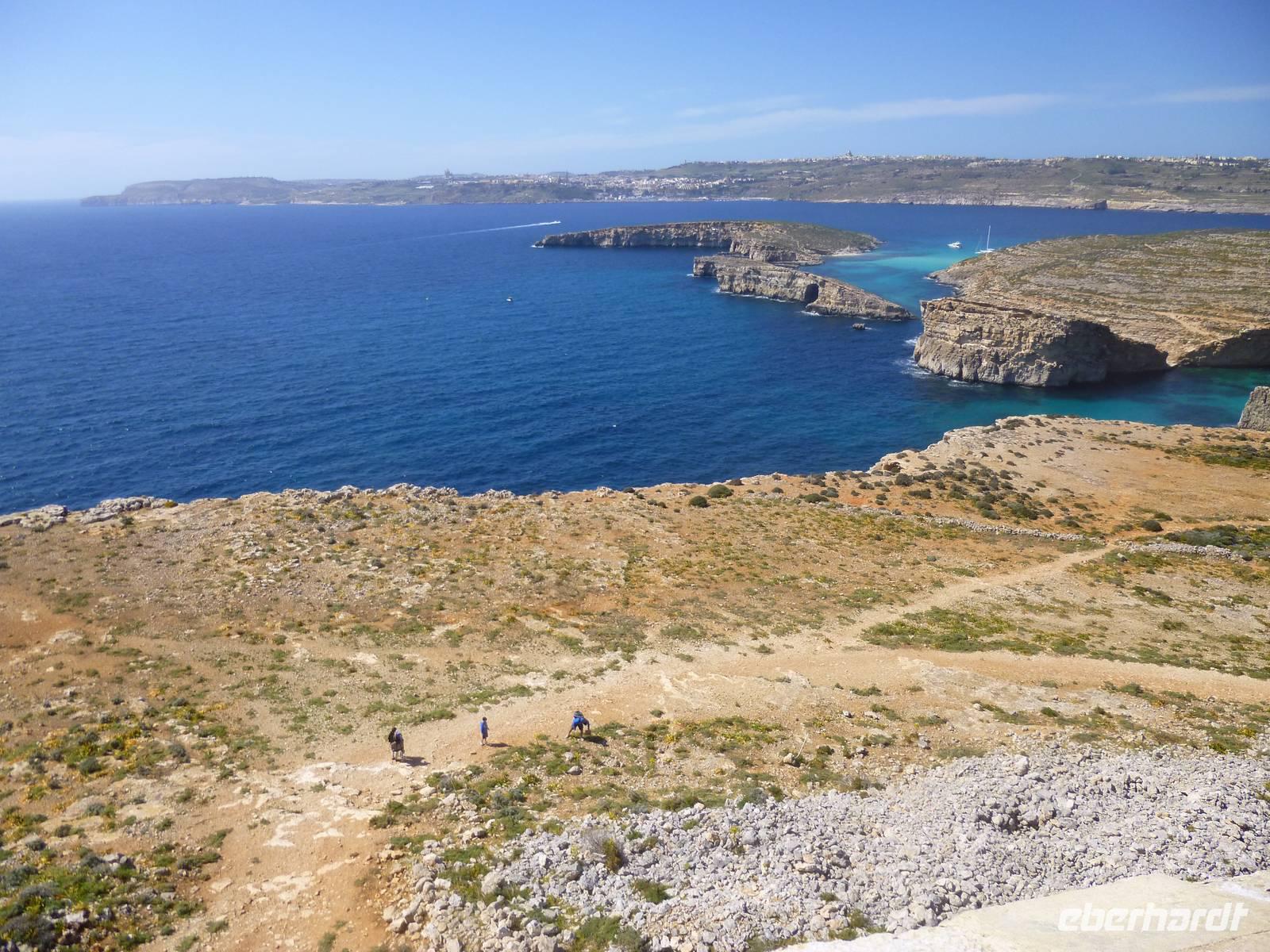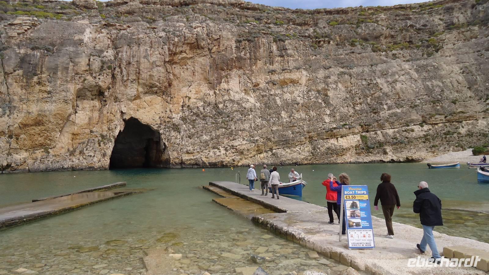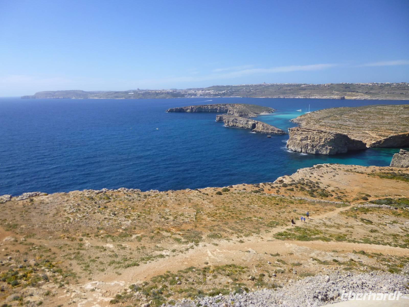 Am Nachmittag haben wir Freizeit. Mit sieben Reisegästen fahre ich nach Comino, zur kleinen Insel zwischen Malta und Gozo. Mit einem schnellen Boot so wie in der TV-Serie „Miami Vice" setzen wir zur wunderschönen und berühmten Blauen Lagune über. Unglaublich schön ist die hellblaue Farbe des Wassers. Ich schwimme im eiskalten Wasser. Wir begeben uns schließlich auf eine kleine Wanderung zur Festung von St. Maris Tower. Zurück zum Hafen nimmt die Fähre die Route entlang der Klippen. So machen wir Fotos von den vielen Grotten.