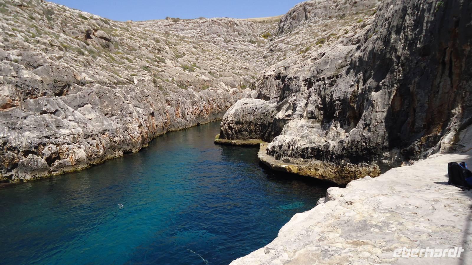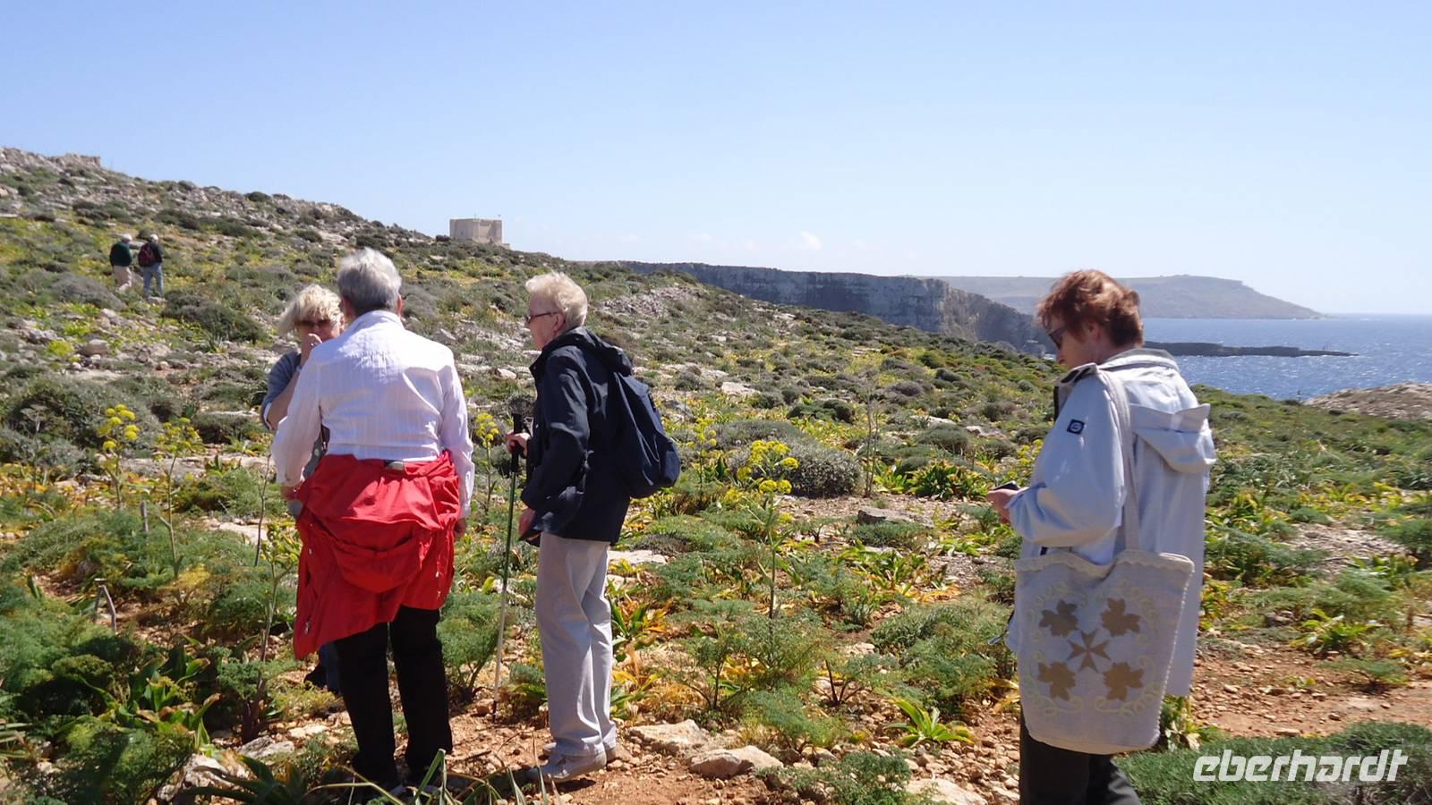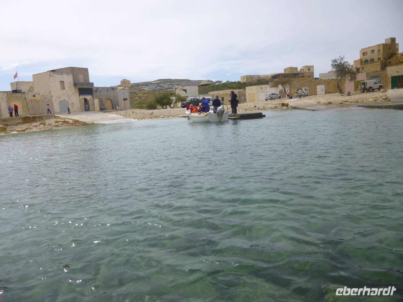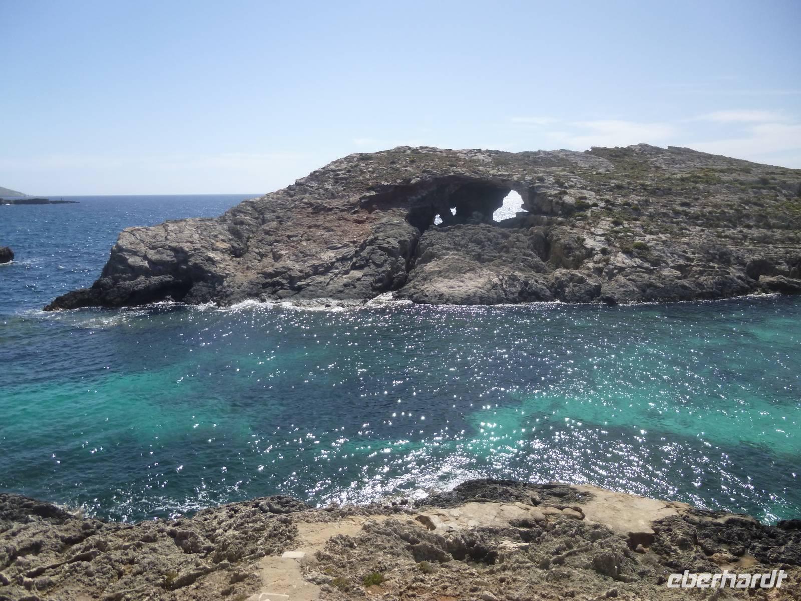 Am Nachmittag haben wir Freizeit. Mit sieben Reisegästen fahre ich nach Comino, zur kleinen Insel zwischen Malta und Gozo. Mit einem schnellen Boot so wie in der TV-Serie „Miami Vice" setzen wir zur wunderschönen und berühmten Blauen Lagune über. Unglaublich schön ist die hellblaue Farbe des Wassers. Ich schwimme im eiskalten Wasser. Wir begeben uns schließlich auf eine kleine Wanderung zur Festung von St. Maris Tower. Zurück zum Hafen nimmt die Fähre die Route entlang der Klippen. So machen wir Fotos von den vielen Grotten.