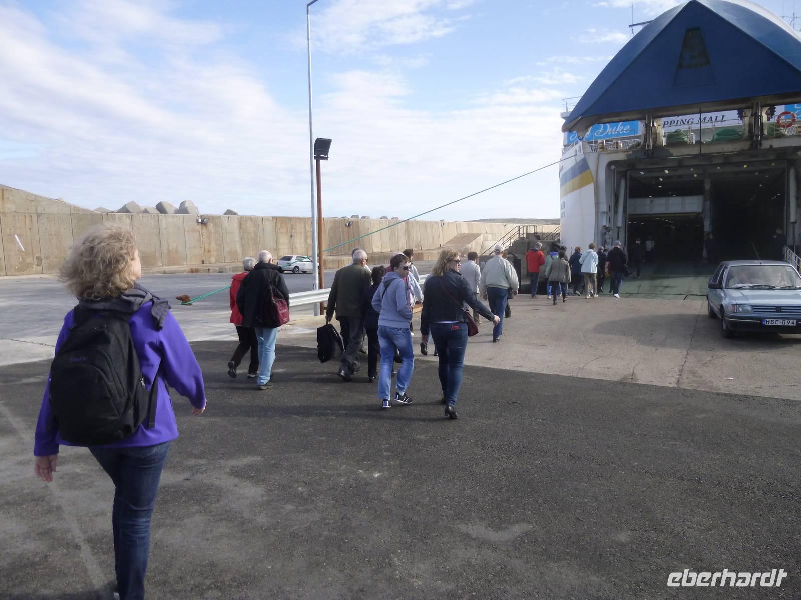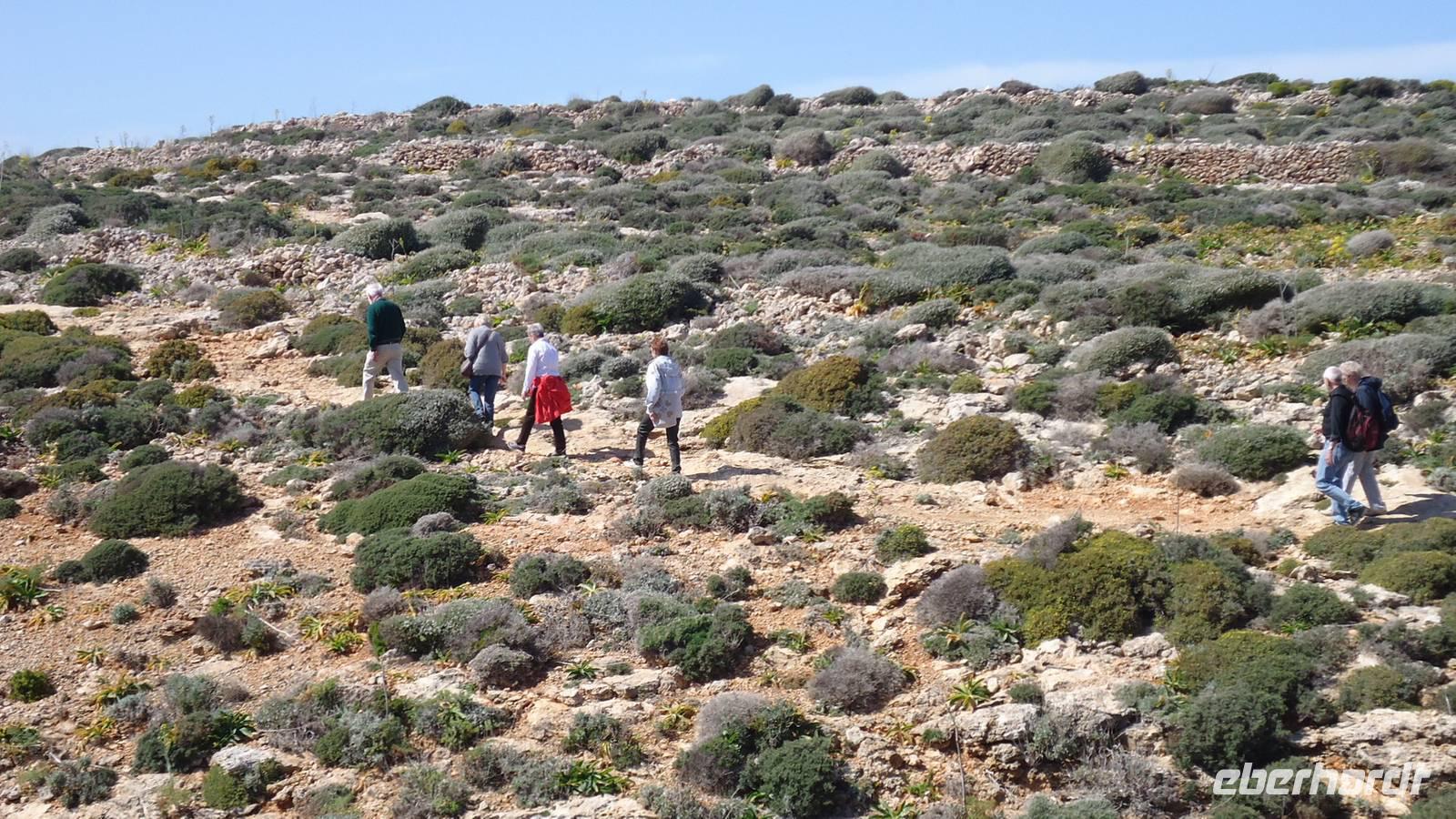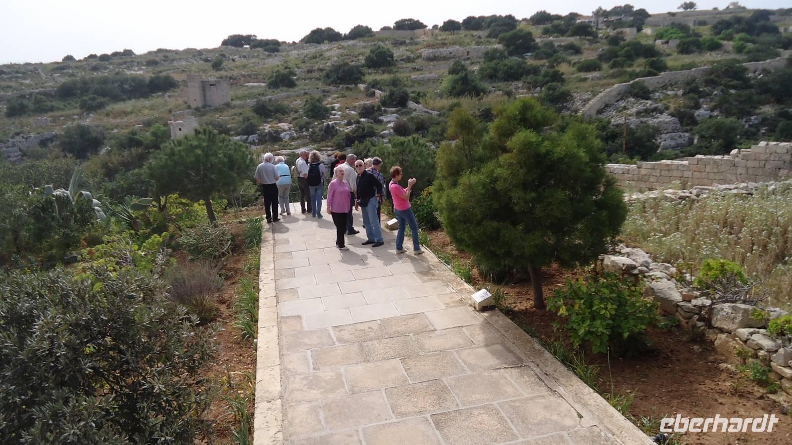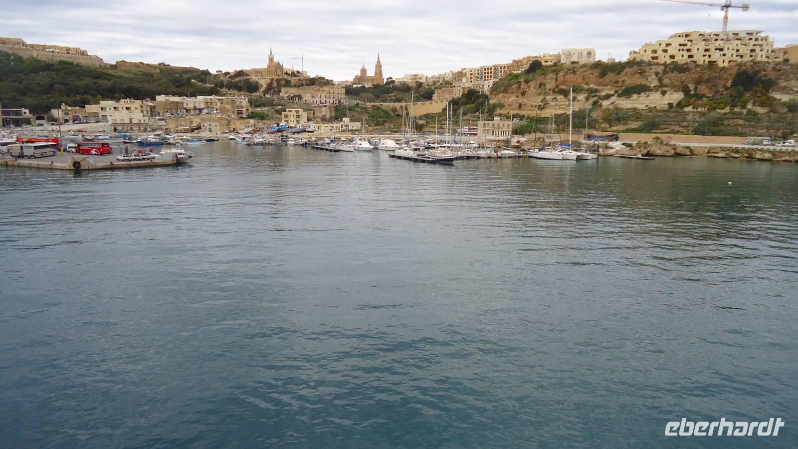 Am heutigen Tag verlassen wir Malta, um einen Ausflug auf die Nachbarinsel Gozo zu unternehmen. Wir setzen mit der Fähre zur „Calypso-Insel" über. Zuerst besuchen wir die Tempelanlage Ggantija auf der Anhöhe von Xaghra. Unser Busfahrer Jonny, einer der beste in Gozo - so berichtet Pauline, bringt uns als fast erste Gruppe, die diese Tempel an diesem Morgen besichtigt, zum Ziel. So können wir ohne langes Warten und Anstehen sofort mit der Besichtigung beginnen. Wir stoppen später in Xaghra, um die schöne Kirche zu sehen. Anschließend ging es weiter für einen Fotostopp zur Calypso-Höhle. Oberhalb der Höhlen hatten wir einen tollen Blick auf die angrenzende Badebucht. Bei diesem klaren Wetter sehen wir Sizilien und wenn man genau Ausschau hält einen weißen Berg voller Schnee am Horizont, den majestätischen Ätna.