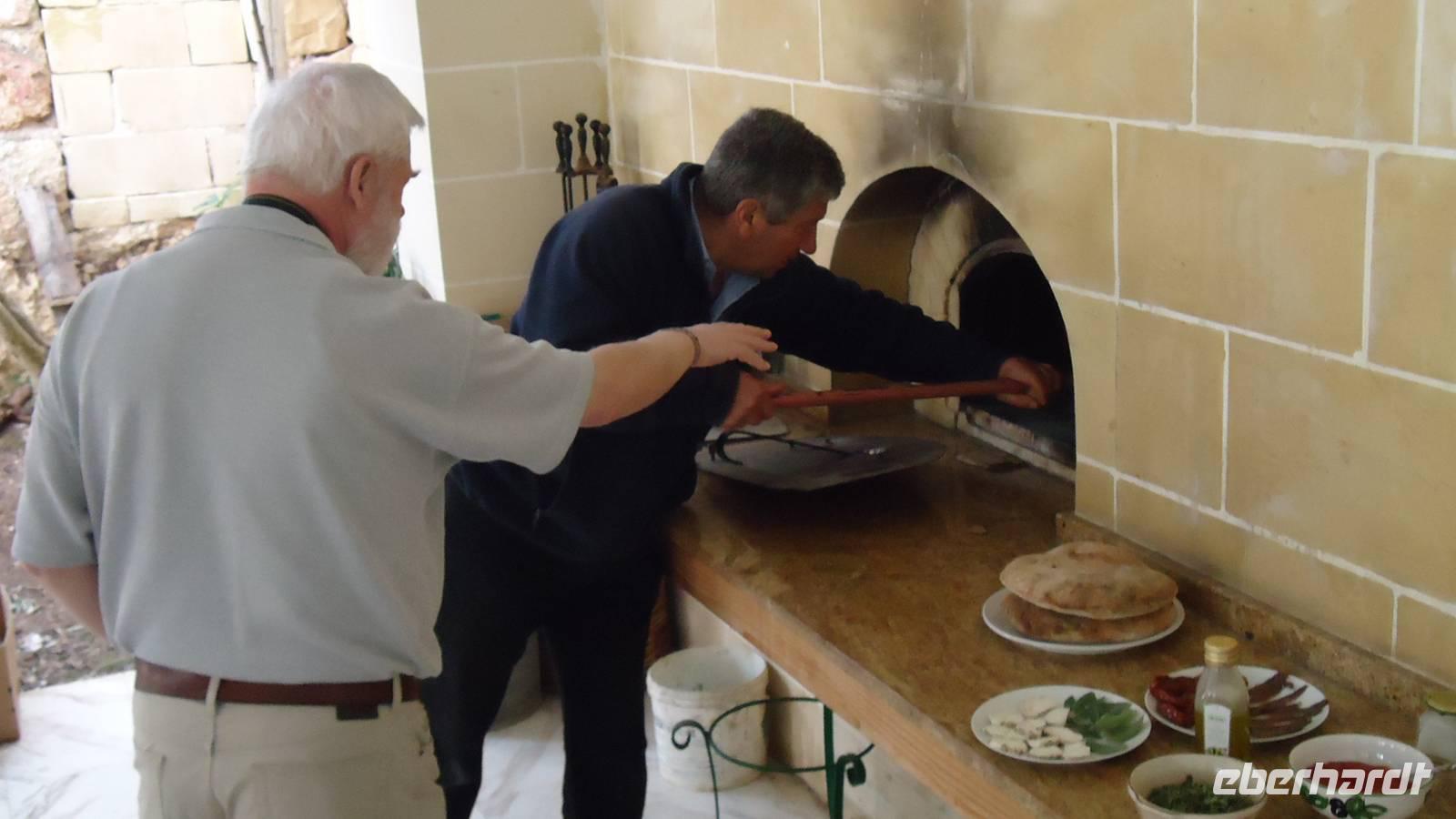 Nächste Station ist „Azur Window", wo viele von uns per Boot auf das Meer hinaus fahren, um den riesigen Felsbogen aus einer anderen Perspektive zu sehen. Nach einer kurzen Pause für eine Kaffe oder um das Blaue Fenster von Land zu fotografieren, fahren wir zum „Savina Creativity Center" zur Firma „Magro´s Brüdern", Produzent schmackhafter Tomatensoßen. Um die Mittagszeit treffen wir dann in der Hauptstadt Gozos, Victoria, ein. Hier gehen wir zunächst den steilen Berg und Treppen hinauf zur Zitadelle, wo Pauline uns etwas zur Gründung und Geschichte der Stadt erzählt. Oben auf der Zitadelle angekommen, haben wir uns das leckere Mittagessen bei Rikardo wirklich verdient. Wir genießen ein typisches Bauerngericht mit Tomaten, Zwiebeln, Kapern, Oliven sowie verschiedenen Käseorten. Dazu probieren wir drei verschiedene Weine und singen einige Lieder wie „Mein kleiner grüner Kaktus" oder „Herrliche Berge, Bergvagabunden sind wir". Wir haben leider keine Zeit mehr, um das Fischerdorf Xlendi zu besichtigen. Auf dem Weg zum Hafen oben in den Bergen machen wir unser Gruppenfoto mit Blick auf die Inseln Comino und Malta.