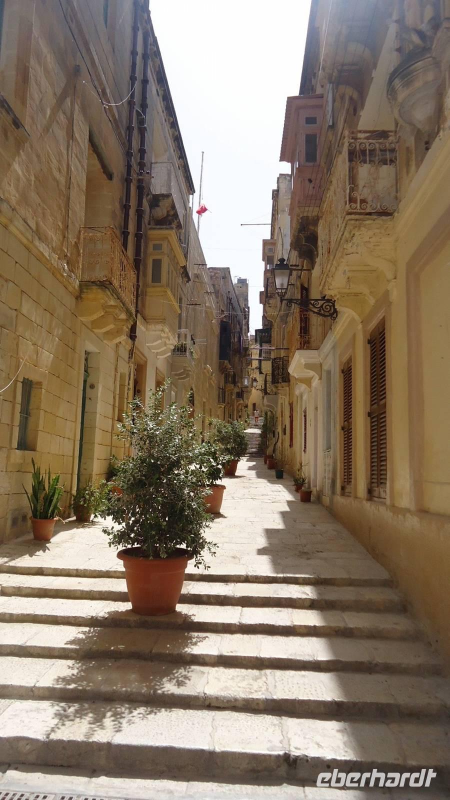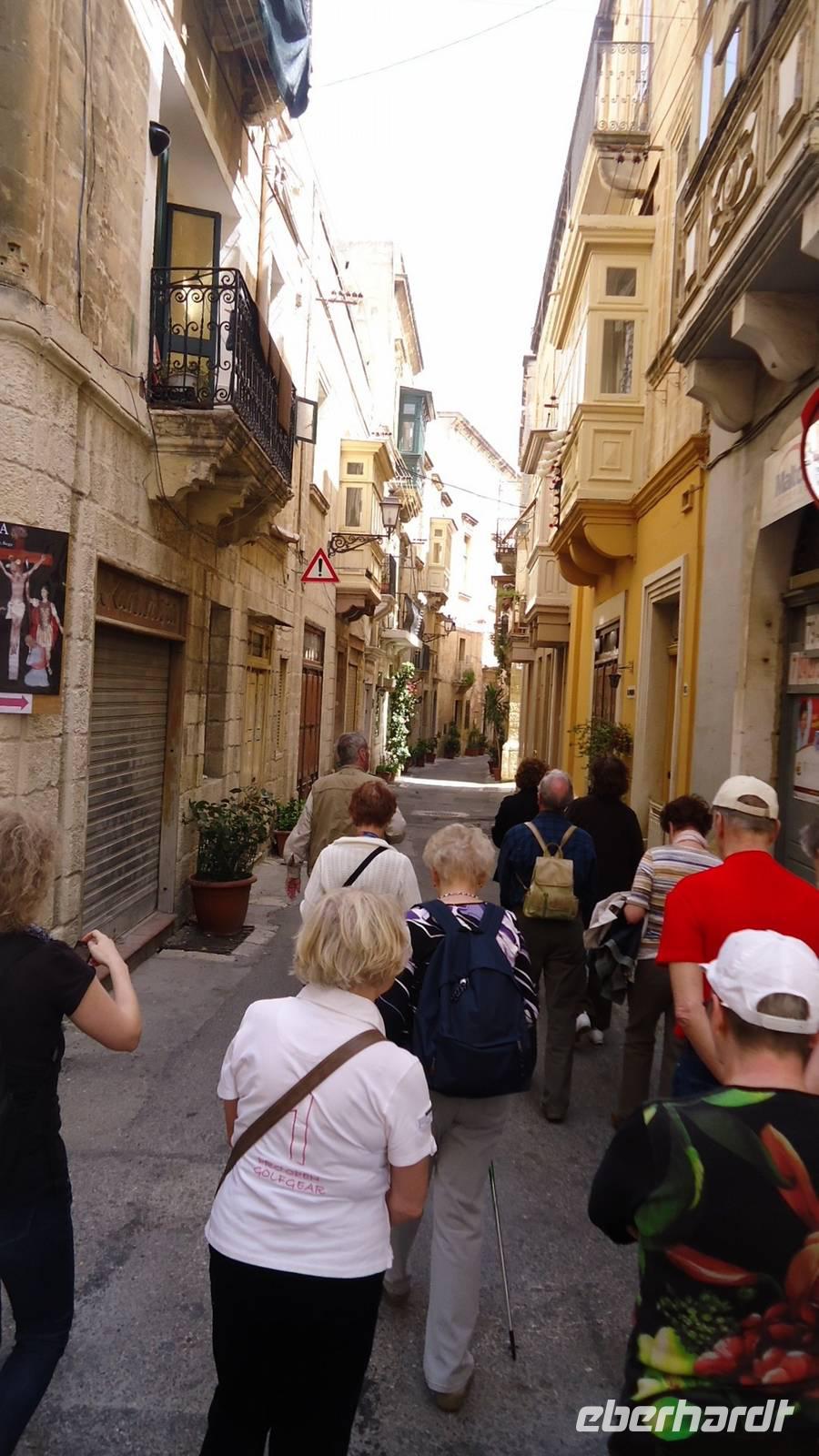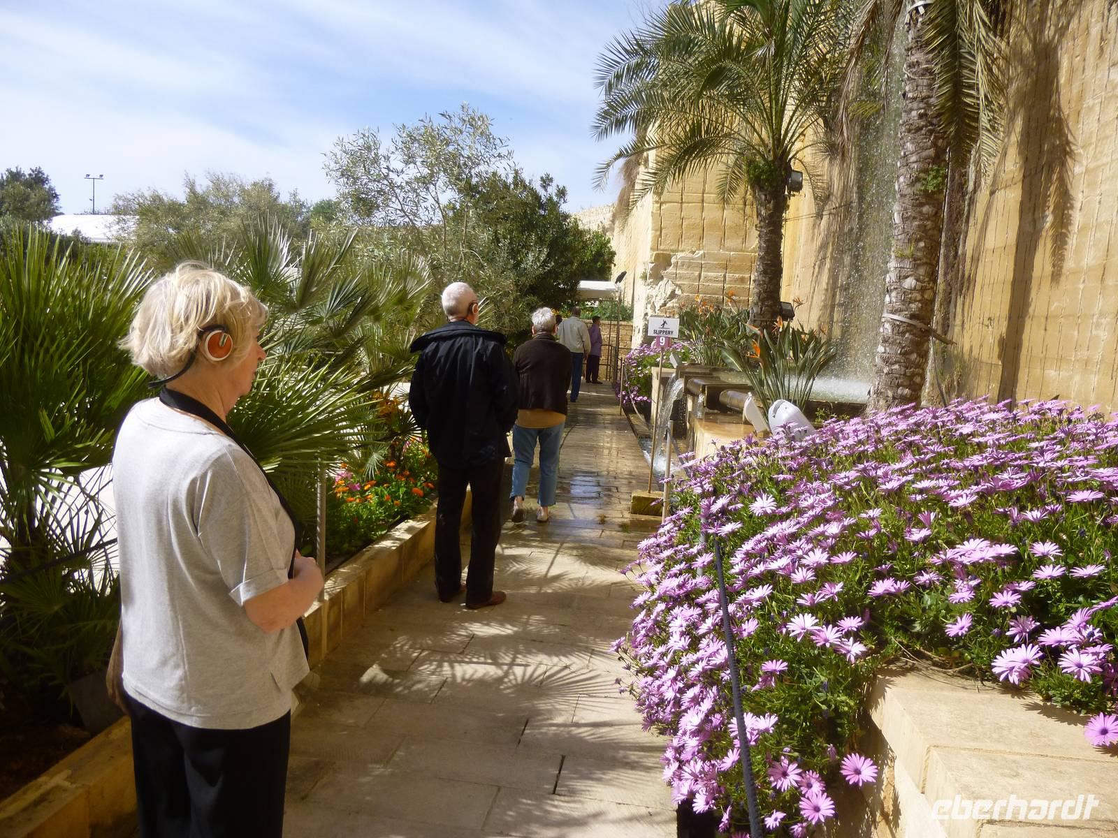 Heute begeben wir uns auf unsere Erkundungstour nach Valetta, in Maltas Hauptstadt, die umgeben von Bastionen als am meisten gesicherte Stadt der Welt gilt. Von Upper Barrakka Garden genießen wir einen fantastischen Blick über die „Drei alten Städte". Unsere Reiseleiterin, Pauline, bringt uns durch typische Straßenzüge mit Balkonen Vallettas zur St. Johns-Co-Cathedrale. Sie wird als Ko-Kathedrale bezeichnet, da sie als zweiter Sitz des Erzbischofs von Malta, neben der St. Pauls Cathedrale in Mdina, dient. Sie wurde in vier Jahren erbaut, aber die Inneneinrichtung dauerte über 100 Jahre. Von außen wirkt sie sehr schlicht. Umso mehr überrascht Sie uns im Innenraum mit kunstvollen Grabsteinen aus Marmor, Altären, Gemälden und Verzierungen. Einer meiner Höhepunkt der Reise war das berühmte Gemälde „Die Enthauptung Johannes des Täufers" von Caravaggio, dem Meister des Lichtes. Wir besuchen anschließend den Großmeisterpalast, das größte Gebäude Vallettas. Aus heimischen Kalkstein gebaut, wird dieser Palast auch heute für offizielle Staatsbesuche genutzt. Wir konnten nicht mehr Glück zum Mittagessen haben: wunderschönes Wetter, Straßen und Terrassen voller Stimmung - eine Atmosphäre, um uns in die Stadt zu verlieben. Am Nachmittag gehen wir zum Lower Barracca Garden. Als Abschluss des Tages erleben wir das „Malta Experience", eine Filmpräsentation über Maltas unglaubliche Geschichte, die weit, weit zurückreicht.