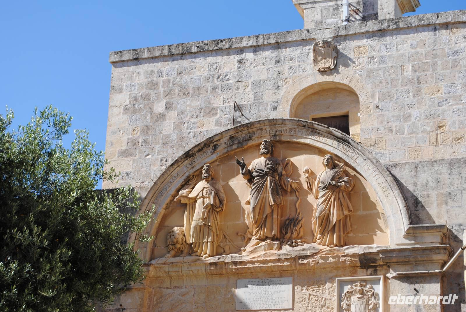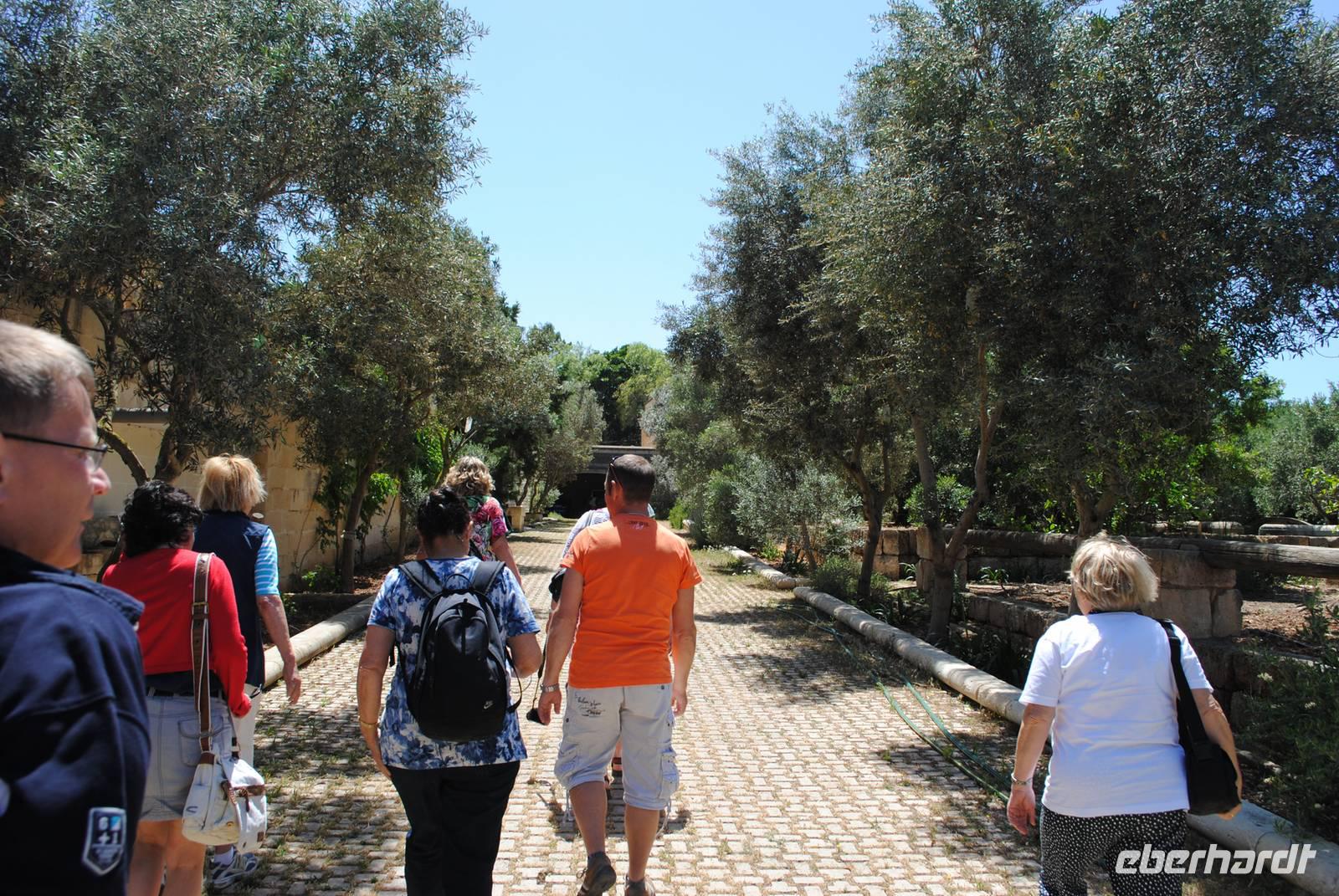 Die alte Hauptstadt Maltas stand heute zuerst auf dem Programm. Mit nur 300 Metern Breite konnten wir diese problemlos zu Fuß erkunden, wenn auch hin und wieder der Wind sehr stark durch die engen Gassen pustete - Normalzustand in Mdina, denn so hoch gelegen herrscht hier fast immer Wind. Wir betraten das Stadtgebiet durch das majestätische Stadttor und besuchten zuerst die Kathedrale mit ihren vielfarbigen Grabplatten aus Marmor, die den gesamten Boden bedecken. Anschließend spazierten wir durch die schmalen Gassen bis zum Aussichtspunkt an der Stadtmauer und wieder zurück in die Stadtmitte, wo wir noch ein wenig Freizeit verbrachten, zum Beispiel im Museum der Kathedrale oder in einem gemütlichen Café. Nachdem wir Mdina wieder durch das Stadttor verlassen hatten, änderten wir kurzerhand das heutige Programm und besuchten anstatt der St. Pauls Katakomben den Ehemaligen Steinbruch Limestone Heritage, um das tolle Wetter bestmöglich nutzen zu können. Im heutigen Museum bekamen wir Einblicke in das harte Leben der Steinbruch-Arbeiter und sahen bei einem Rundgang durch die Anlage anschaulich, wie der Kalkstein über die Jahrhunderte abgebaut wurde und sich technisch entwickelte. Ein kleiner Garten mit Streichelzoo erwartete uns zum Schluss. Kurz vor dem Mittag ging es dann schließlich weiter zur Olivenfarm von Samy Cremona, der schon mit vielen Leckereien aus seinem Garten auf uns wartete. Nachdem wir fürstlich bei ihm zu Mittag gegessen hatten, machten wir einen Rundgang durch seinen Hof und sahen verschieden alte Olivenbäume, den Orangengarten, seine Tiere und natürlich auch ein Exemplar seiner patentierten weißen Olivenbäume. Sein übermütiger Hund Cico begeleitete uns dabei und nachdem wir an der Presse erklärt bekommen hatten, wie aus den Oliven Öl gewonnen wird, konnten wir sogar einige Flaschen für zuhause bei Samy erwerben, gewissermaßen zum Freundschaftspreis. Da trotz Samys ausgiebigen Erklärungen noch viel vom Tag übrig war, machten wir kurzerhand noch einen Stopp in Bugibba, wo wir an der Hafenpromenade spazieren oder die Souvenierläden plündern konnten. Im Anschluss erreichten wir schließlich wieder unser Hotel und jeder konnte den Abend ganz nach eigenen Vorstellungen gestalten.