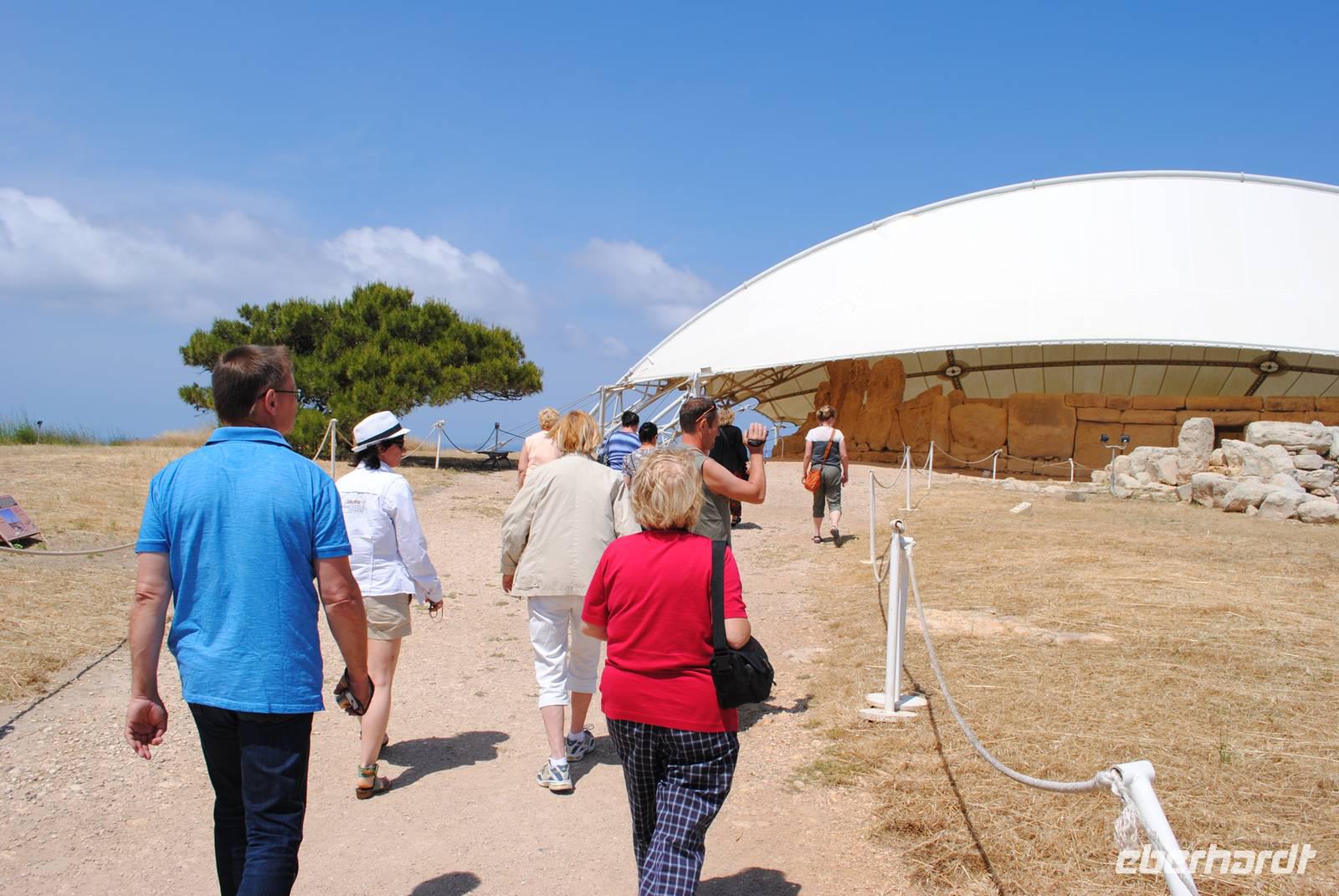 Um das gute Wetter des Vormittags zu nutzen, besuchten wir heute gleich zuerst die imposante Blaue Grotte. Zuerst machten wir ein paar Schnappschüsse vom Aussichtspunkt und fuhren schließlich direkt zur Küste. Da das Meer noch nicht allzu unruhig war, konnten wir mit kleinen Booten in die Höhle der Grotte hinein fahren und das leuchtend blaue Wasser aus nächster Nähe sehen. Danach hatten wir noch Zeit für einen Einkaufsbummel in den Geschäften entlang der kleinen Promenade, bevor es weiter zur nächsten Station ging. An der gigantischen Ruine des Hagar Qim Tempels machten wir den nächsten Stopp und erlebten zuerst eine Filmvorführung in 4D, mit spritzendem Regen und Gewitterblitzen. Danach erkundeten wir die zum Schutz überdachte Anlage und stellten Ähnlichkeiten zum Ggantija Tempel auf Gozo fest. Anschließend fuhren wir zu einer entspannten Mittagspause an den Hafen von Marsaxlokk, wo die landestypischen bunten Fischerboote in der Bucht liegen. Jeder hatte Zeit für eigene Erkundungen, zum Beispiel auf dem großen Markt, auf dem von Souveniers über Tischdecken bis zu Lebensmitteln alles verkauft wurde. Später erreichten wir das Besucherzentrum der Höhle Ghar Dalam, in dem unzählige dort gefundene Tierknochen ausgestellt wurden. Die Höhle selbst durften wir ebenfalls betreten und bestaunten die Tropfsteine und die vielen abgelagerten Sedimentschichten. Wieder lagen wir heute sehr früh in der Zeit und konnten deshalb spontan noch einen Abstecher zum weißen Sandstrand von Birzebugga machen. Deshalb eine Besonderheit, weil er künstlich aufgeschüttet wurde und einen skurrilen Blick auf den nahe gelegenen Containerhafen bietet - offensichtlich der schönste Containerhafen der Welt! Zurück im Hotel konnte heute wieder jeder den Abend für sich gestalten.