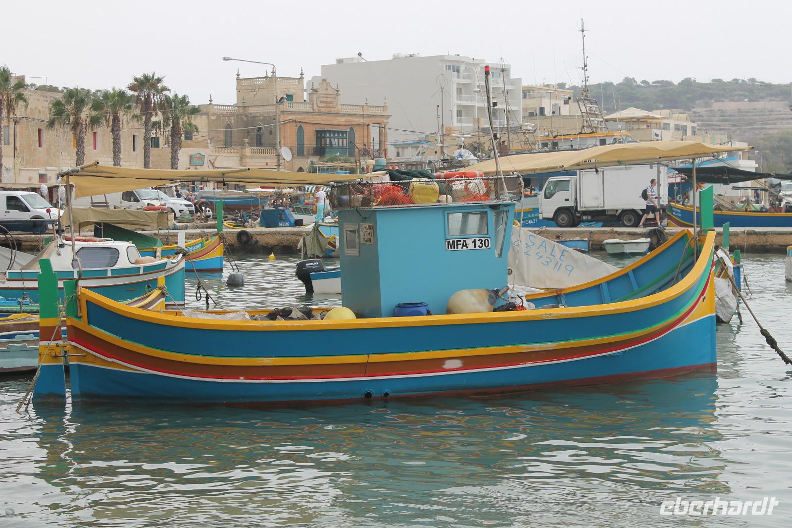 Abschließend ging es in Richtung Marsaxlokk (Marsaschlokk), wo wir unzählige Luzzu-Boote beobachten konnten und aßen Fisch und/oder andere Spezialitäten. Jedoch war mein bei einer Luftfeuchtigkeit von 90% und 30 °C nicht ganz so hungrig.