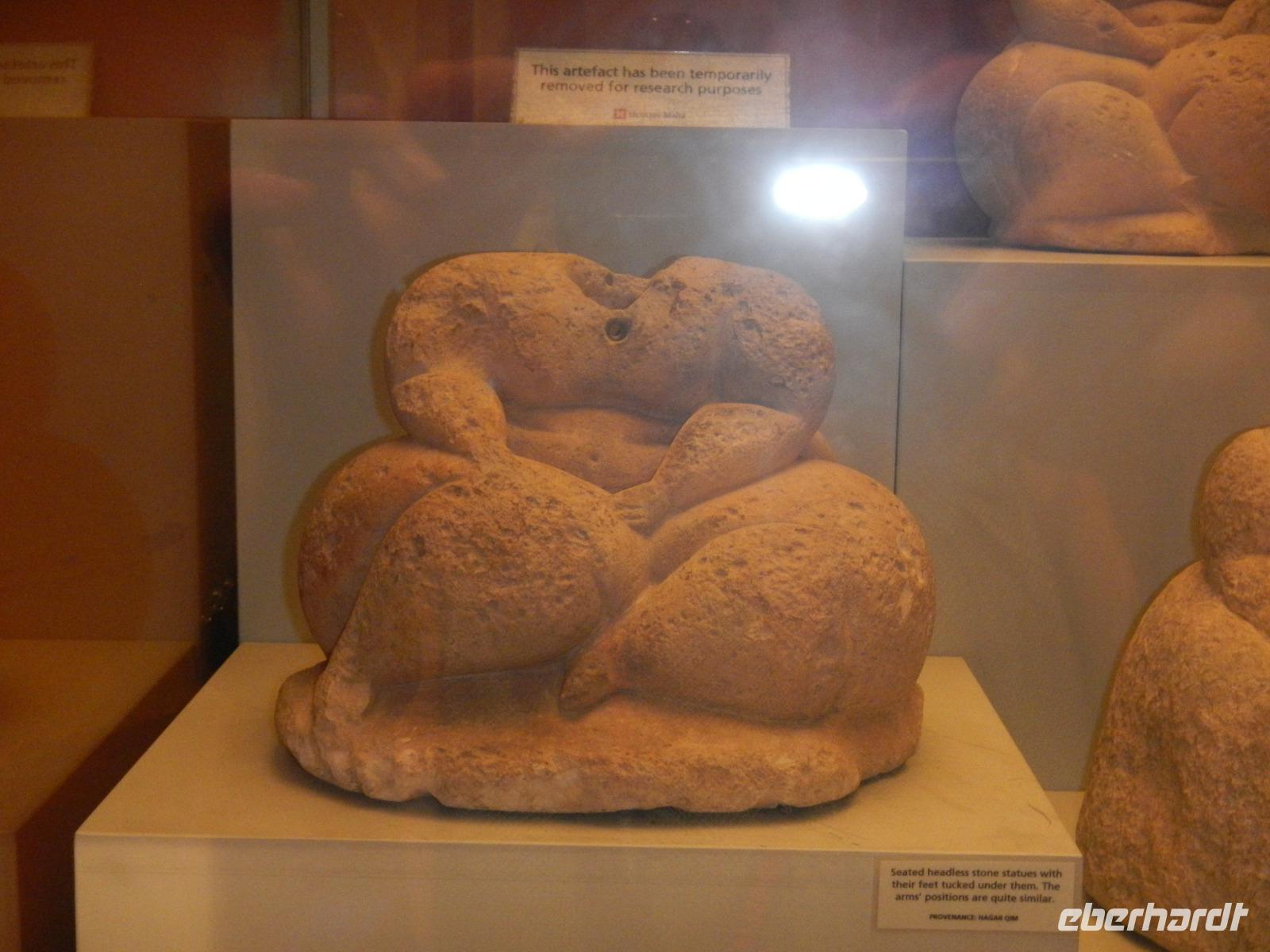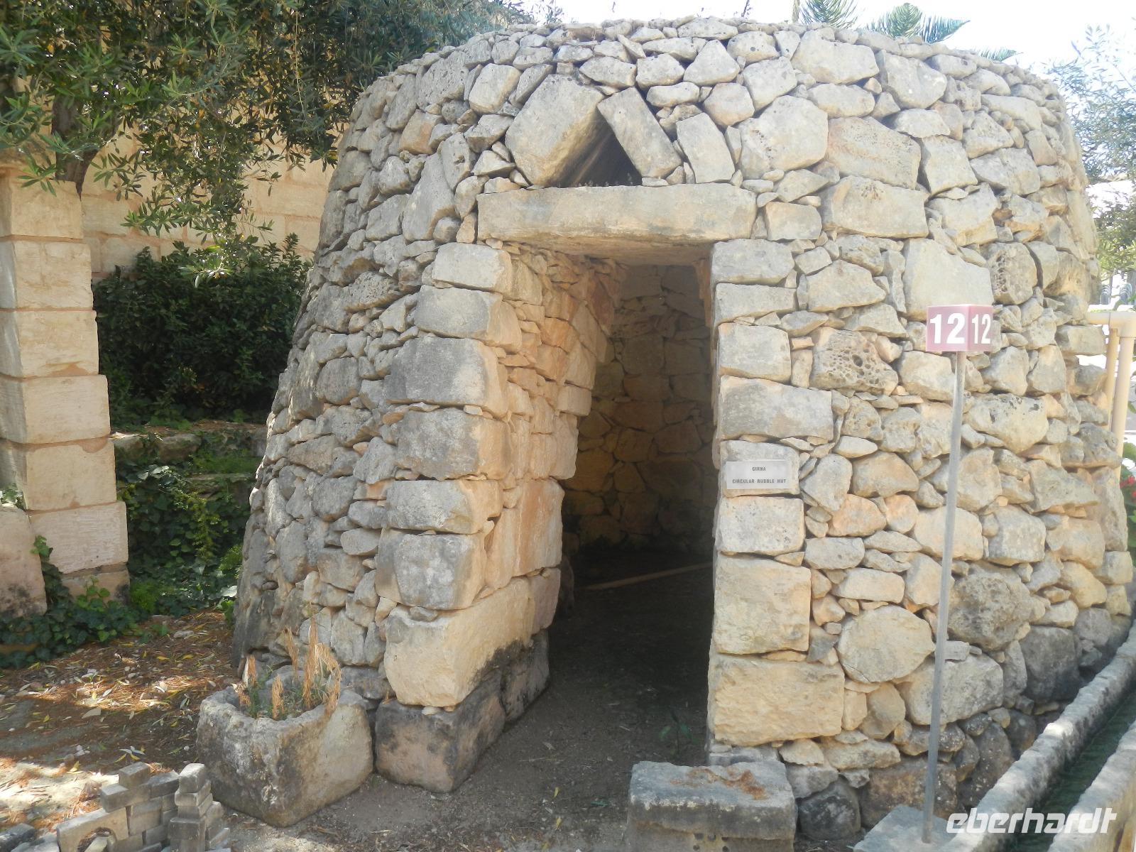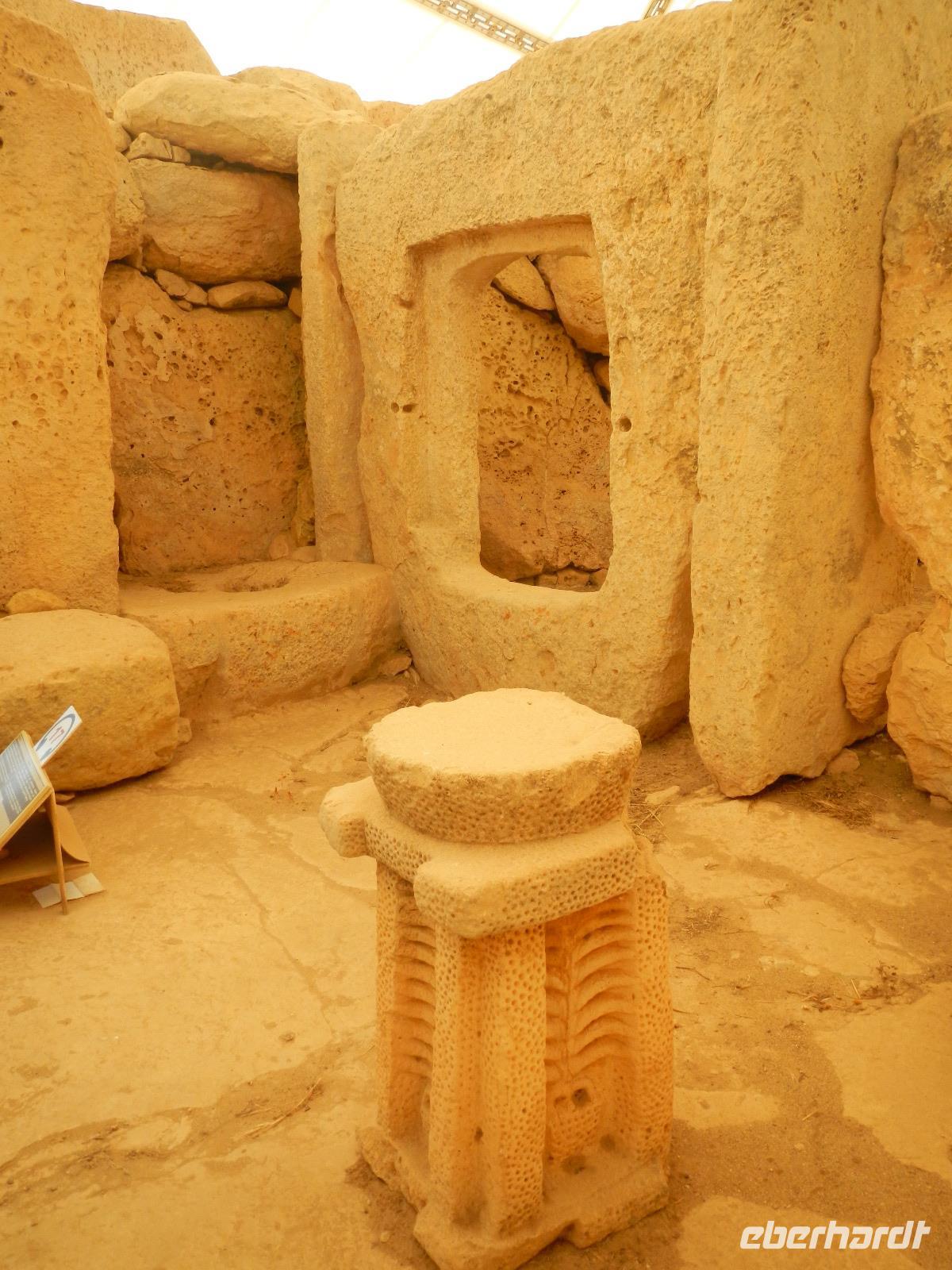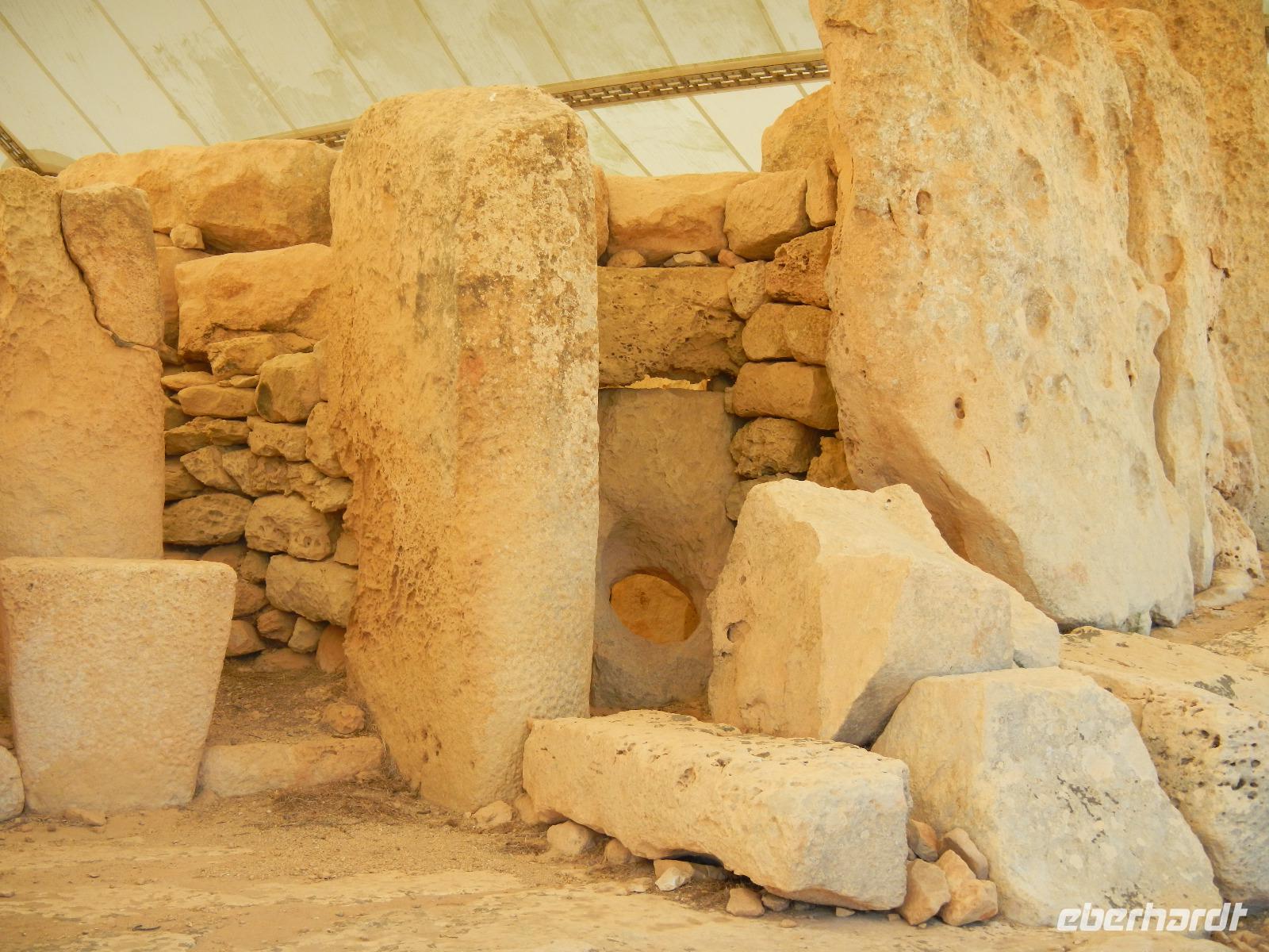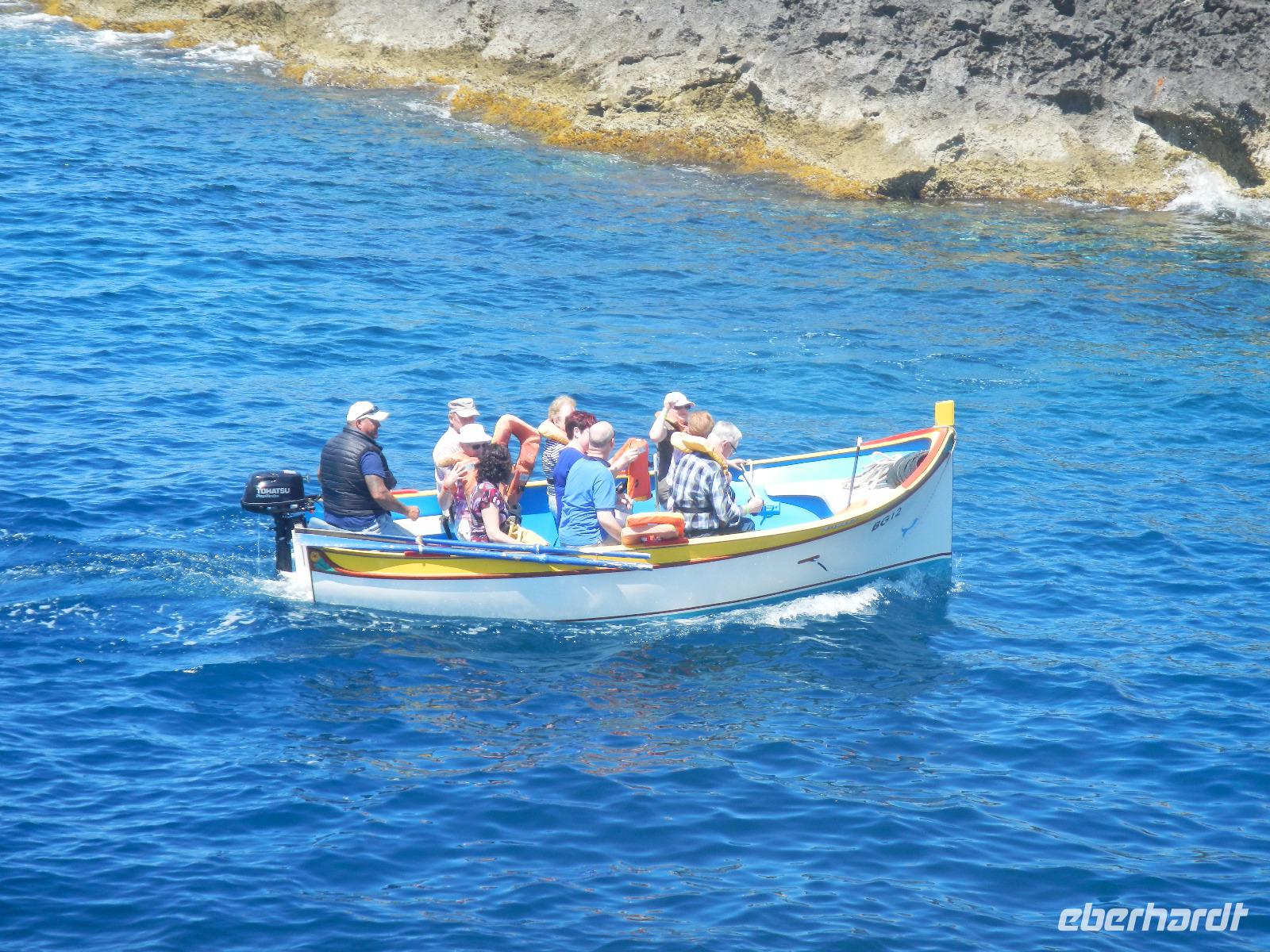 Nach diesem Aufenthalt, bei dem wir auch schon Gewürze und Kräuter entdeckt haben, beginnt unsere Zeitreise im Tempelpark von Hagar Qim (ausgesprochen: hadschar-im). Die in freier Natur befindliche neolithische Anlage bedeutet "Steine des Gebets". Entlang der Bankaltäre, die vor langer Zeit vermutlich die gesamte Außenmauer umgaben, erkennen einige unter uns sofort als Sitzgelegenheit. Anita erklärt, wie die Erbauer circa 3000 v. Chr. mit der Technik der Hebelwirkung gewaltige Steinplatten bewegt haben, diese nebeneinander aufsetzten und somit Räume, Nischen und Kammern erschaffen haben. In einem Wandstein entdecken wir ein ovales Loch aus dem vermutlich eine Priesterin das Orakel sprach (Orakelloch). Das Meer ist ohne viel Wellengang und so lohnt sich auch die Bootsfahrt über das schimmernde glasklare Wasser bis zur glitzernden Blauen Grotte. Bekanntschaft schliessen wir mit Nina, einer 10 Jahre alten hübschen und eigensinnigen Eule.