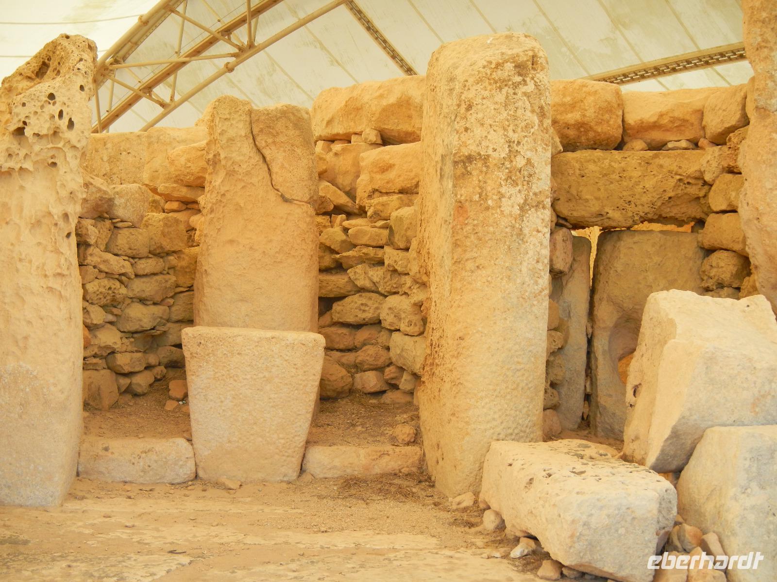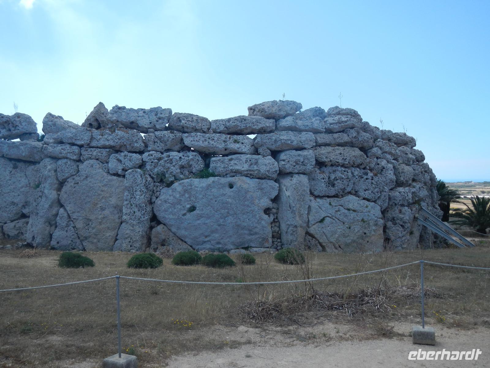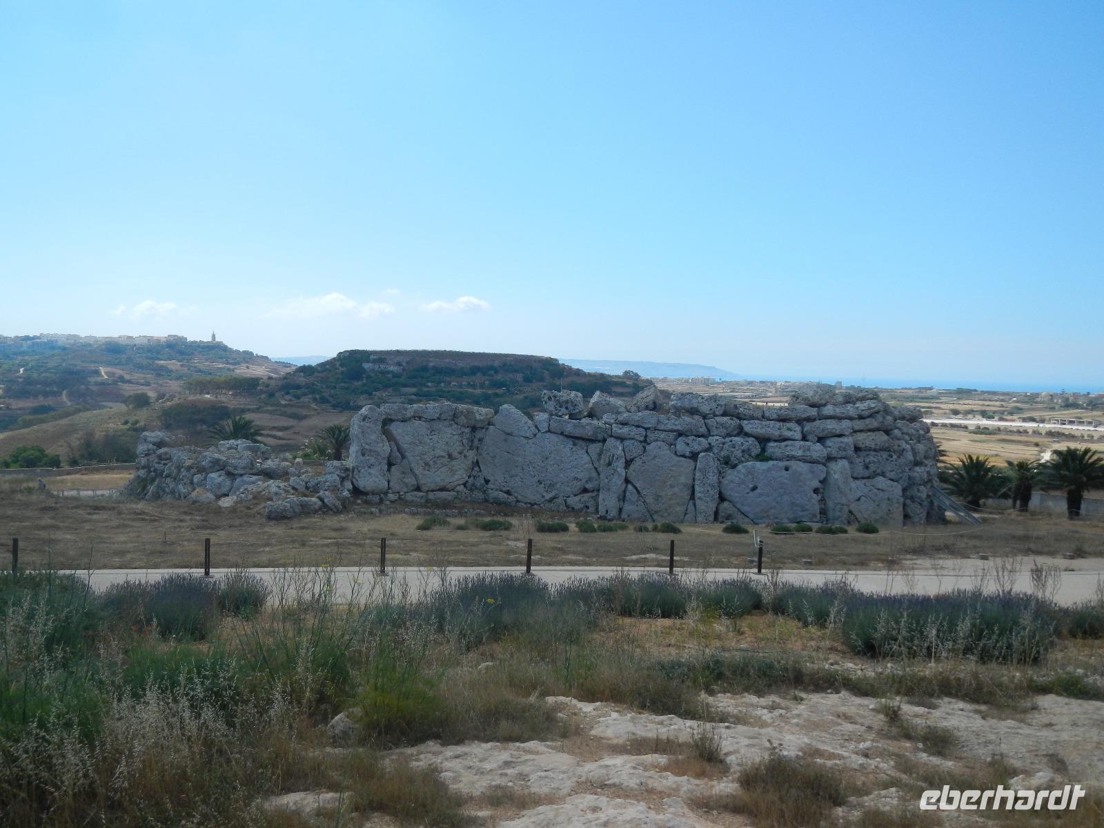Es tut sich so einiges auf der Insel Malta. Die bevorstehenden Wahlen führen dazu, dass einige Straßenzüge gleichzeitig repariert werden und so kommen wir nach einer Zick-Zack-Fahrt doch noch pünktlich am Fähranleger nach Gozo an. Die kleine Schwesterinsel von Malta besitzt eine ganz eigene Ausstrahlung. Im Inselinneren wird sie von flachen Tafelbergen geprägt, die Küste ist steil und felsig und bietet Tauchern ein Paradies. Wir fahren vorbei an grünen Wiesen, Feldern & Weingärten umrahmt von den Steinmäuerchen. Zunächst besuchten wir den Megalithtempel des kleebattförmig erbauten Ggantija-Tempel (ausgesprochen: dschantija)von circa 3600 v.Christus.
