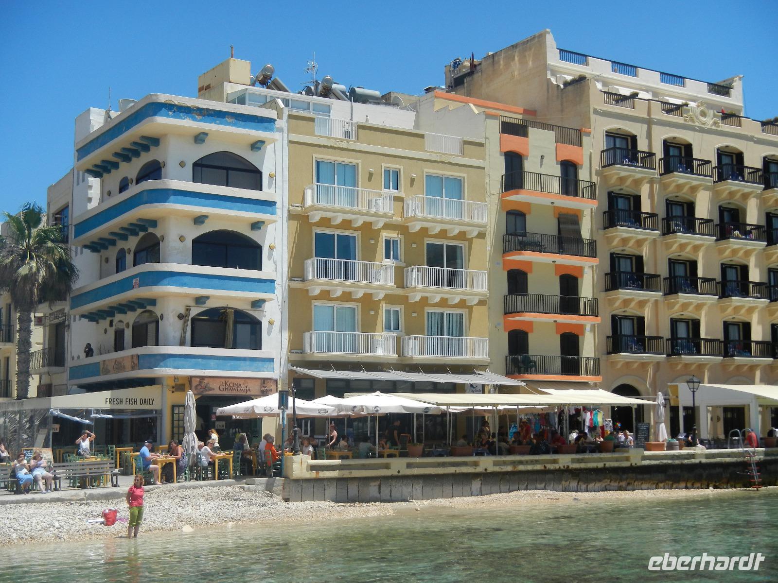 Erwartet werden wir von Anja, die uns zum Transferbus begleitet, der uns heute Mittag zum Seashells Resort at Suncrest in Qwara (ausgesprochen: Auwra) bringt. Im Hotel angekommen suchen wir uns eine ruhige Ecke, lassen die Koffer verstauen und Anja erläutert uns bei einem (im 2. Anlauf) "Kinnie" das geplante Besichtigungsprogramm. So langsam überkommt uns auch der kleine Hunger, und wir spazieren zu einem Strandimbiss, der eine typisch maltesische Küche anbietet. Wir lassen es uns schmecken und freuen uns nun auf den Bezug der Zimmer. Bis zum Abendessen vertreiben wir uns die Zeit in der noch unbekannten Umgebung.