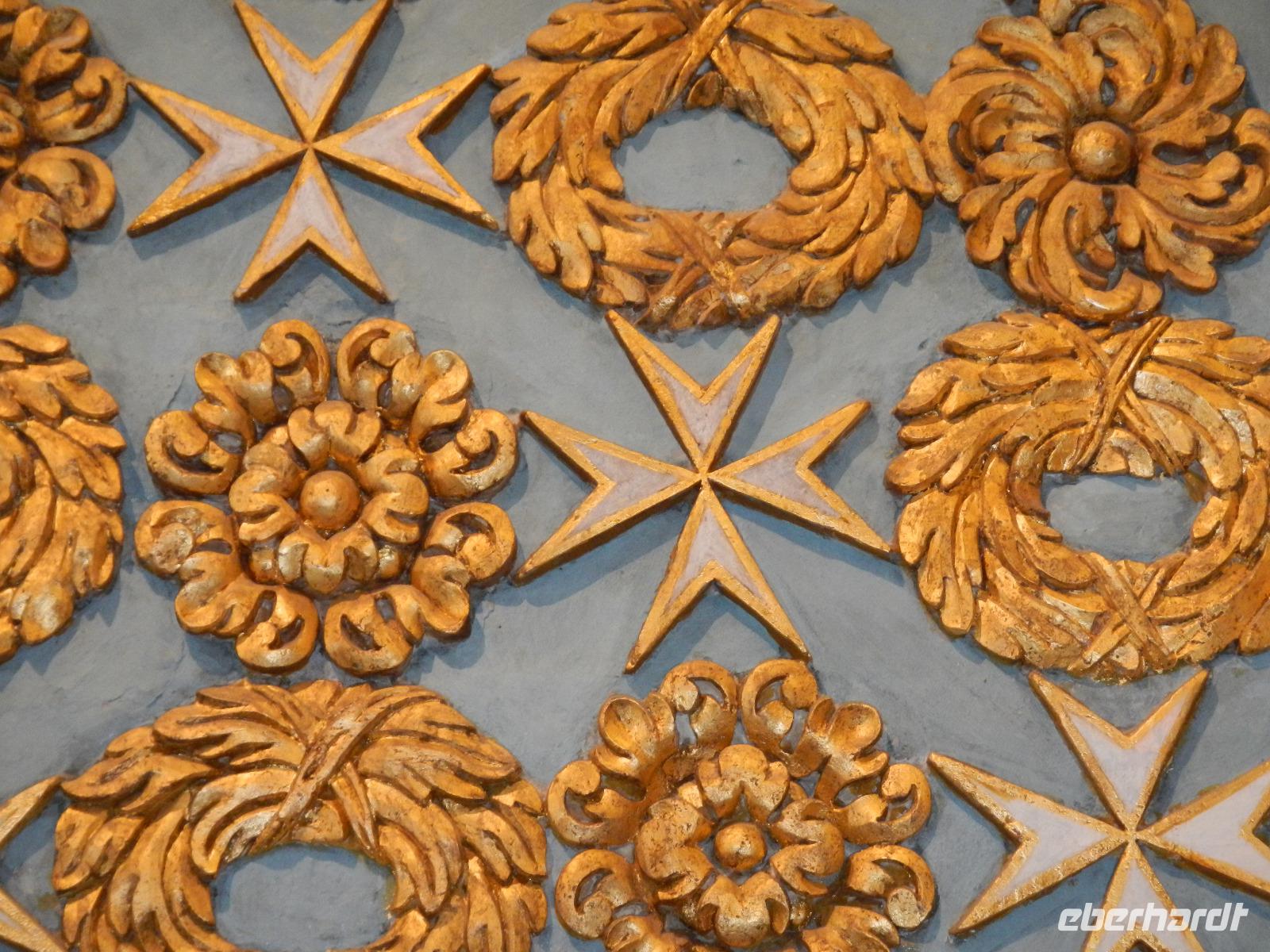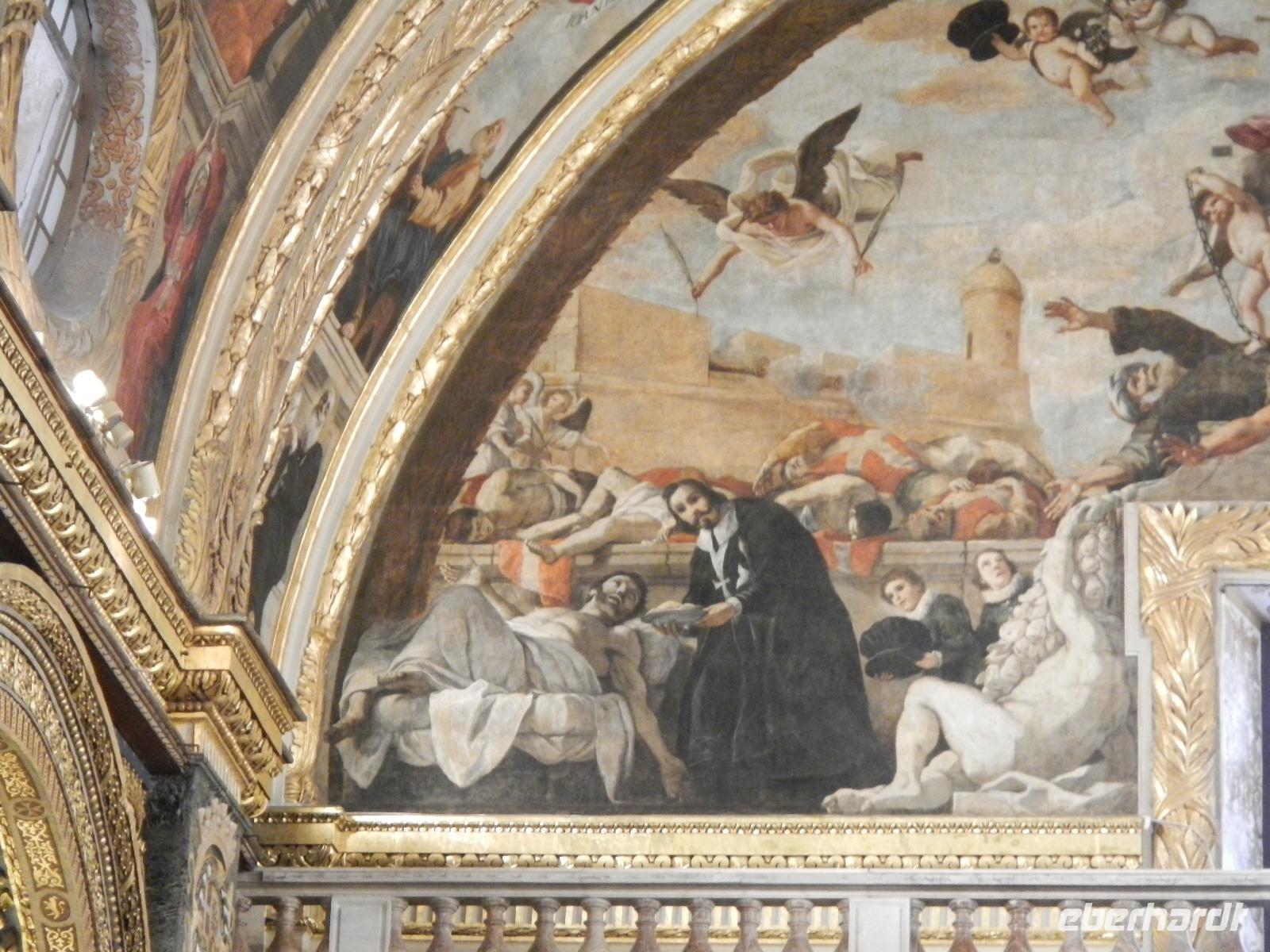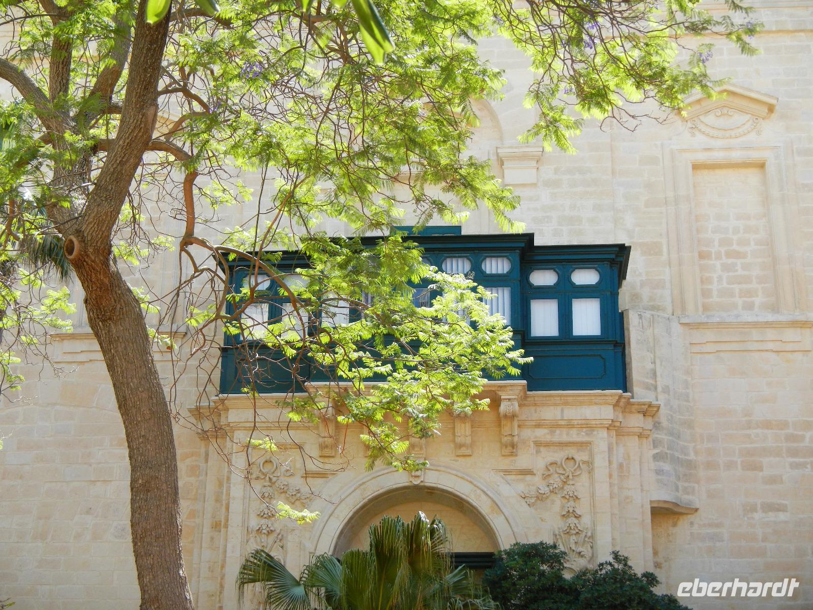 Wir spazieren weiter durch Valletta und gelangen bald vor das Hauptportal der von außen eher schlicht wirkenden St.John's Co-Cathedral (Johanneskathedrale). Sie ist die Konventskirche der Johanniter und ist im Inneren sehr prächtig verziert mit vergoldeten Reliefs an Wänden und Pfeilern, dem Boden bedecken Marmorintarsien und aufwendig gearbeitete Deckenmalereien.