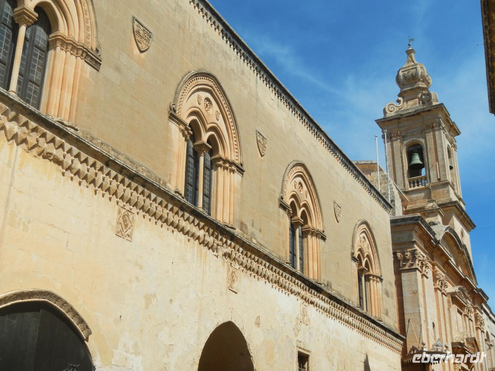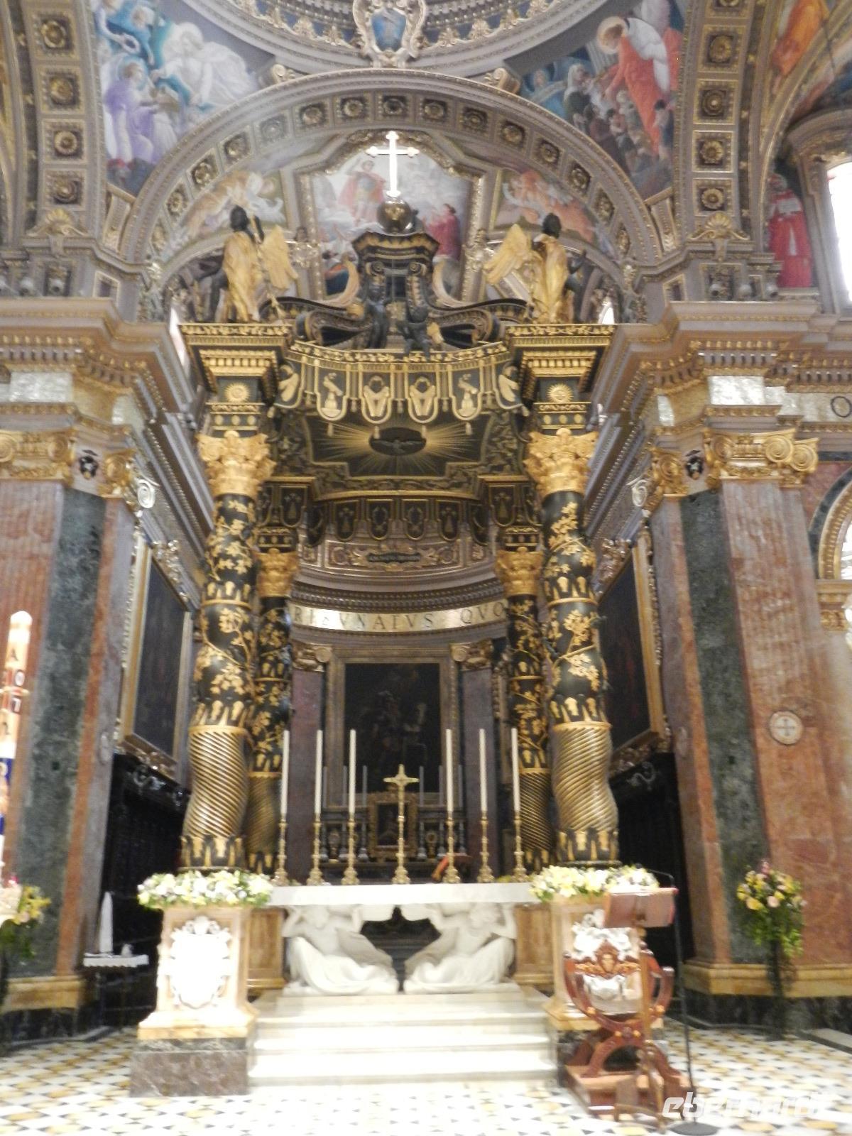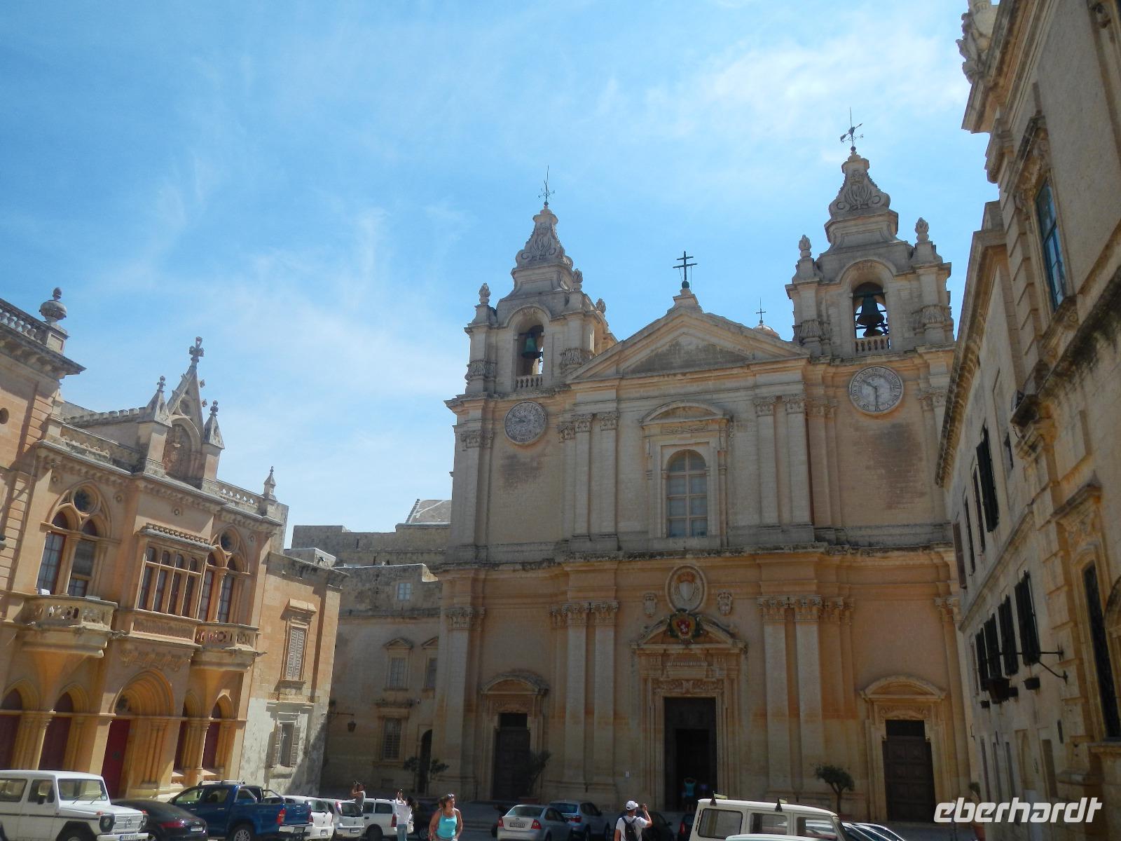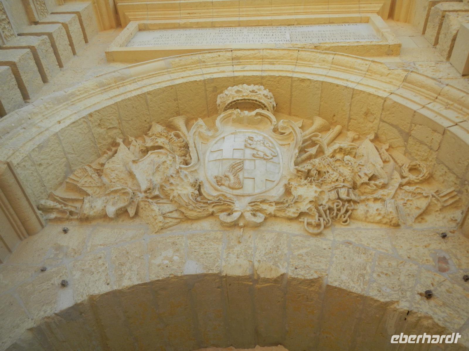 Wir spazieren weiter durch Valletta und gelangen bald vor das Hauptportal der von außen eher schlicht wirkenden St.John's Co-Cathedral (Johanneskathedrale). Sie ist die Konventskirche der Johanniter und ist im Inneren sehr prächtig verziert mit vergoldeten Reliefs an Wänden und Pfeilern, dem Boden bedecken Marmorintarsien und aufwendig gearbeitete Deckenmalereien.