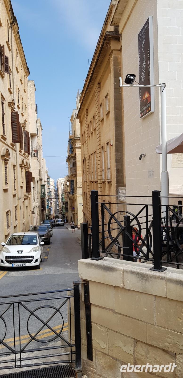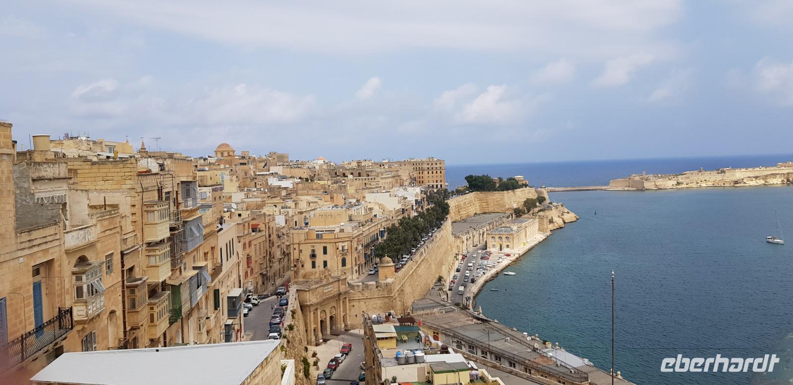 getroffen. Wir treffen uns am frühen Morgen auf dem Flughafen in Dresden. Wir sind schon eingecheckt. So müssen wir nur noch das Gepäck aufgeben und dann kann es schon losgehen. Pünktlich 6.15 Uhr erheben wir uns in die Lüfte in Richtung Frankfurt. Dort treffen wir die Gäste, die von Leipzig und Berlin geflogen sind. Dann geht es alle zusammen mit Lufthansa weiter nach Valletta auf Malta. Gegen 12.00 Uhr landen wir auf der Mittelmeerinsel. Sommerlich warme und ziemlich feuchte Luft kommt uns beim Aussteigen entgegen. Hier werden wir die ersten Tage unserer Reise verbringen bevor es am Sonntag auf Mein Schiff 6 geht.Paula von unserem Partnerbüro auf Malta empfängt uns sehr herzlich. Sie hat Gerlinde, die uns Malta zeigen wird und den Bus für den heutigen Tag mitgebracht. So können wir gleich zu unserer Stadtbesichtigung in Valletta starten.