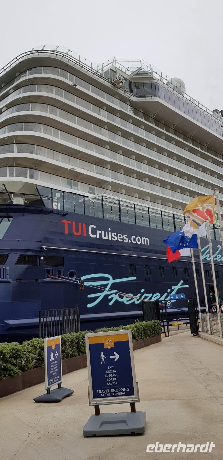 Heute wird es spannend - wir schiffen uns auf Mein Schiff 6 ein! Alle sind schon ein wenig aufgeregt. Nach dem Frühstück im Hotel Salini Resort packen wir noch die letzten Sachen in die Koffer und dann geht es kurz vor 11.00 Uhr mit dem Bus zum Hafen. Paula begleitet uns bis zum Einchecken. Wir verabschieden uns. Nach dem Einchecken geht es durch die Sicherheitskontrolle und dann können wir schon aufs Schiff. Die Kabinen sind erst gegen 15.00 Uhr empfangsbereit, wir können aber schon das Schiff erkunden und uns auch stärken. Die Restaurants Anckelsmannplatz und Backstube haben geöffnet.