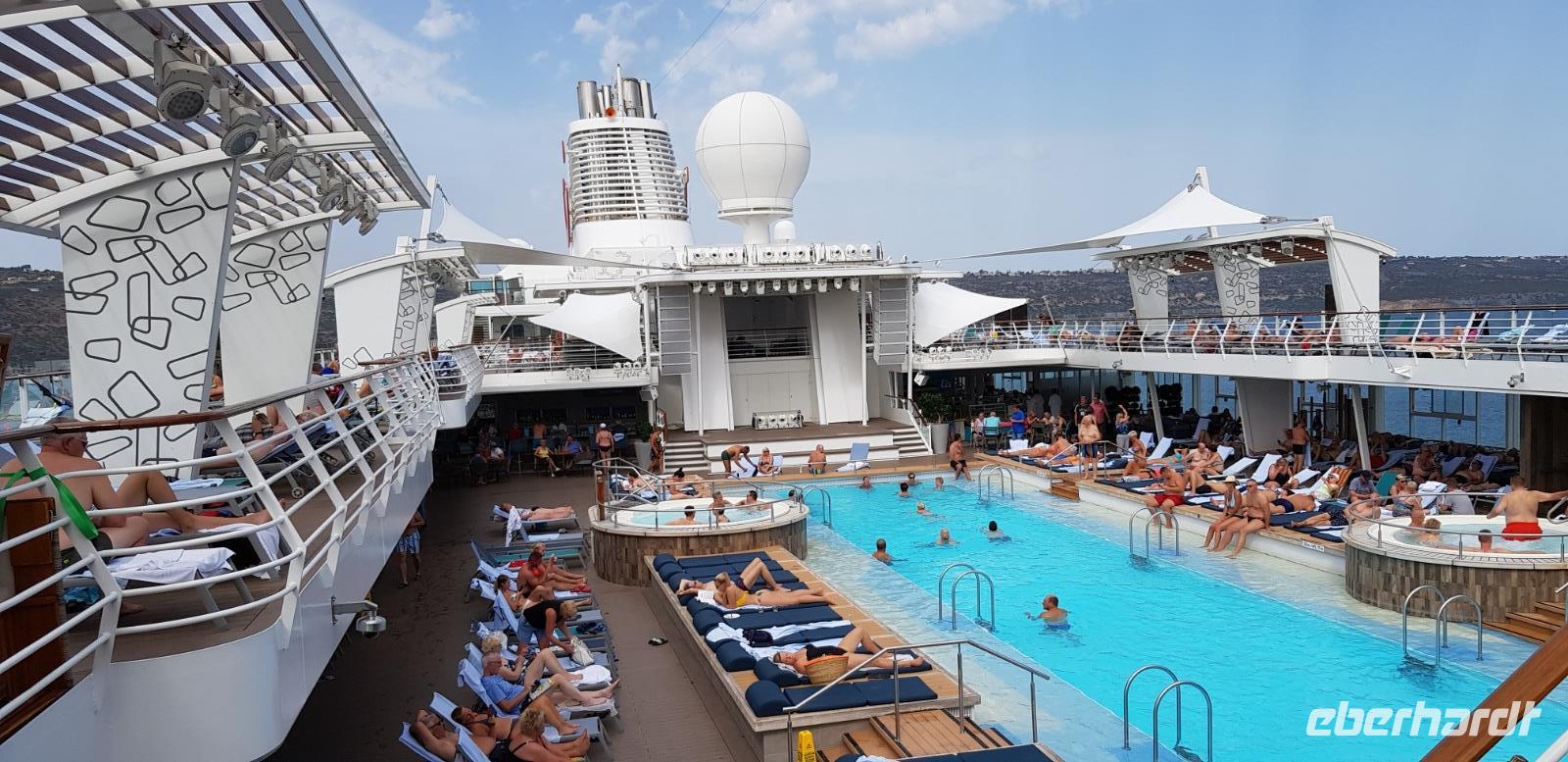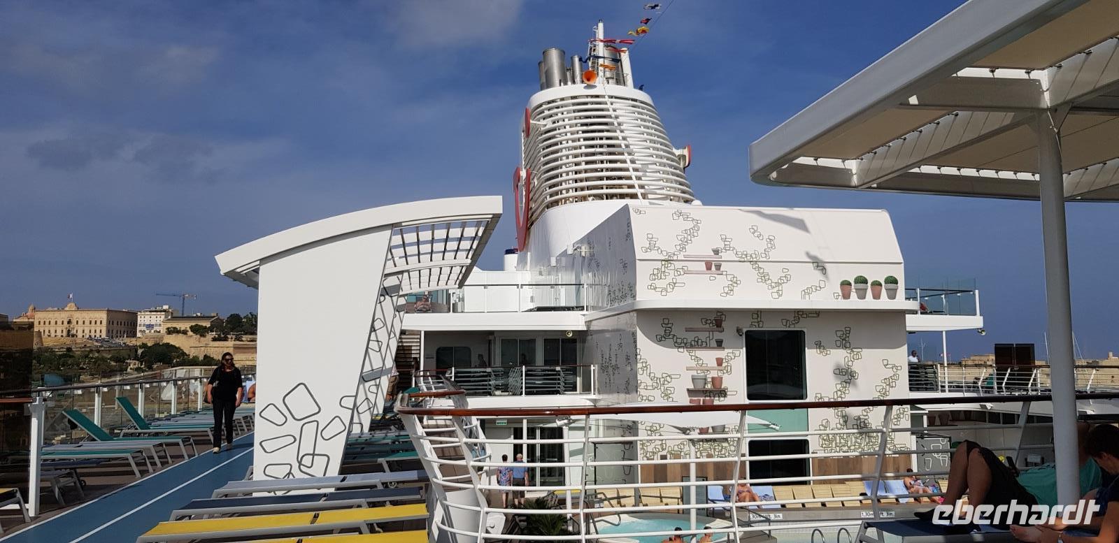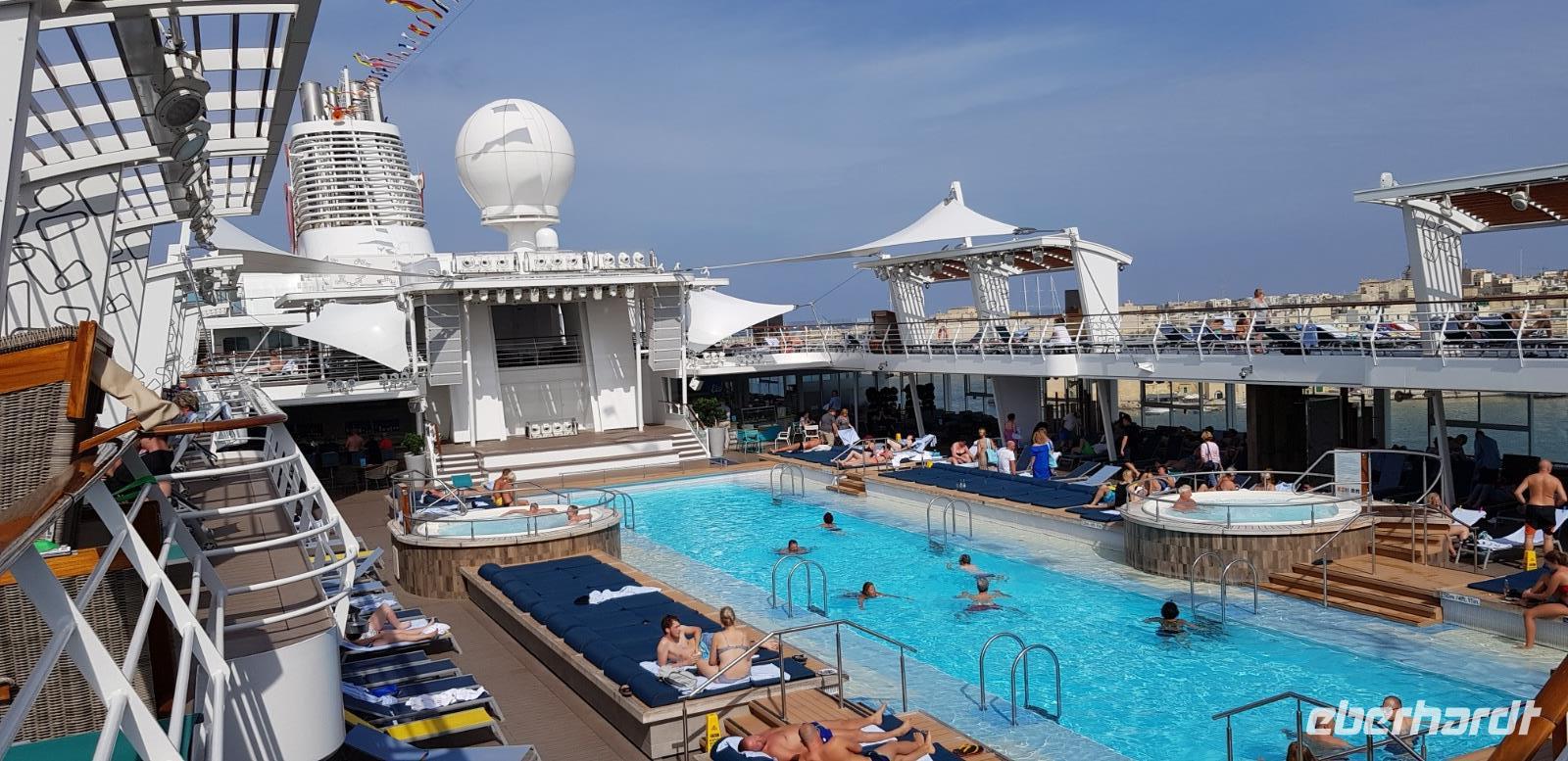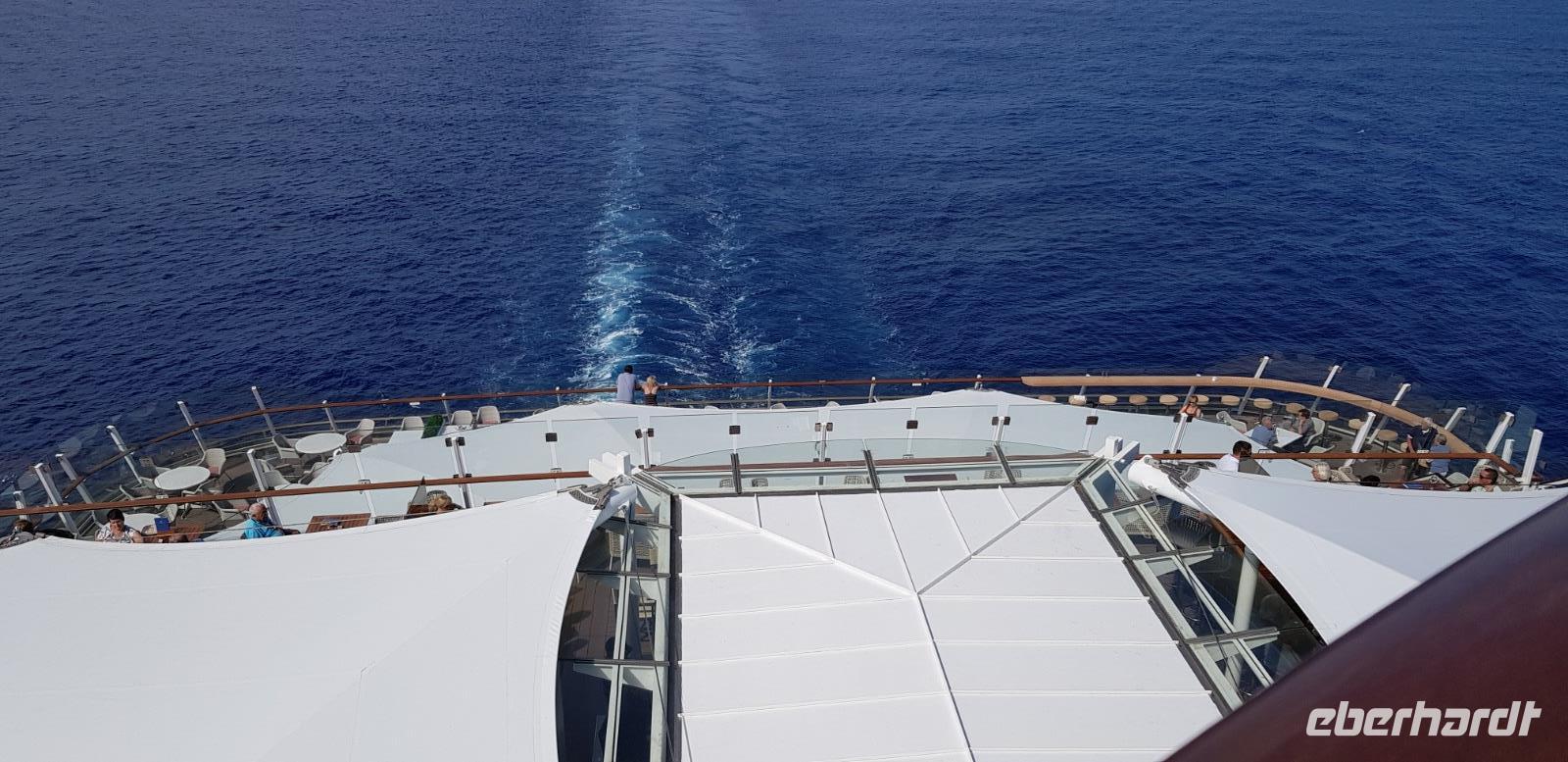 Für 10.30 Uhr haben wir uns in der LUMAS Bar auf Deck 4 verabredet. Zur Begrüßung gibt es ein Glas Sekt und dann starten wir unseren Schiffsrundgang mit Amelie vom Serviceteam des Schiffs. Sie stellt uns das Schiff vor und zeigt uns fast alle „Ecken und Winkel" der Mein Schiff 6. So finden wir dann die wichtigsten Servicepunkte, die schönsten Restaurants und Bars und die besten Aussichtspunkte auf dem Schiff ganz schnell wieder. Nach dem Rundgang ist es schon fast Mittag. Ob im Restaurant mit Bedienung oder in Selbstbedienung - die Auswahl ist groß. Für den Nachmittag haben wir kein Programm geplant. Jeder verbringt ihn so wie er möchte, einfach mal faul auf Deck in der Sonne liegen, eine Runde im Pool schwimmen, in einer der Bars einen Kaffee trinken oder einen Drink nehmen oder einfach auf dem Balkon der Kabine sitzen und den Blick auf das Meer genießen.