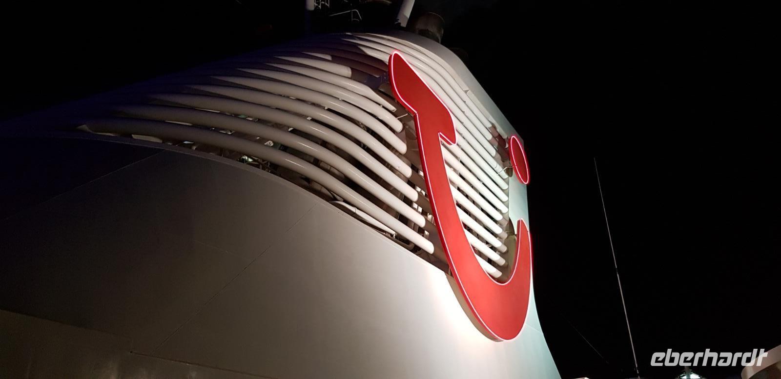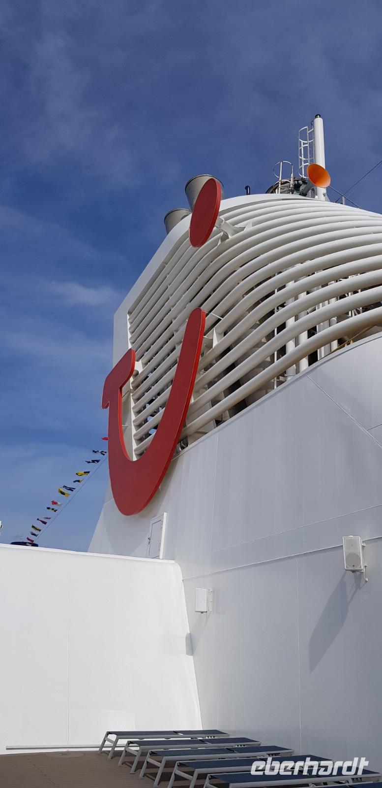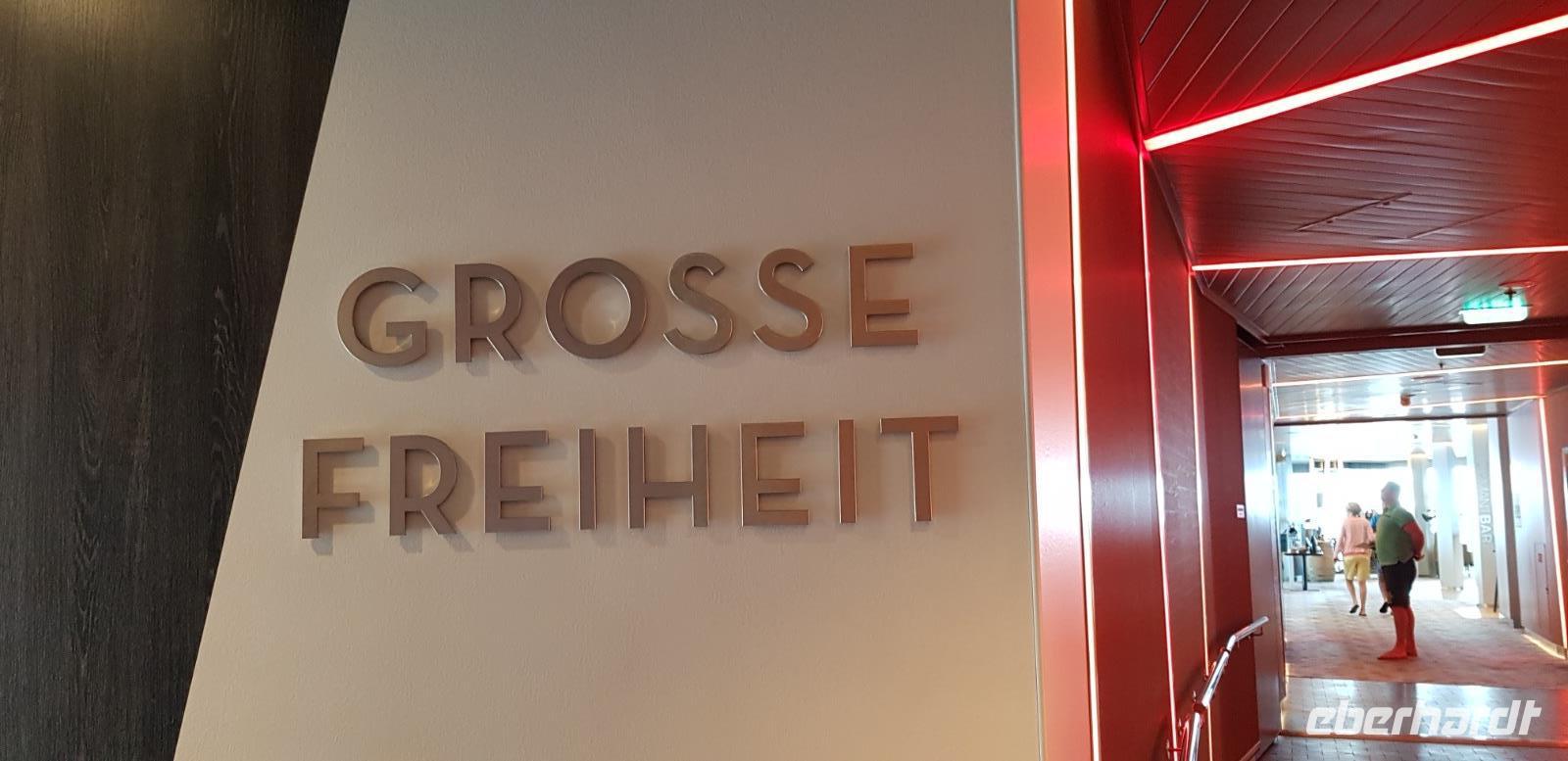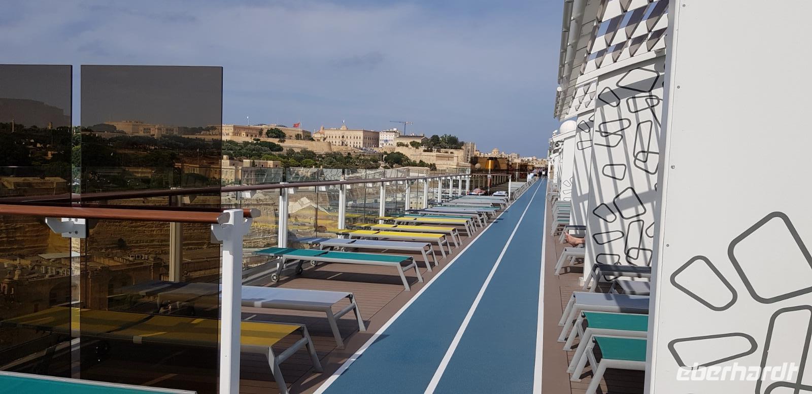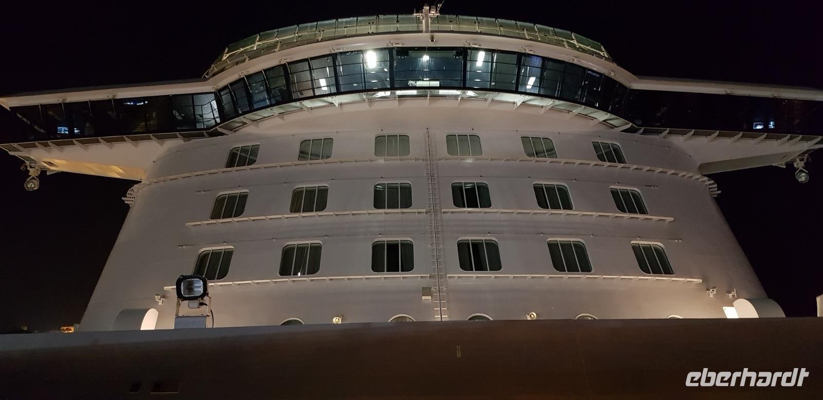 Für 10.30 Uhr haben wir uns in der LUMAS Bar auf Deck 4 verabredet. Zur Begrüßung gibt es ein Glas Sekt und dann starten wir unseren Schiffsrundgang mit Amelie vom Serviceteam des Schiffs. Sie stellt uns das Schiff vor und zeigt uns fast alle „Ecken und Winkel" der Mein Schiff 6. So finden wir dann die wichtigsten Servicepunkte, die schönsten Restaurants und Bars und die besten Aussichtspunkte auf dem Schiff ganz schnell wieder. Nach dem Rundgang ist es schon fast Mittag. Ob im Restaurant mit Bedienung oder in Selbstbedienung - die Auswahl ist groß. Für den Nachmittag haben wir kein Programm geplant. Jeder verbringt ihn so wie er möchte, einfach mal faul auf Deck in der Sonne liegen, eine Runde im Pool schwimmen, in einer der Bars einen Kaffee trinken oder einen Drink nehmen oder einfach auf dem Balkon der Kabine sitzen und den Blick auf das Meer genießen.