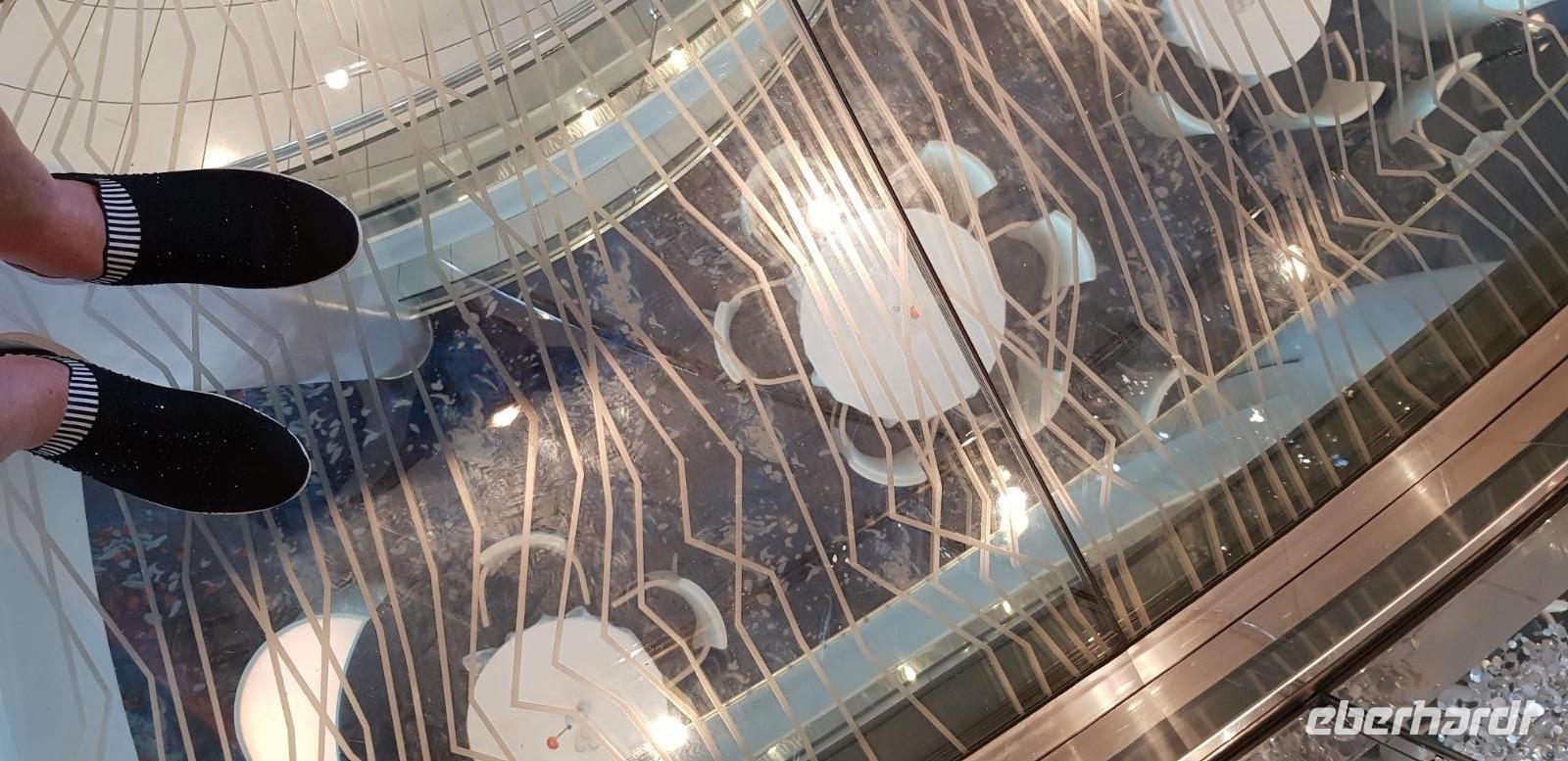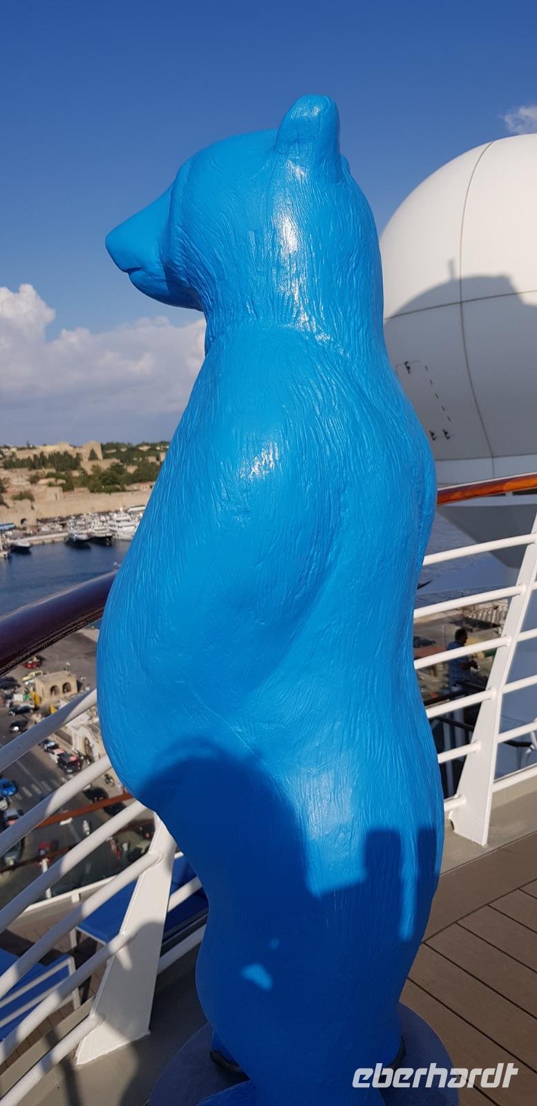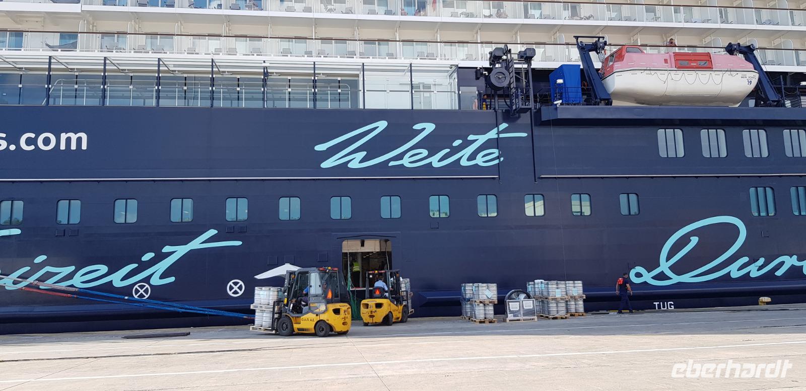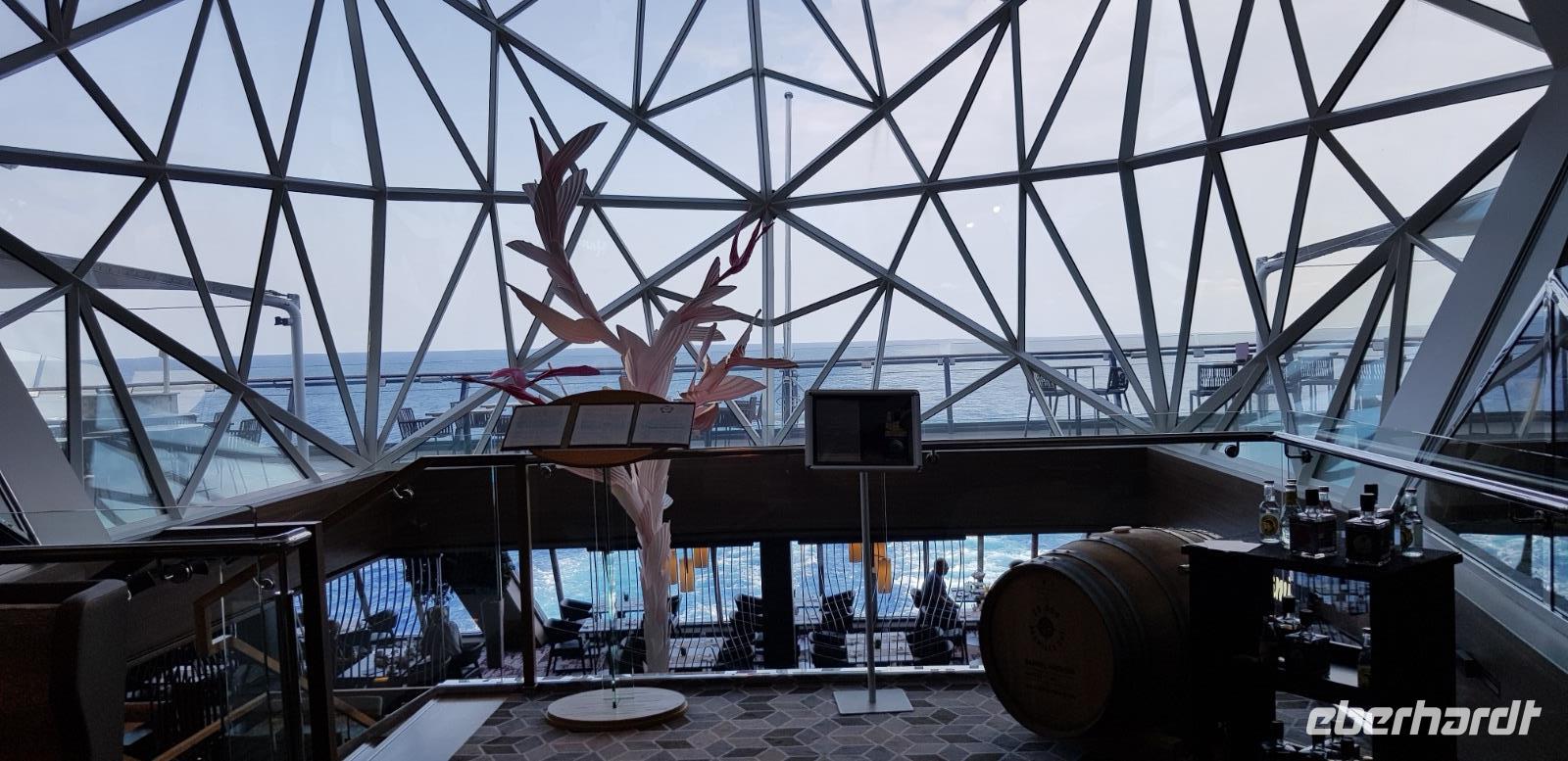 Für 10.30 Uhr haben wir uns in der LUMAS Bar auf Deck 4 verabredet. Zur Begrüßung gibt es ein Glas Sekt und dann starten wir unseren Schiffsrundgang mit Amelie vom Serviceteam des Schiffs. Sie stellt uns das Schiff vor und zeigt uns fast alle „Ecken und Winkel" der Mein Schiff 6. So finden wir dann die wichtigsten Servicepunkte, die schönsten Restaurants und Bars und die besten Aussichtspunkte auf dem Schiff ganz schnell wieder. Nach dem Rundgang ist es schon fast Mittag. Ob im Restaurant mit Bedienung oder in Selbstbedienung - die Auswahl ist groß. Für den Nachmittag haben wir kein Programm geplant. Jeder verbringt ihn so wie er möchte, einfach mal faul auf Deck in der Sonne liegen, eine Runde im Pool schwimmen, in einer der Bars einen Kaffee trinken oder einen Drink nehmen oder einfach auf dem Balkon der Kabine sitzen und den Blick auf das Meer genießen.