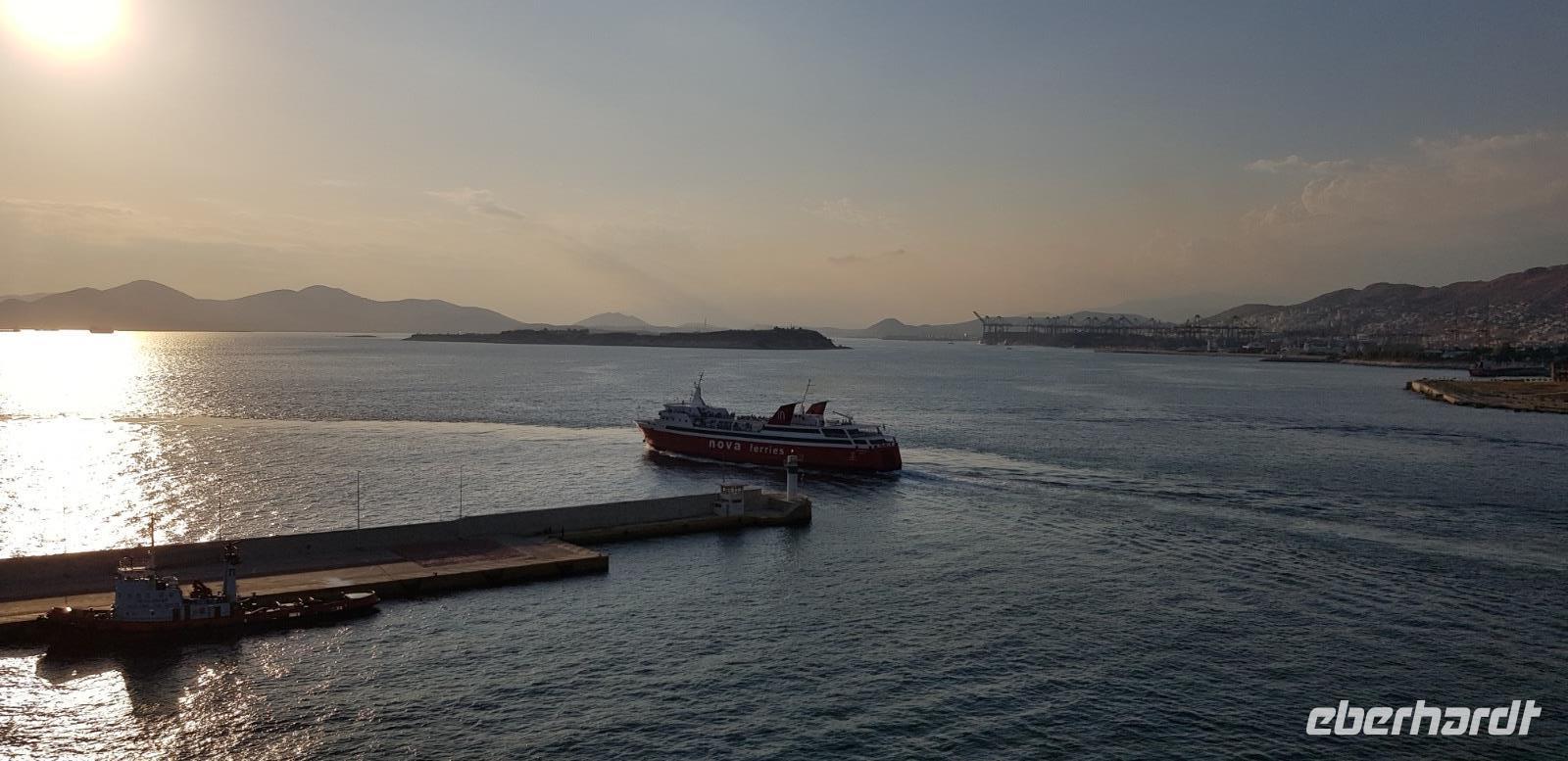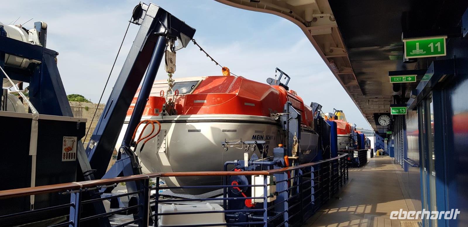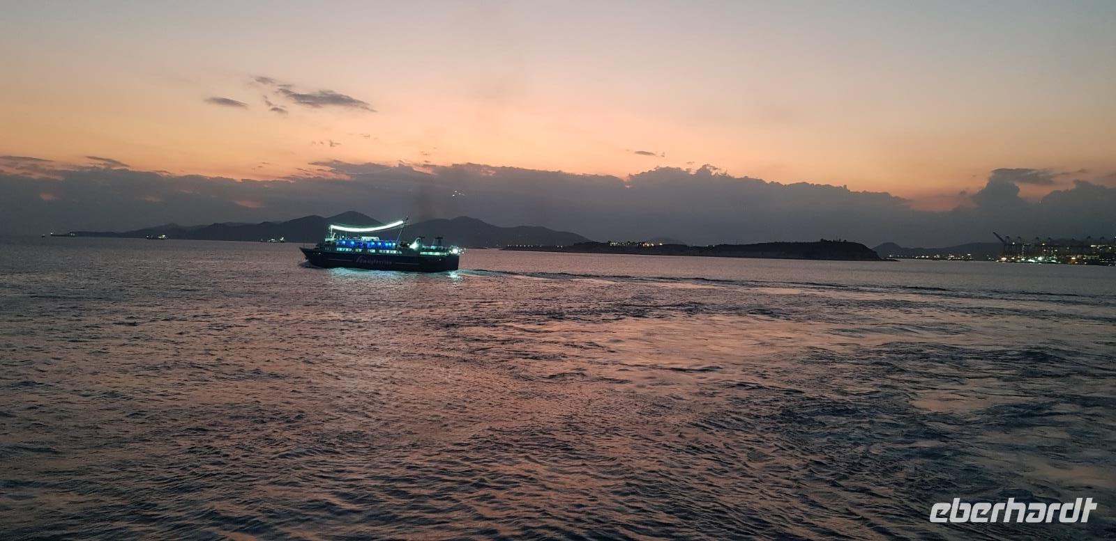 Nach dem Abendessen findet um 21.15 Uhr die Sicherheitsübung für alle neu angekommenen Gäste statt. Und um 22.00Uhr laufen wir aus. Das erste Mal ist immer sehr spannend und beeindruckend. Wir beobachten das Spektakel vom obersten Deck aus. Nun geht es auf große Fahrt über das Mittelmeer nach Griechenland! Und noch etwas ist ganz wichtig - heute Nacht werden die Uhren an Bord um eine Stunde vorgestellt!
